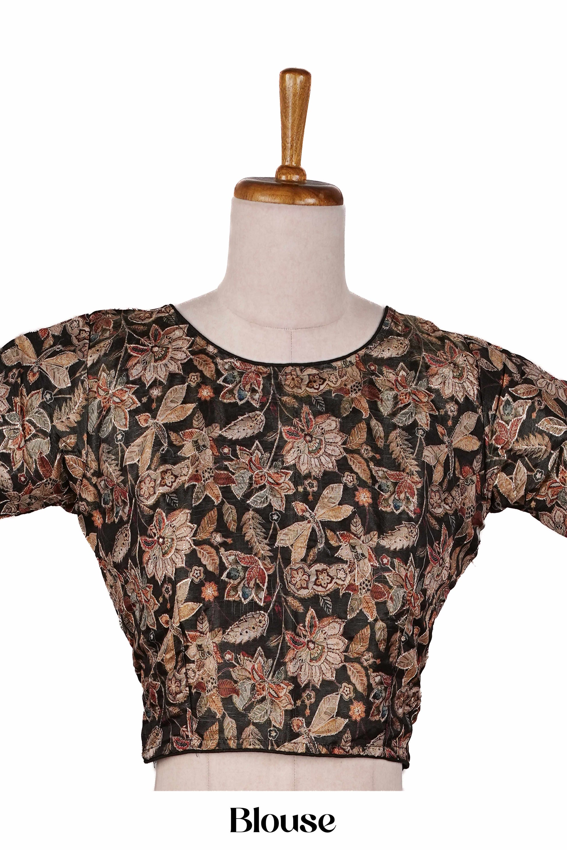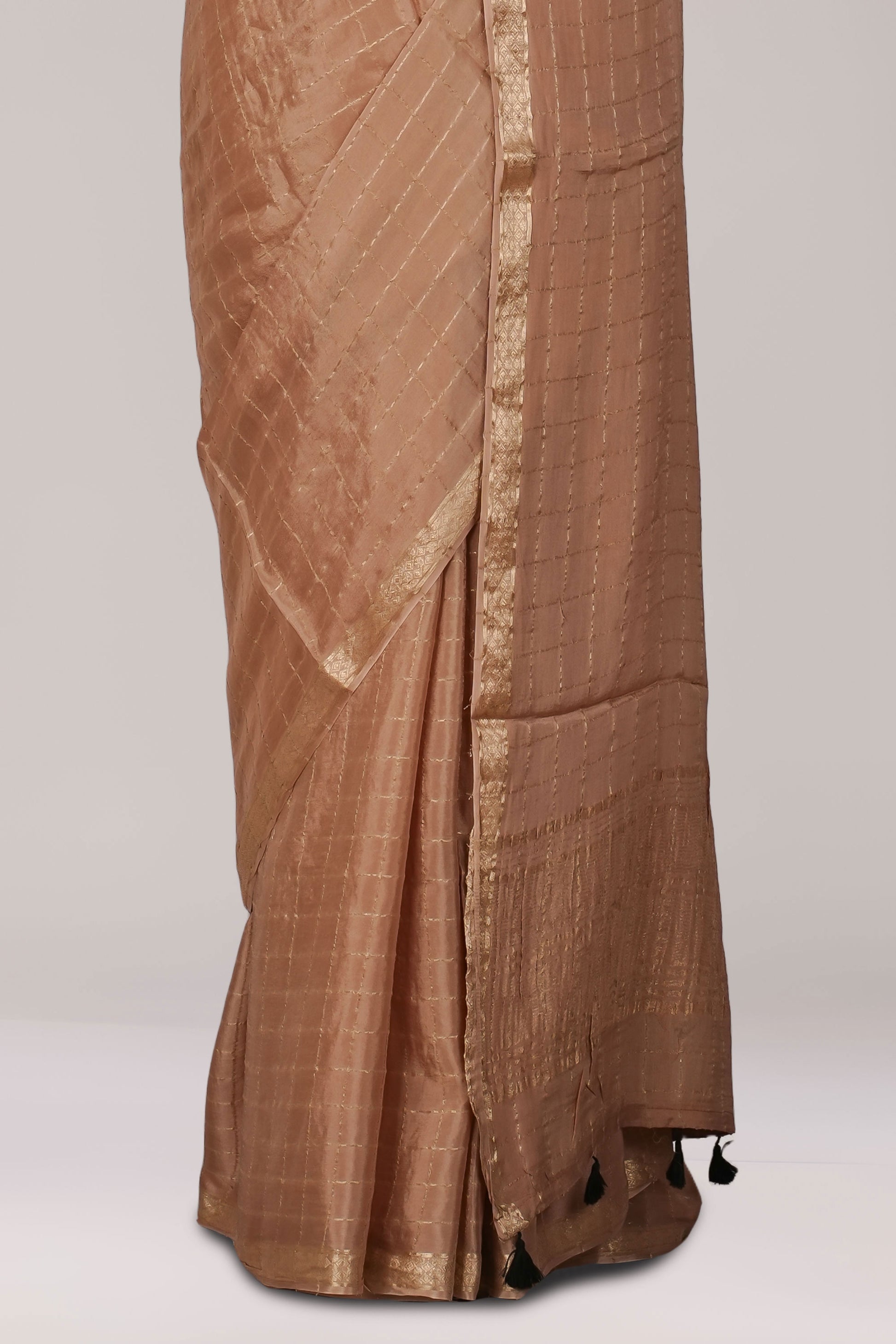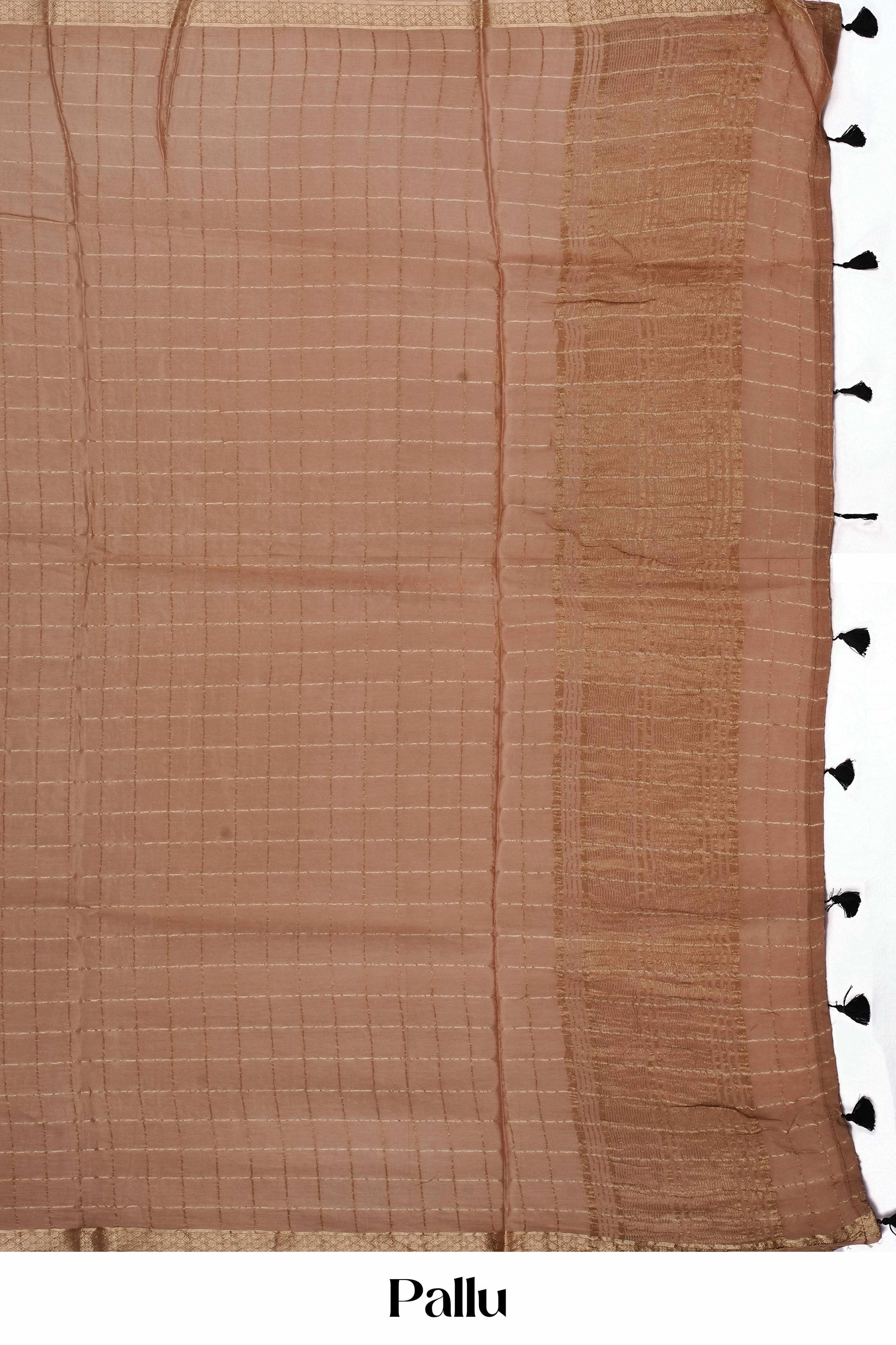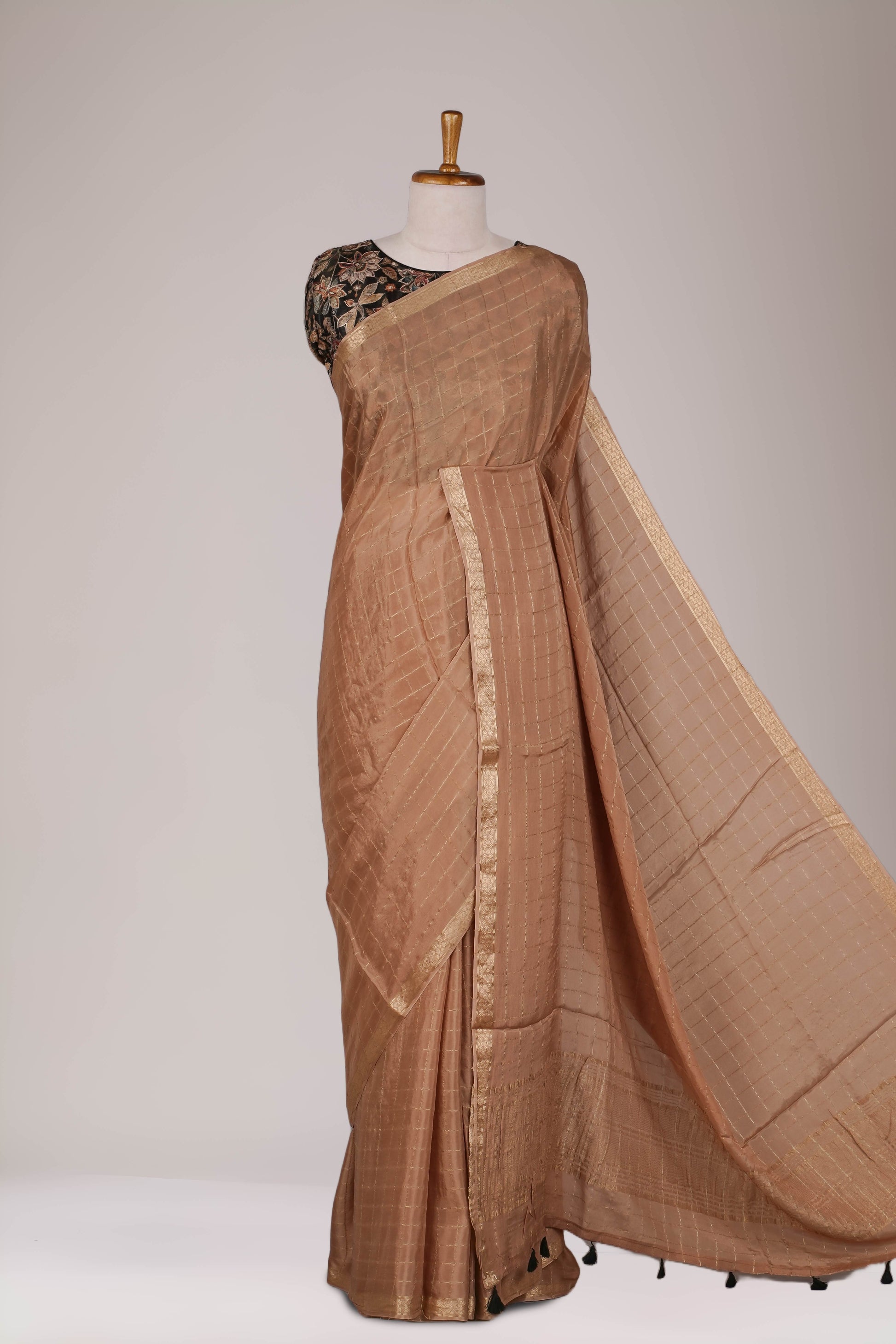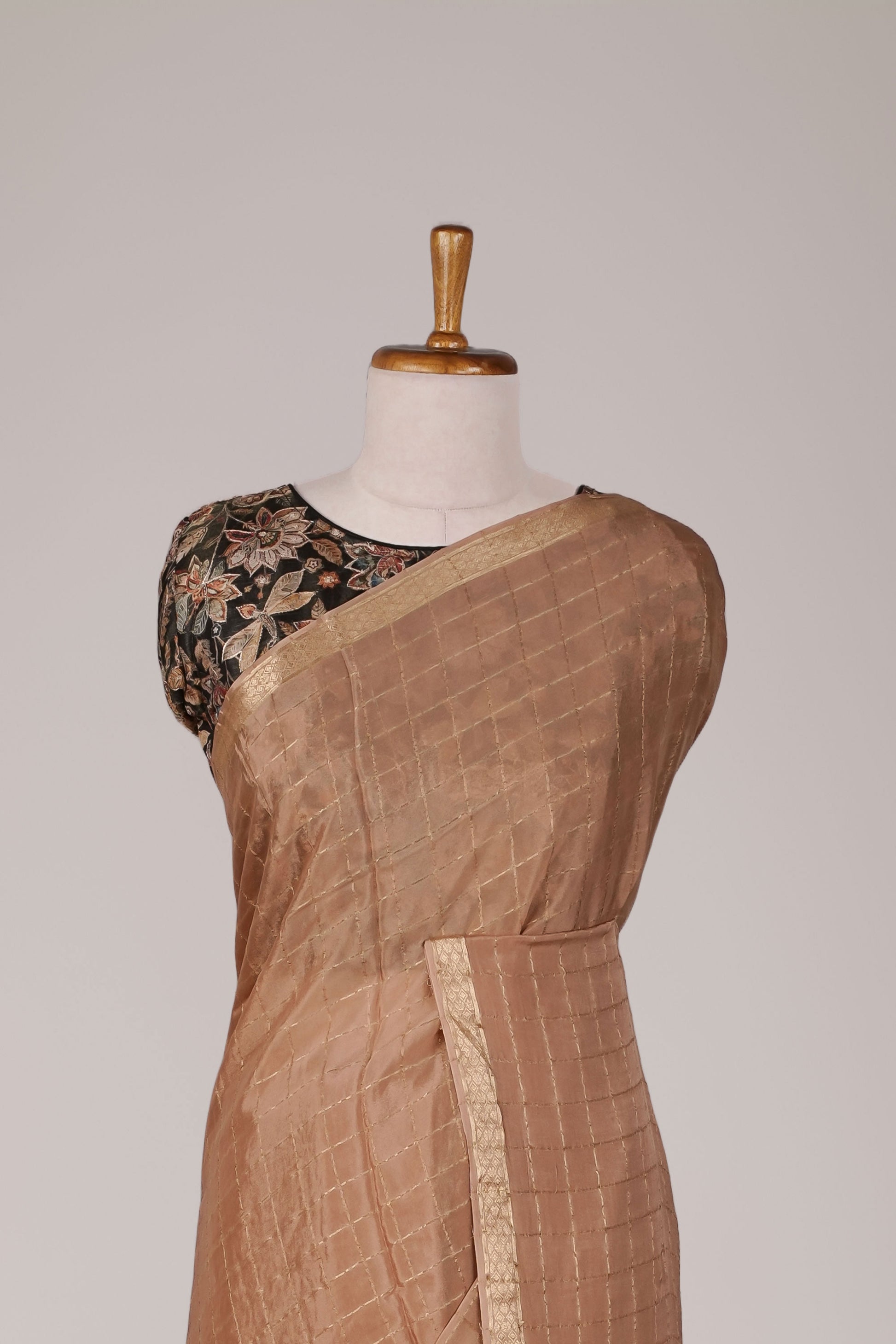 Satin Crepe Golden Zari Checked With Readymade Blouse