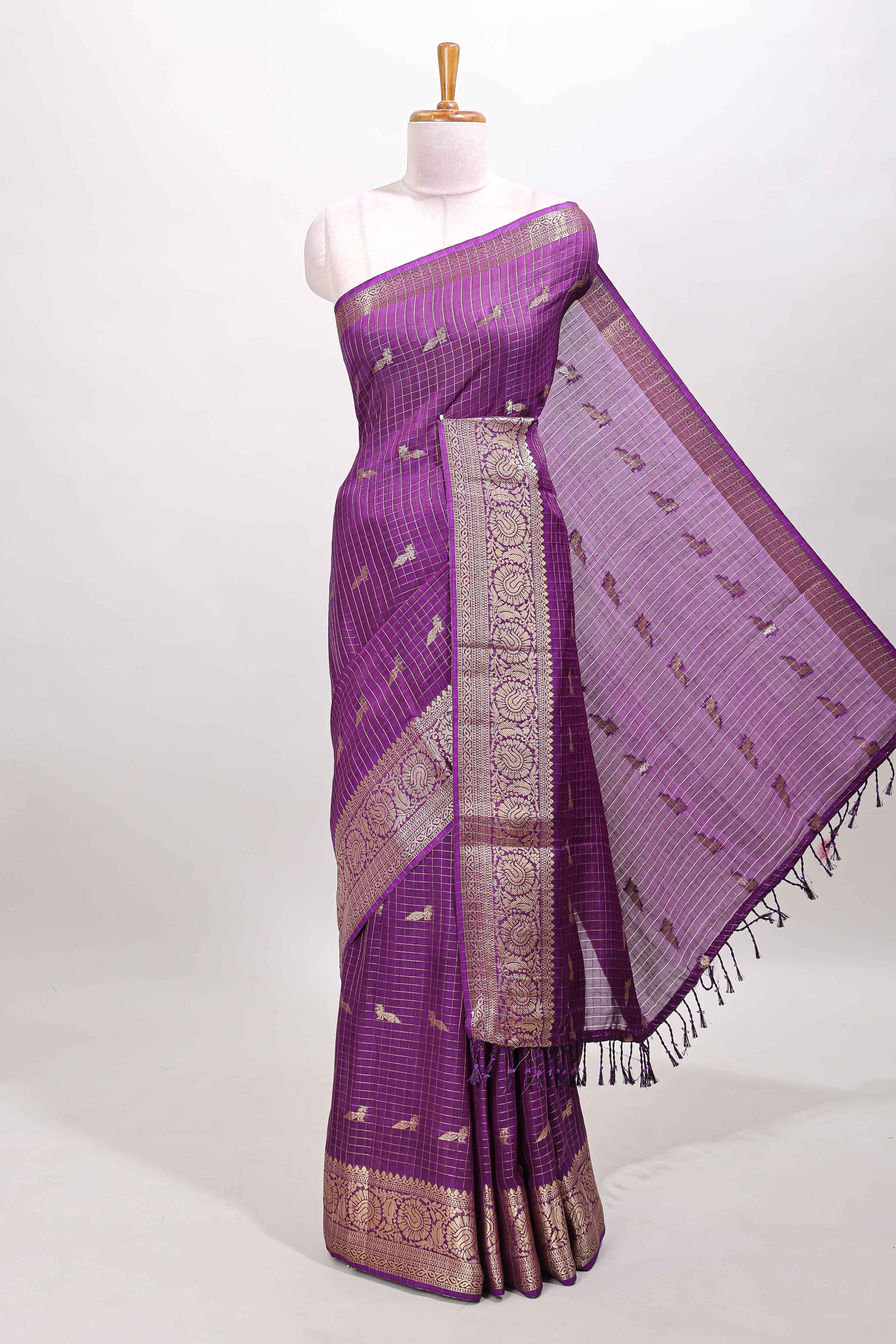 Purple checks zari butta art raw silk saree with self zari border and pallu
