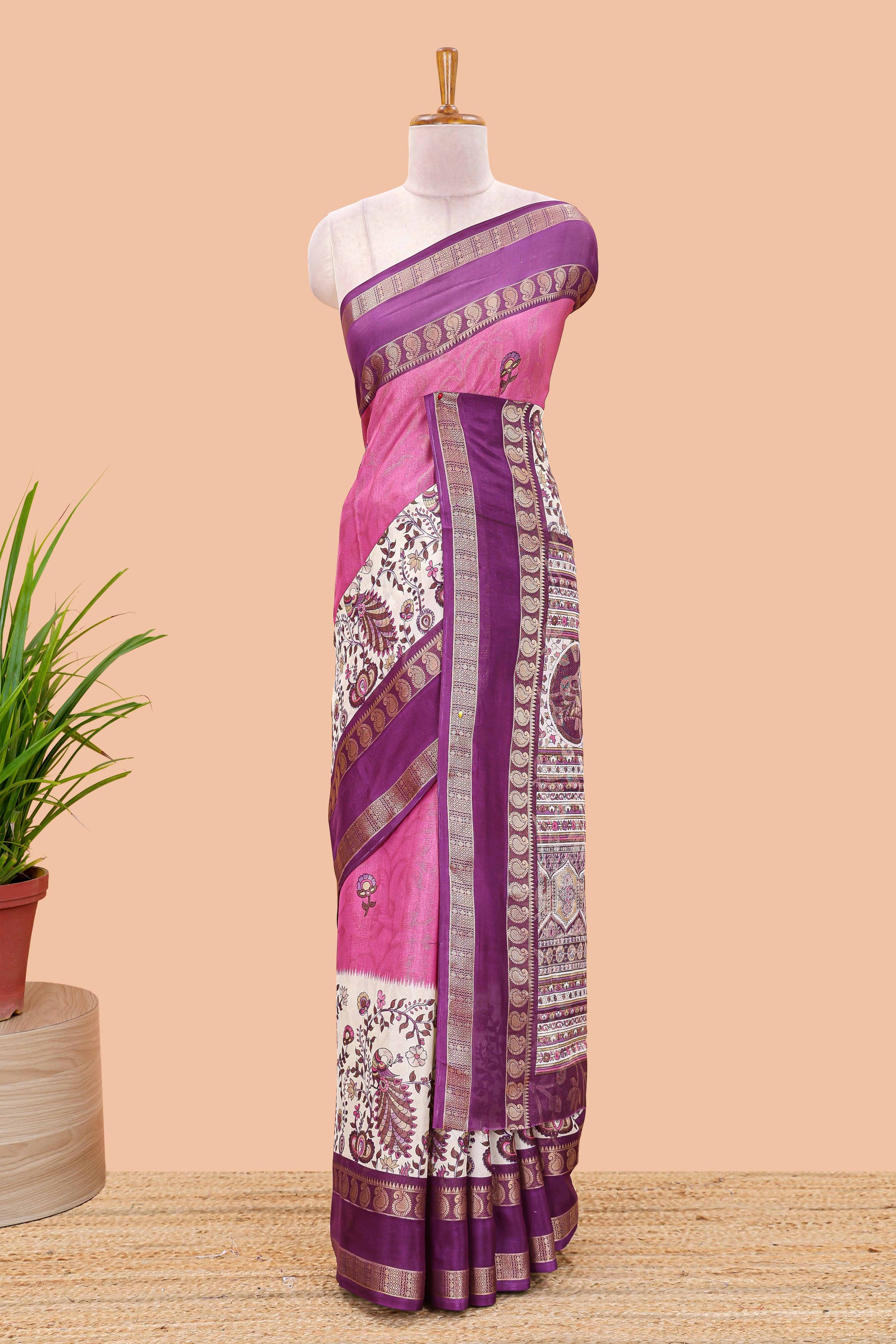 Purple dola silk floral motifs saree with kalamkari inspired pallu and peacock zari border