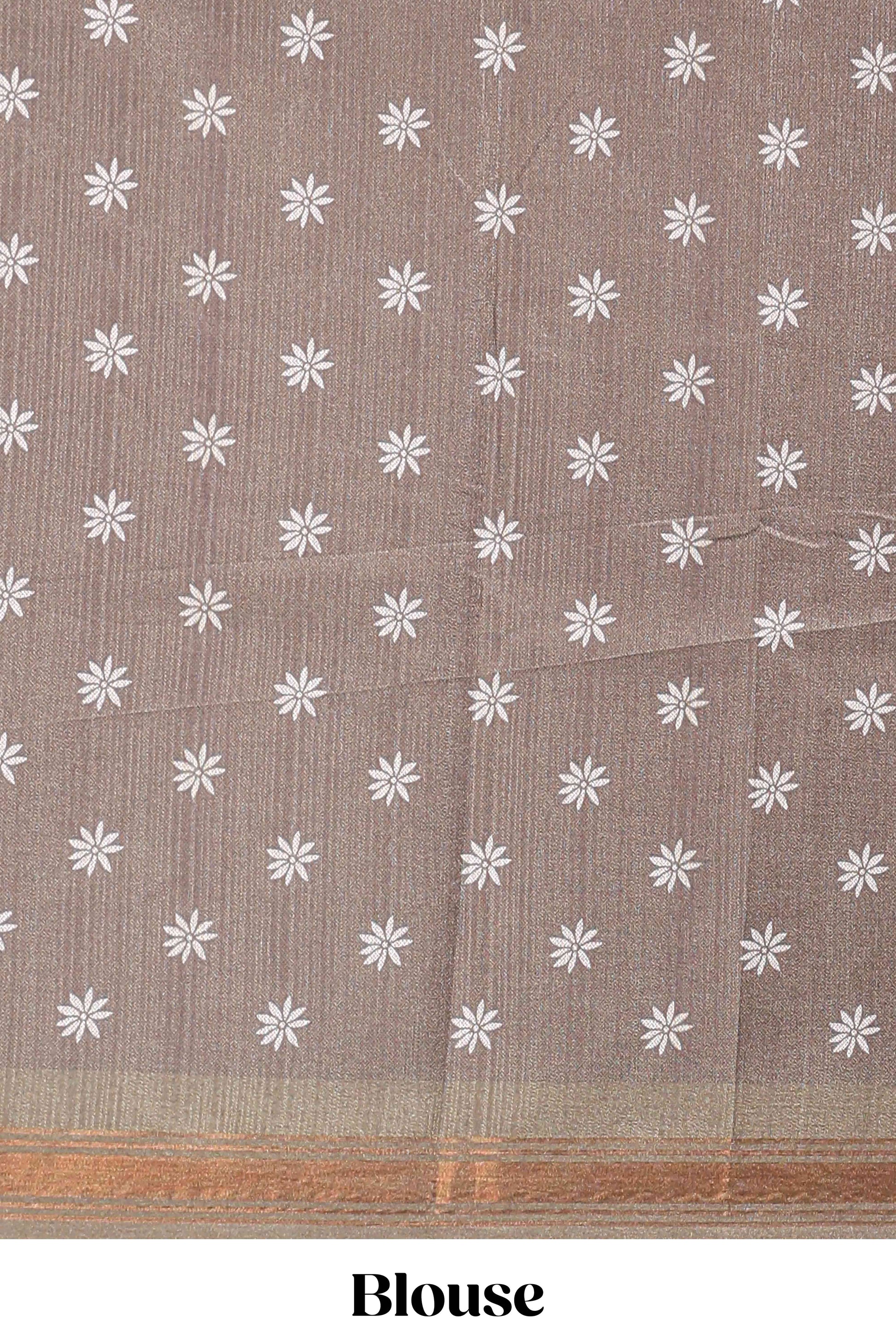 Purple leaf print semi tussar saree with contrast border and geometric pallu