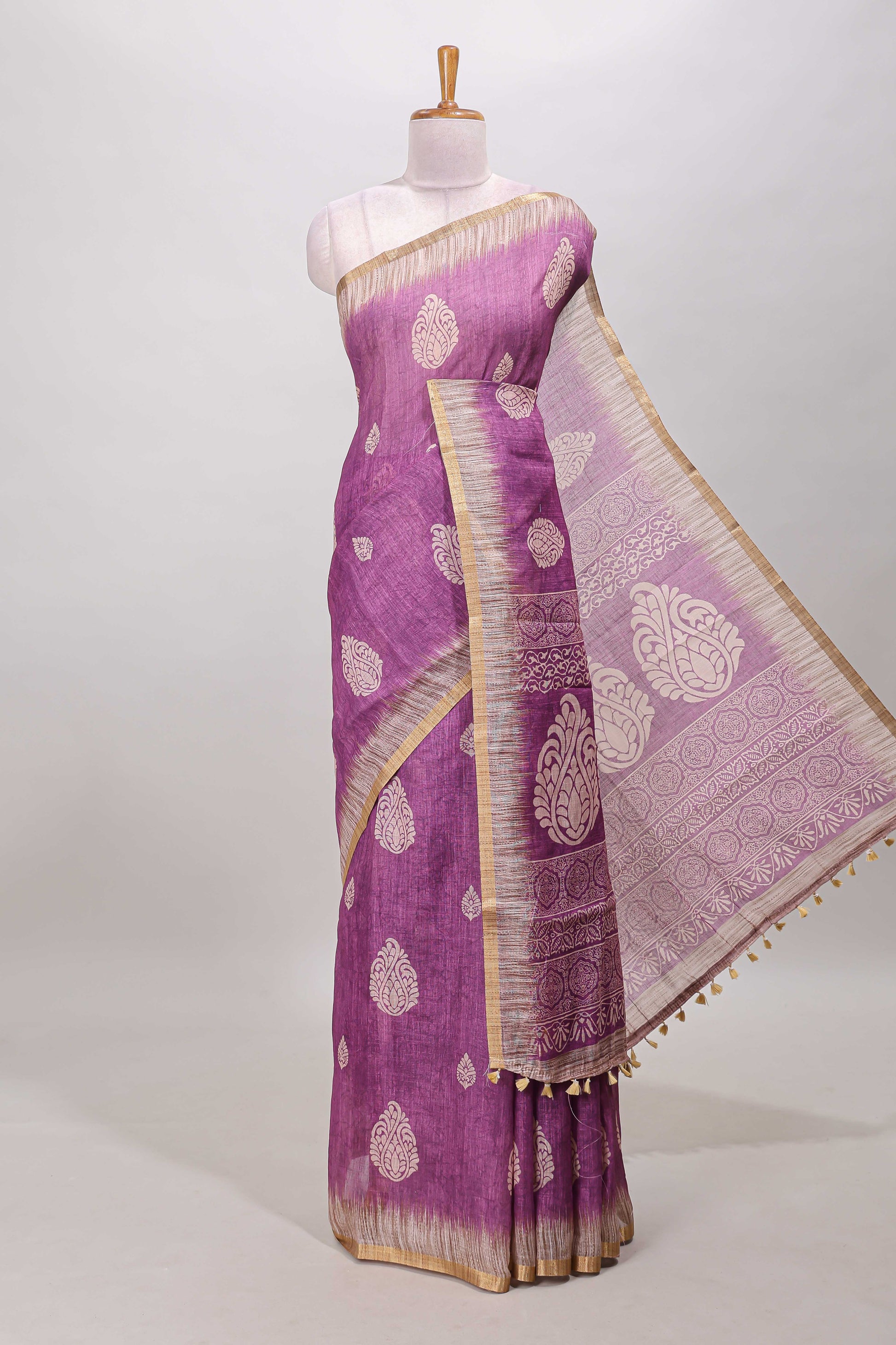 Purple paisley motifs linen cotton saree with self zari border and matching blouse