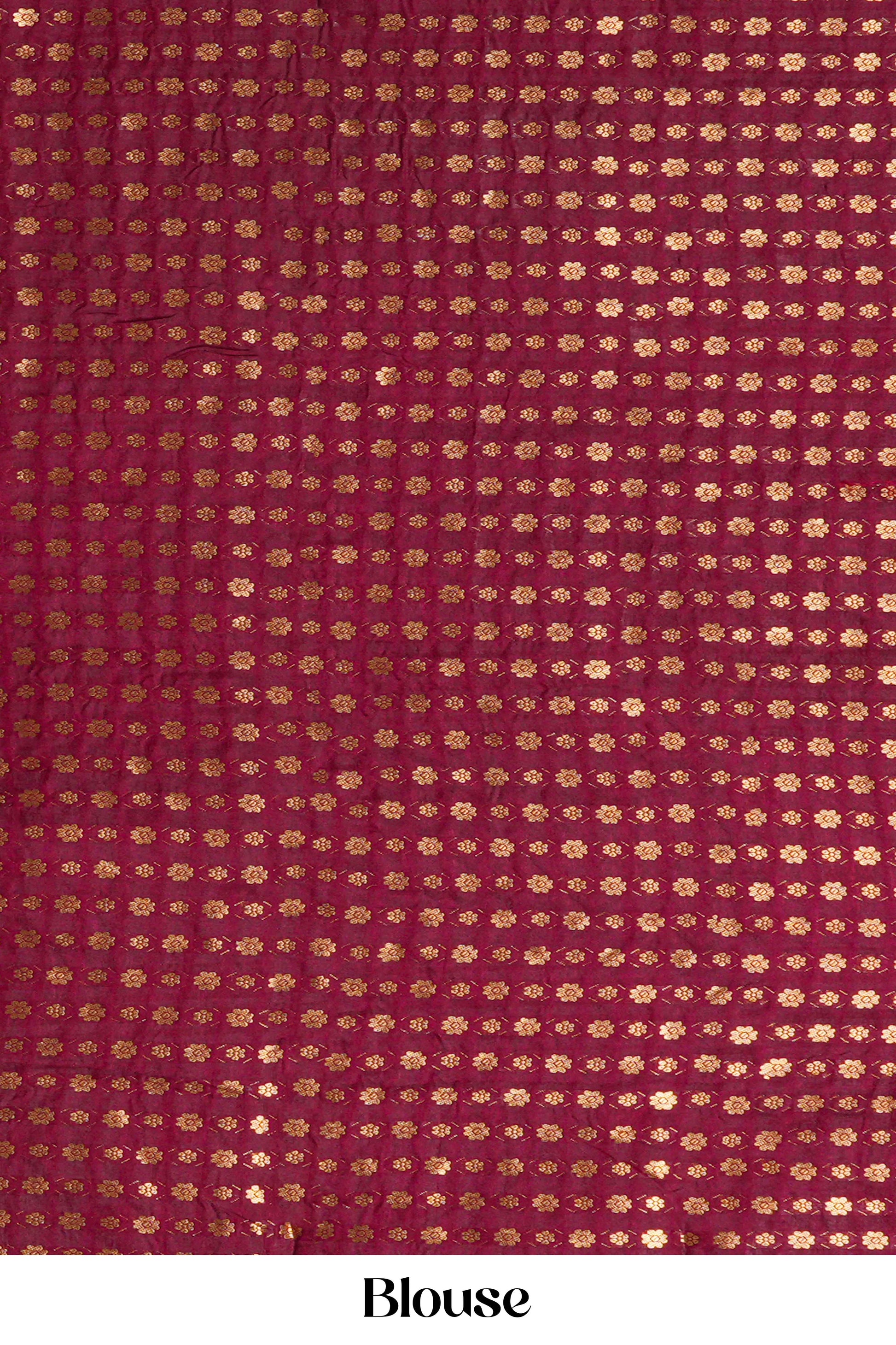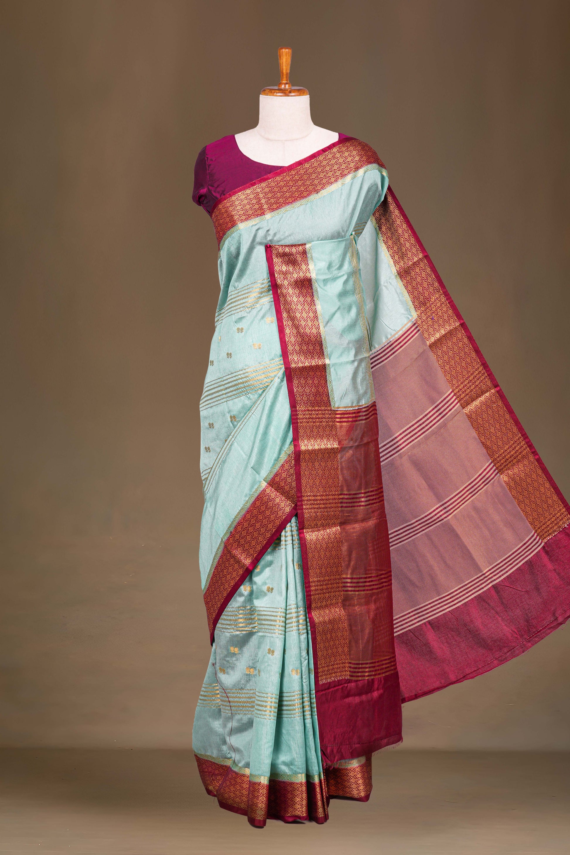 Raw Silk Saree With Small Golden Zari Butta & Horizontal Zari lines Than Contrast Border & Pallu Intricately Woven With Golden Zari Motifs In Traditional Pattern. Along With Butta Design Blouse