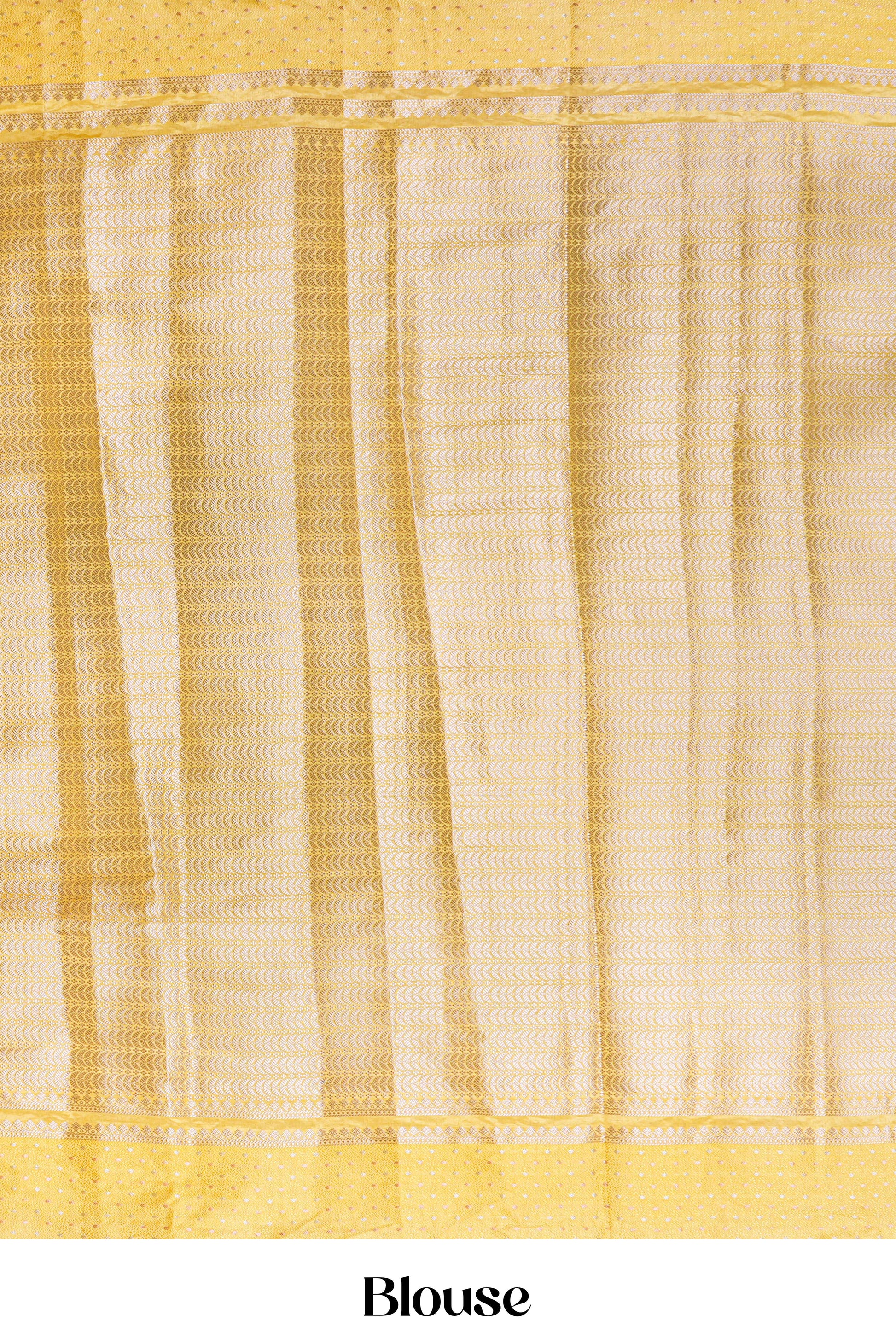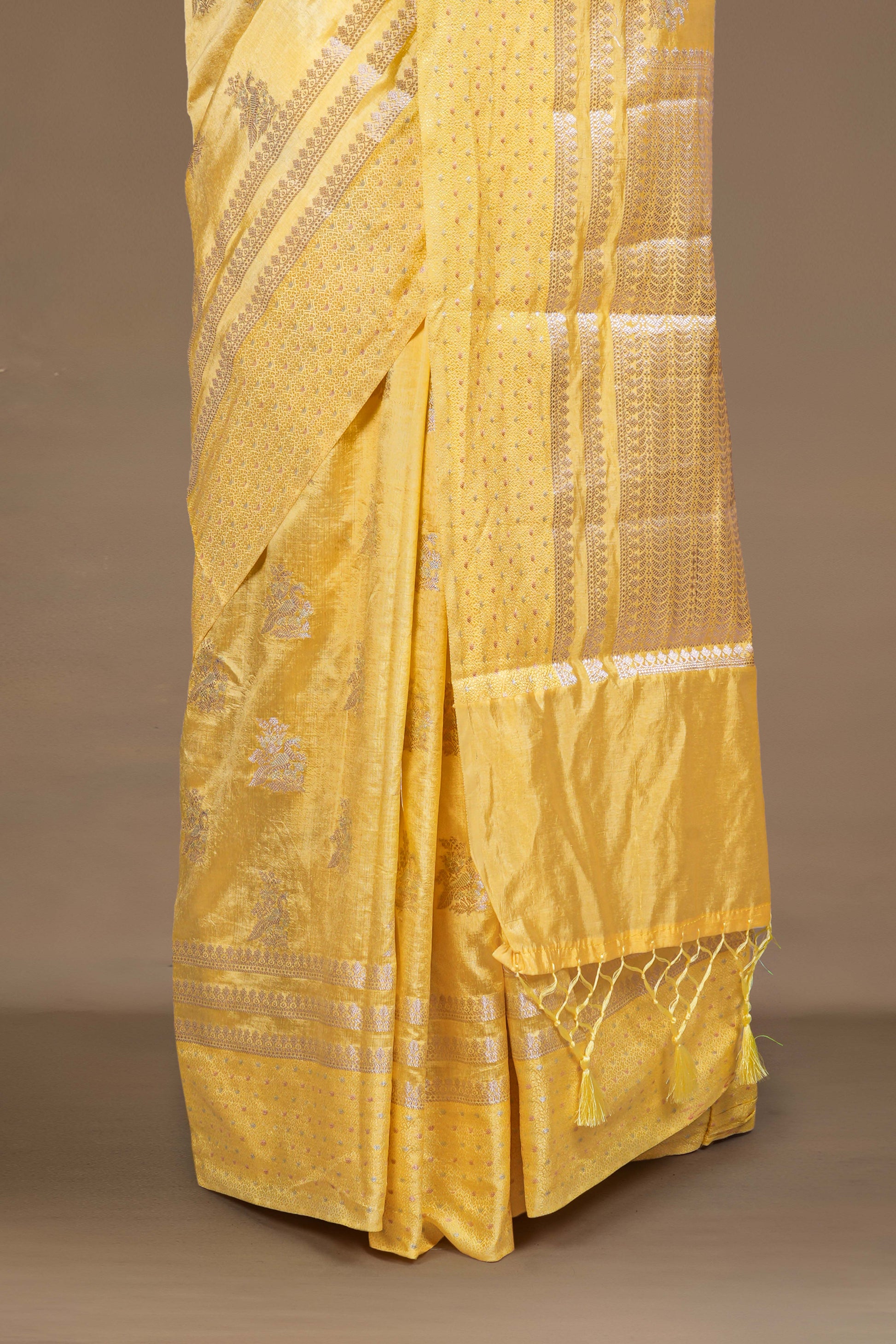 Golden Yellow Raw Silk Saree Peacock Motifs Woven In Silver Zari Across The Body & Pallu Highlighted With Elaborate Silver Zari Weaving In Floral Design Along With Blouse