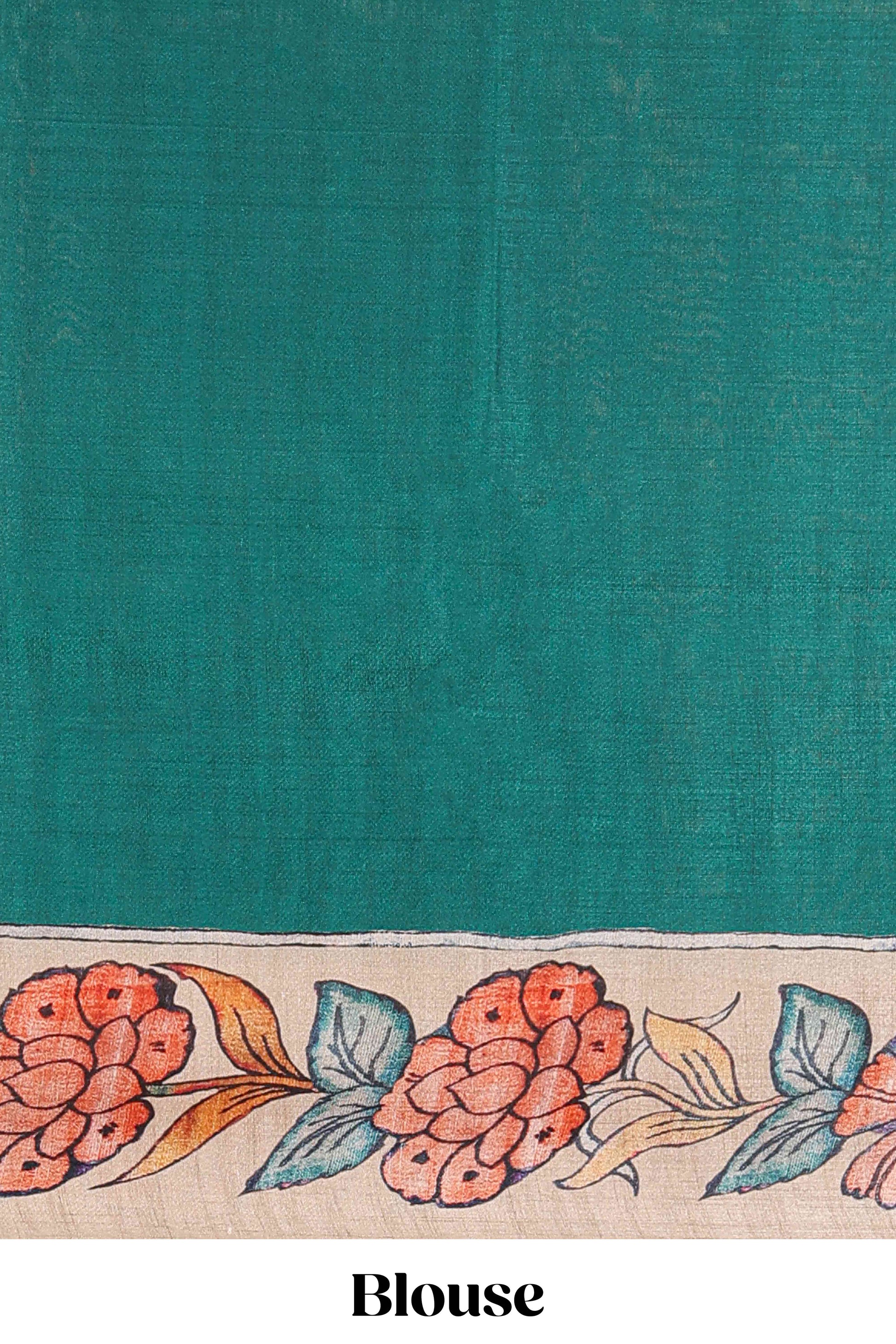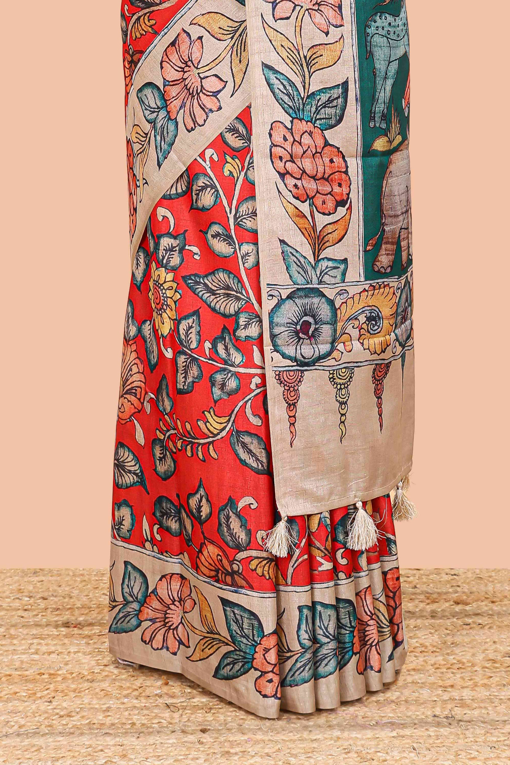 Red art tussar silk saree with leaf and floral printed body, cream border, and floral & animal print pallu