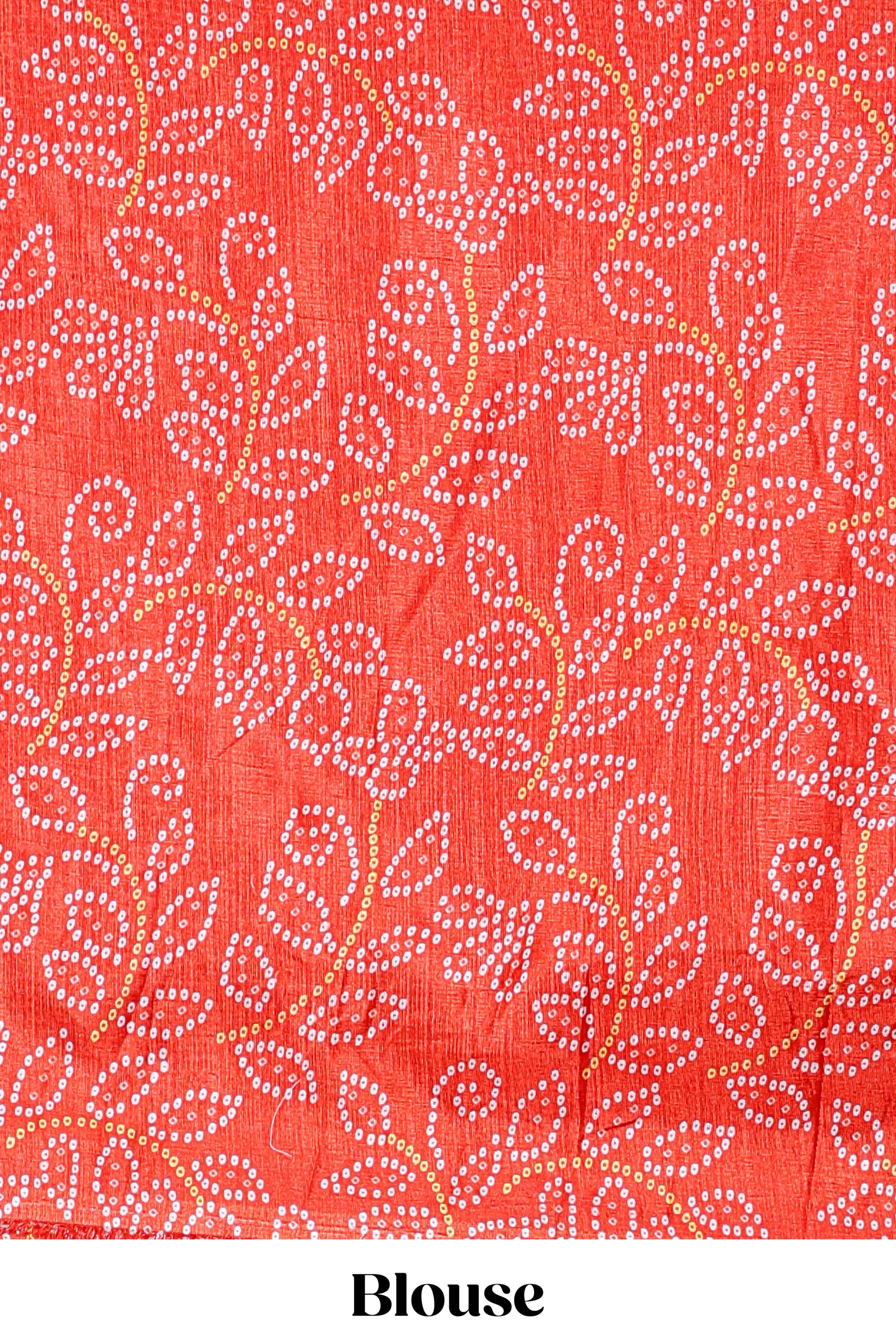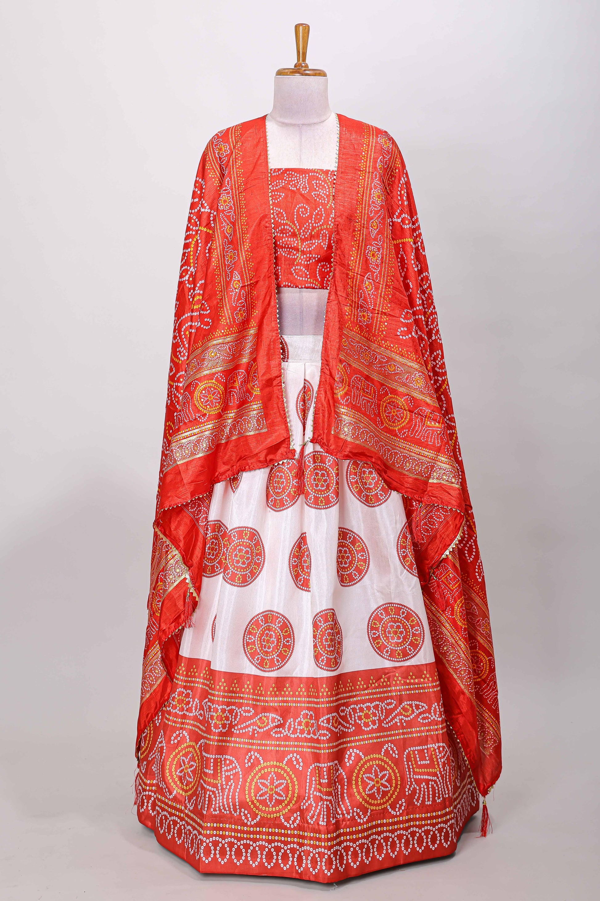 Red dola silk bhandani elephant and floral printed lehenga with contrast blouse and dhavani