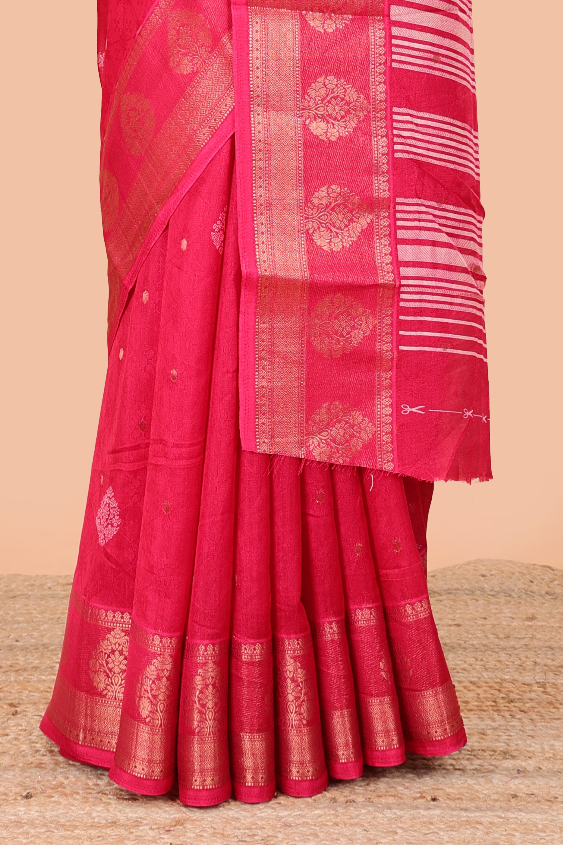 Red viscose dola silk self jacquard saree with print and zari butta, bentex zari border