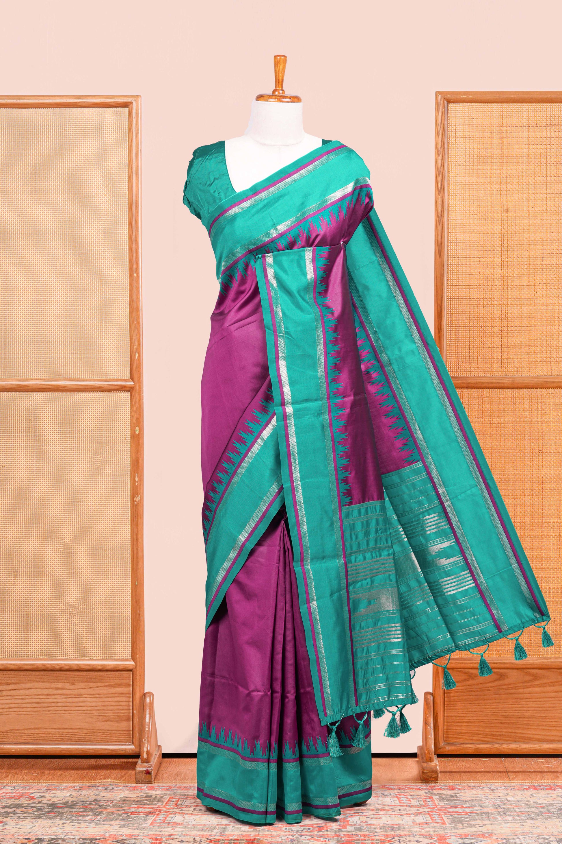 Purple Retta Petta Art Silk Saree With Plain Body Retta Petta Border& Contrast Intricate Gold Zari Stripes Pallu Along With Geometric Motifs Blouse