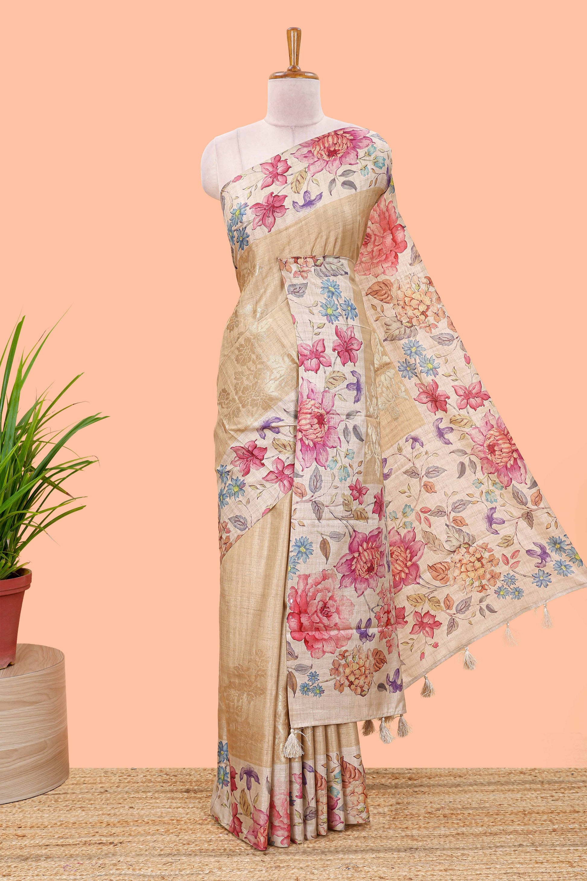 Sandal art tussar silk saree with floral zari butta body, cream border and floral print pallu