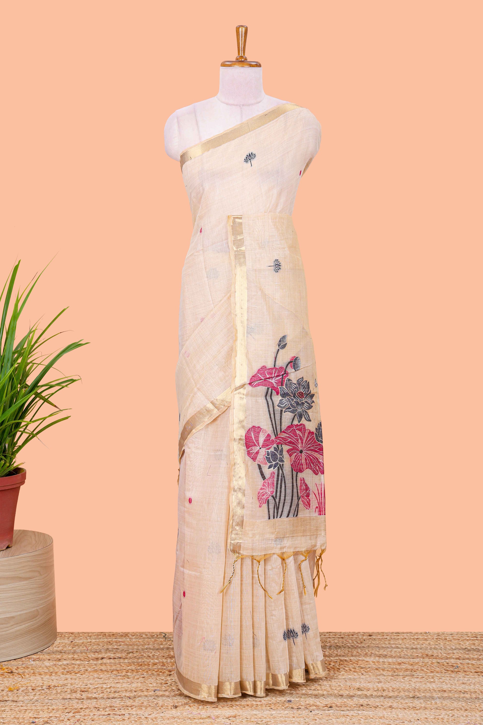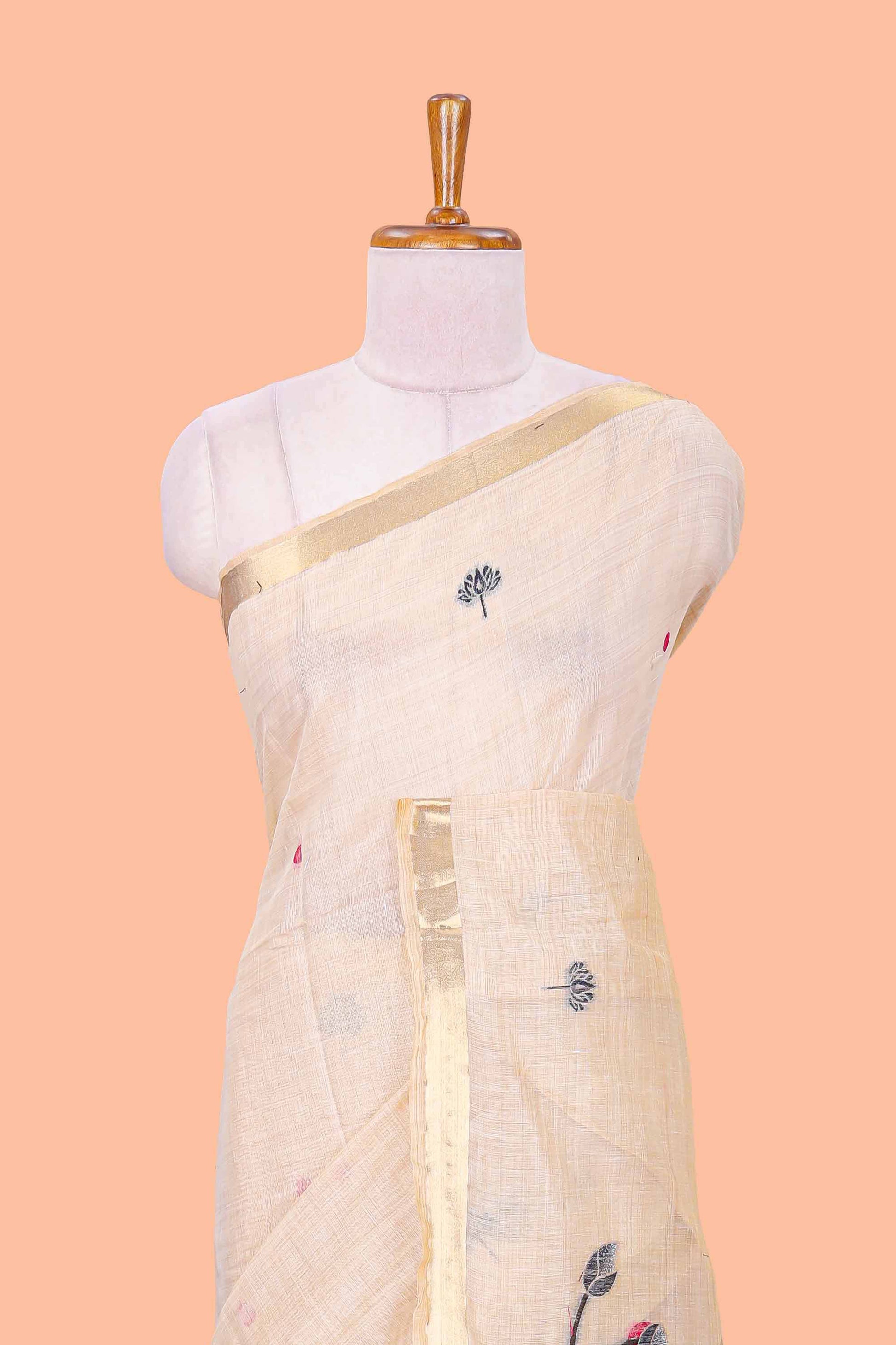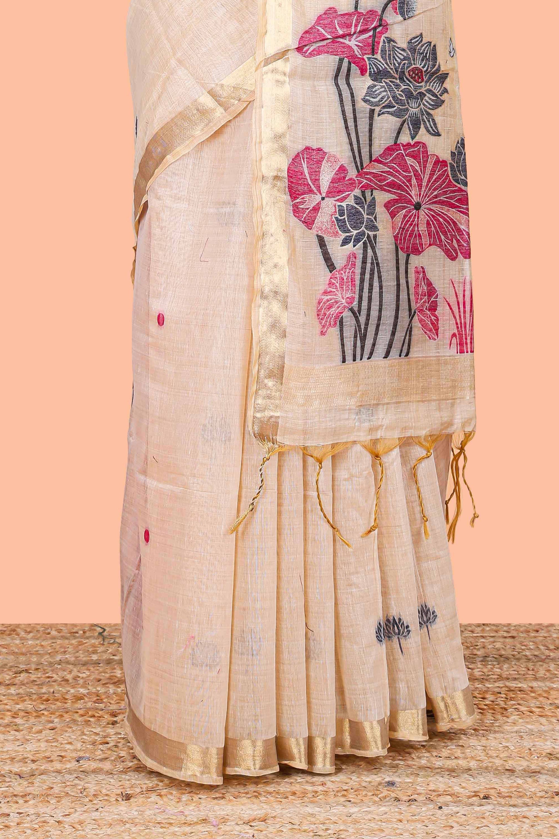 Sandal floral motifs thread weaving semi tussar saree with zari border and contrast blouse