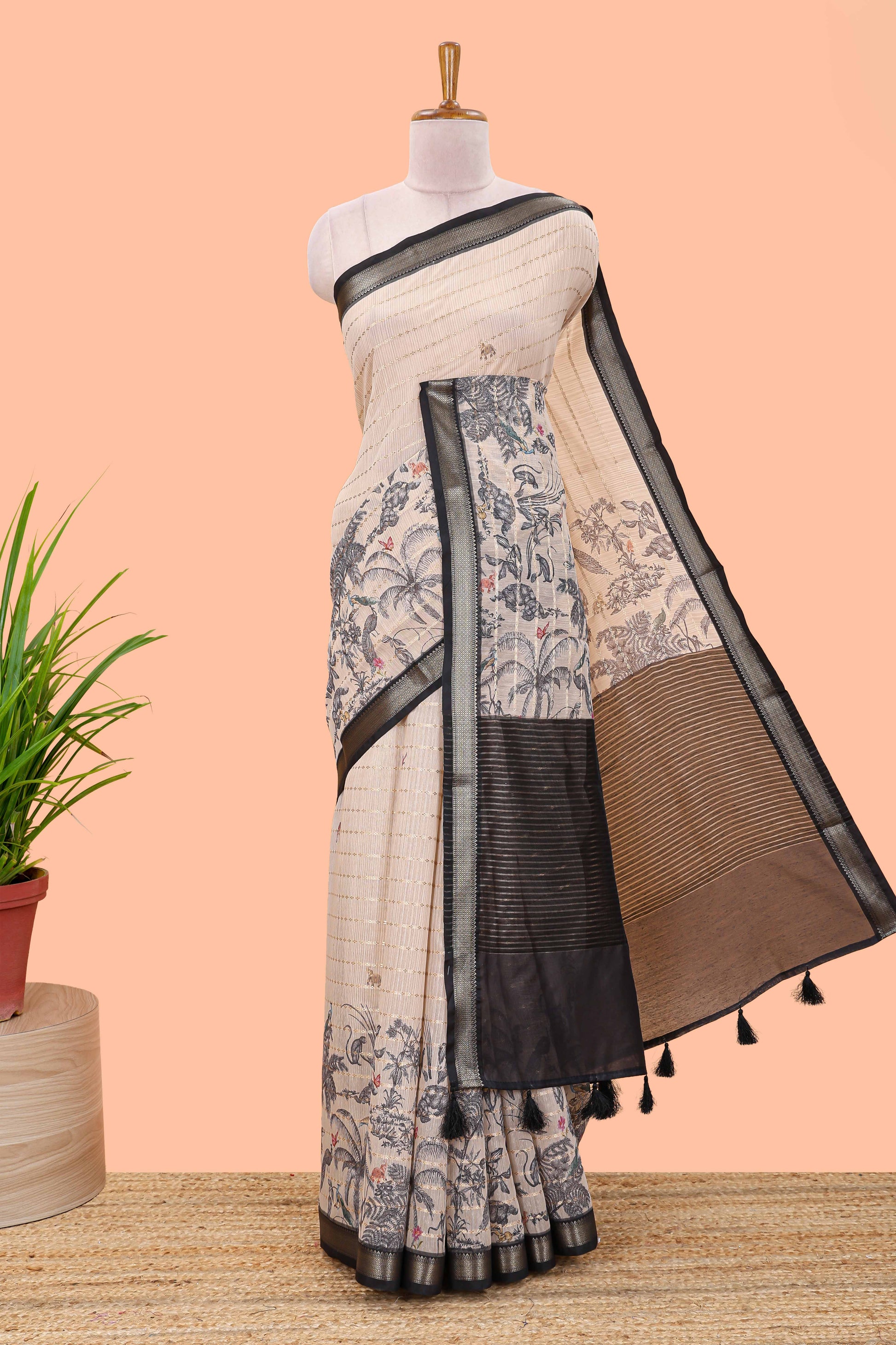 Sandal striped chanderi cotton saree with forest theme print and zari stripe pallu