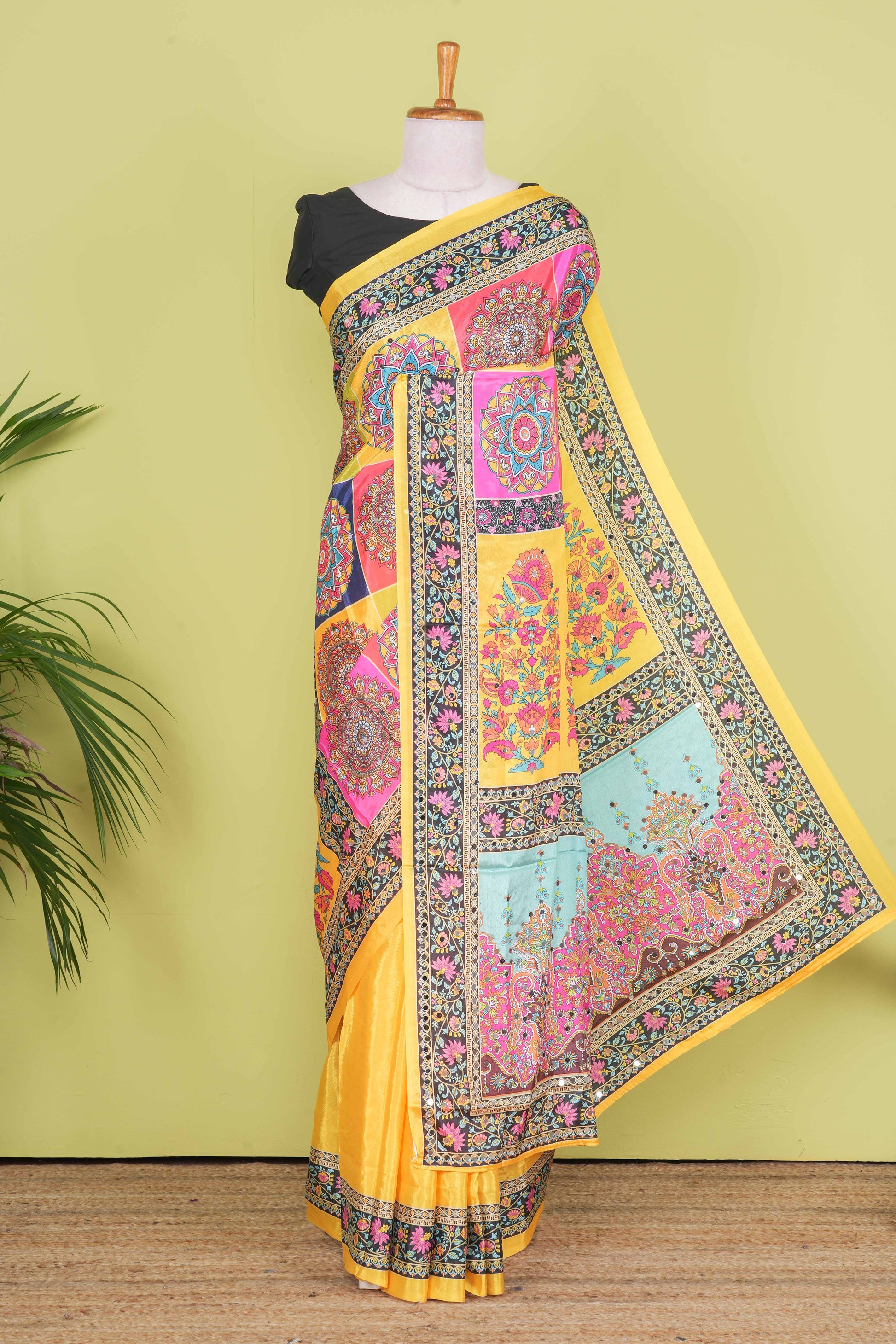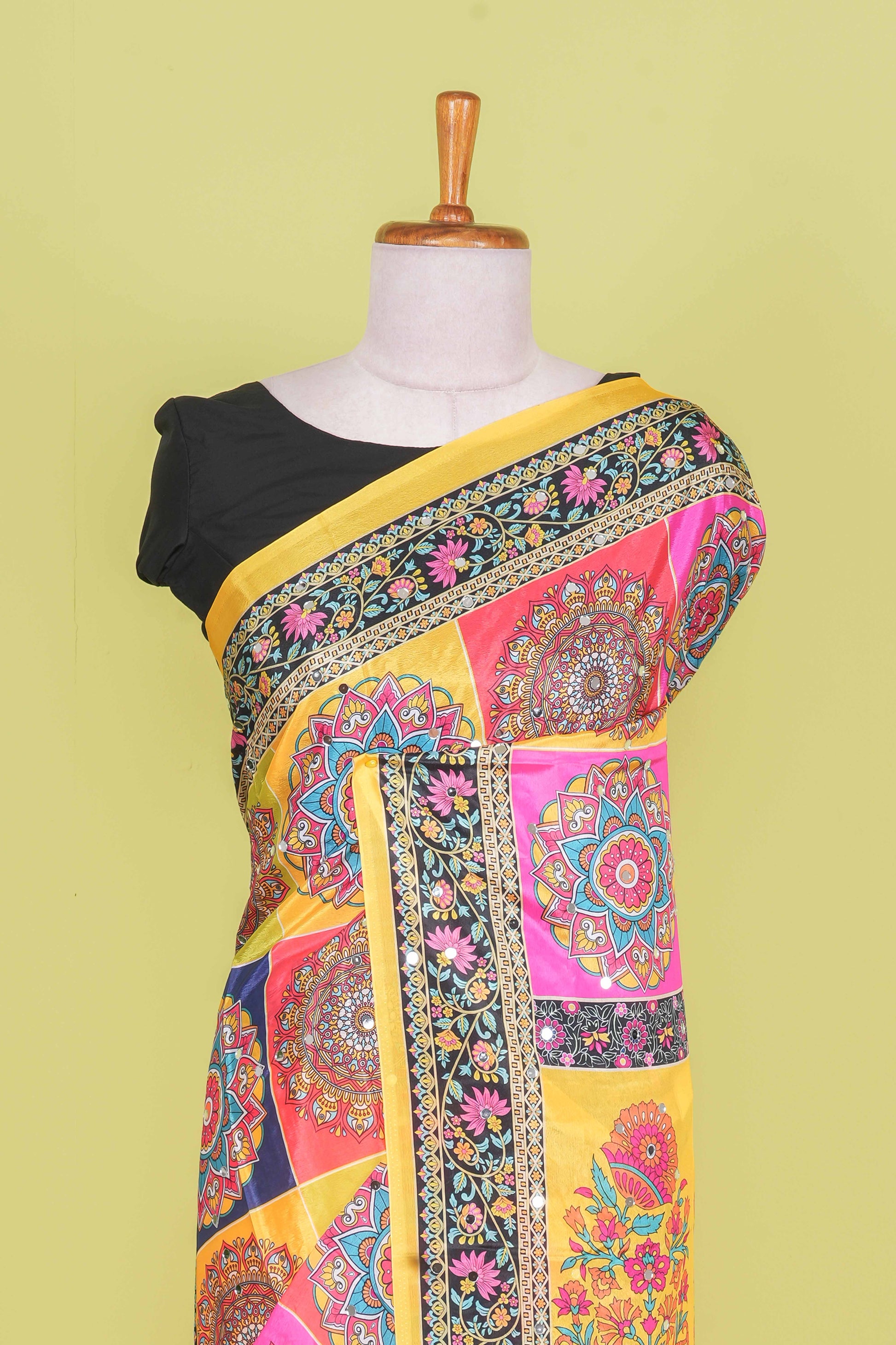 Rajasthani Mirror Work Saree Floral Design Traditional Rajasthani Mirror Work Across The Body . With Multi Color Pallu. Along With Contrast Blouse