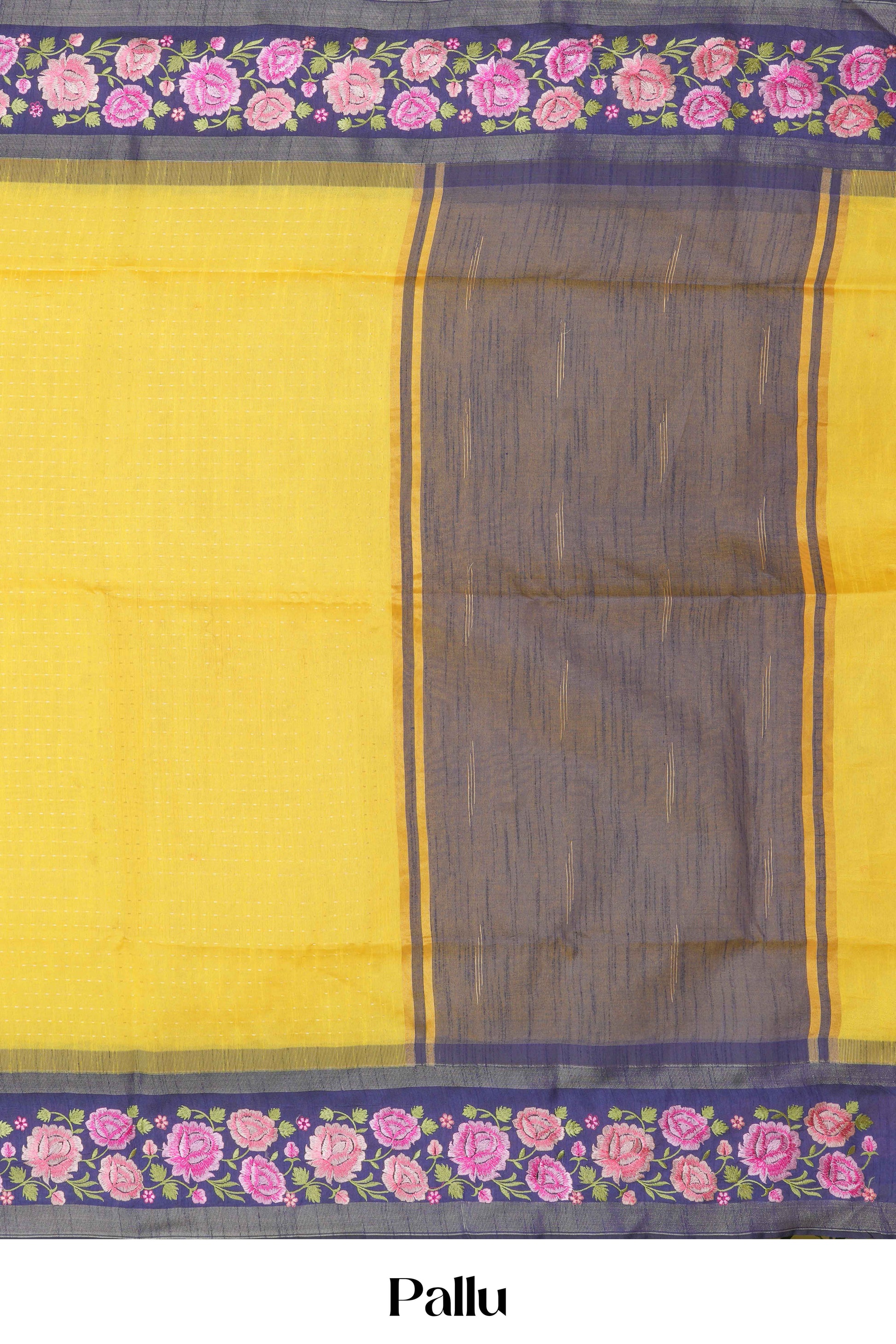 Yellow Art Tussar Silk Saree Golden Zari Stripes Weaving Across The Body With Intricate Floral Embroidery Border & Contrast Short Pallu Along With Blouse