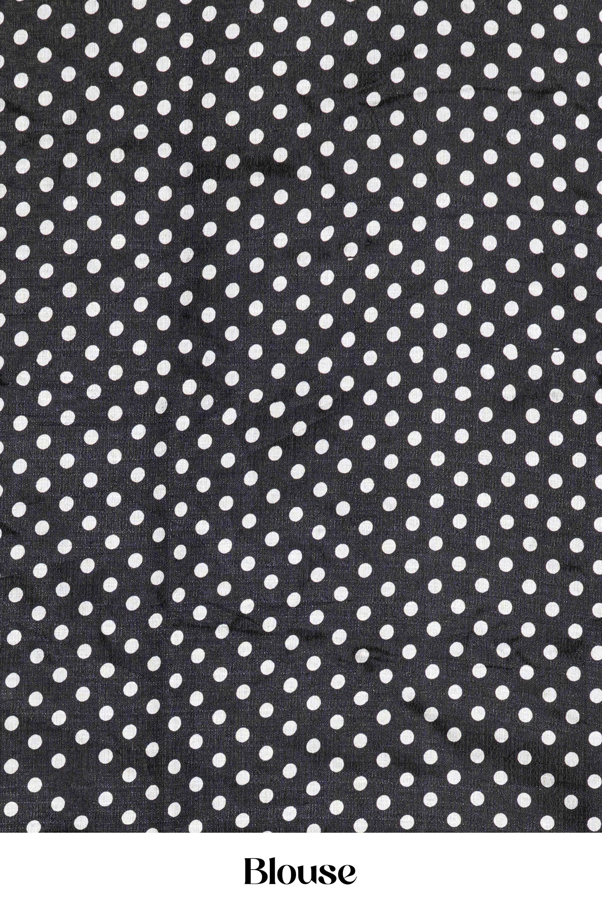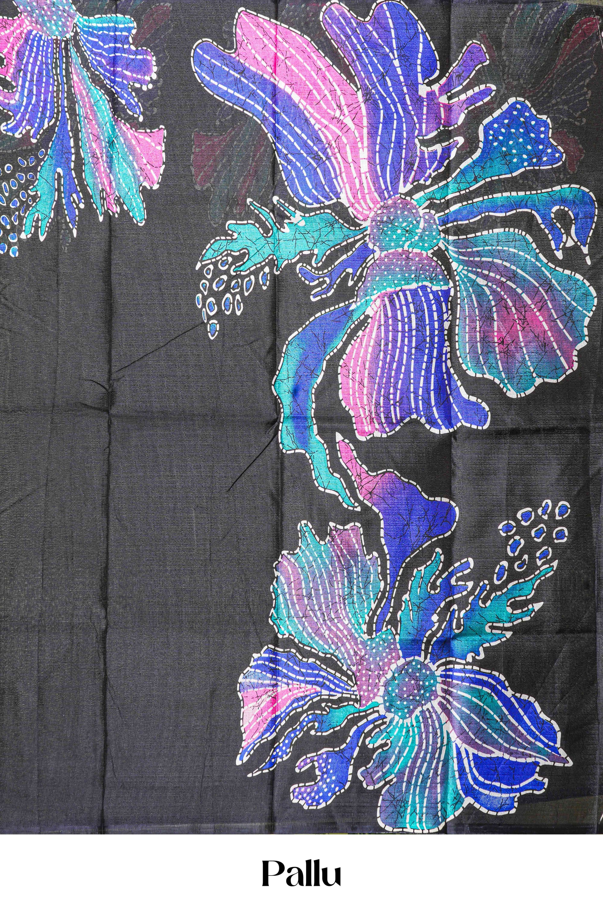 Black Khadi Saree With Multi Color Orchid Printed Across The Body Along With White Dotted Blouse