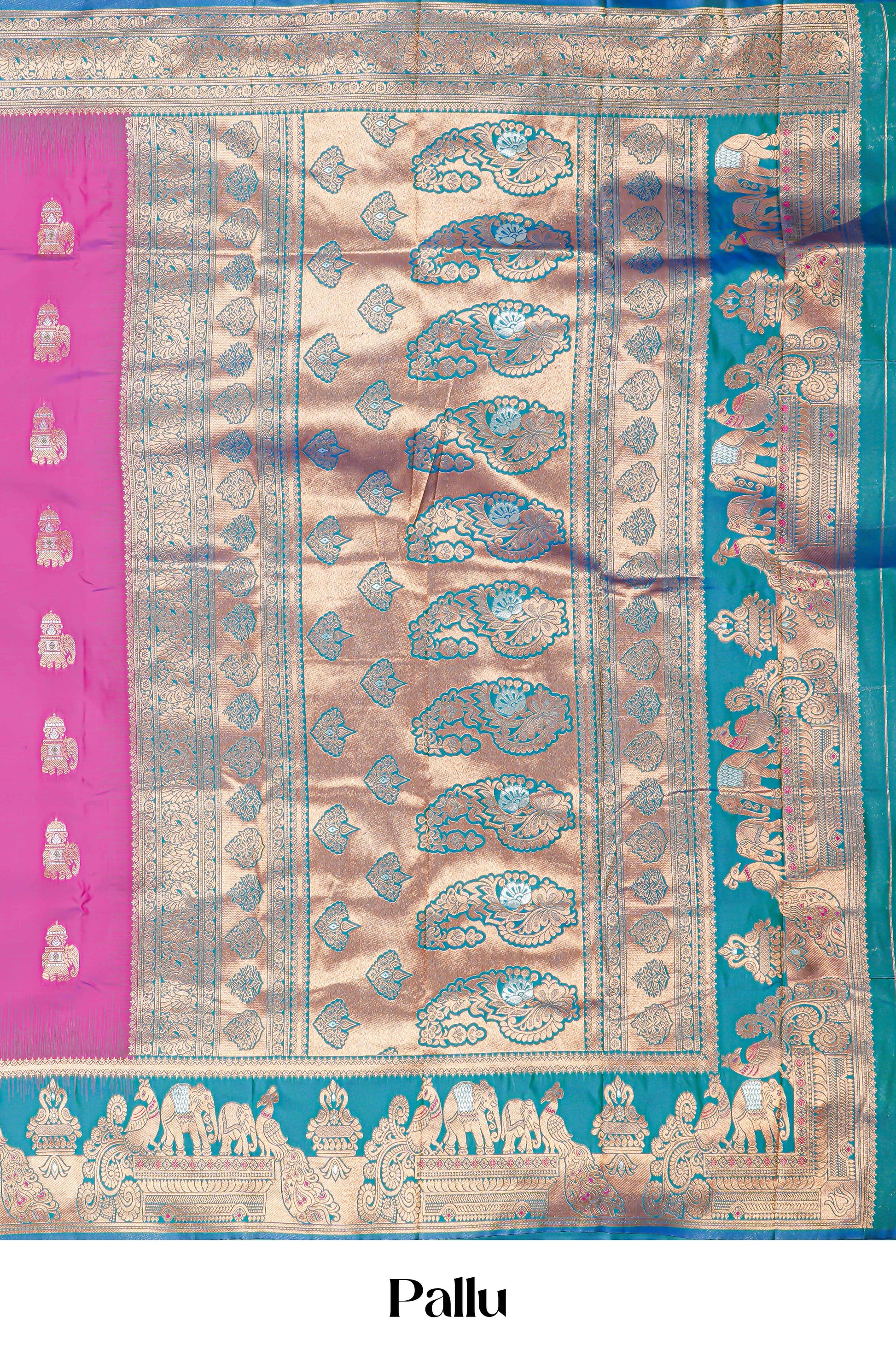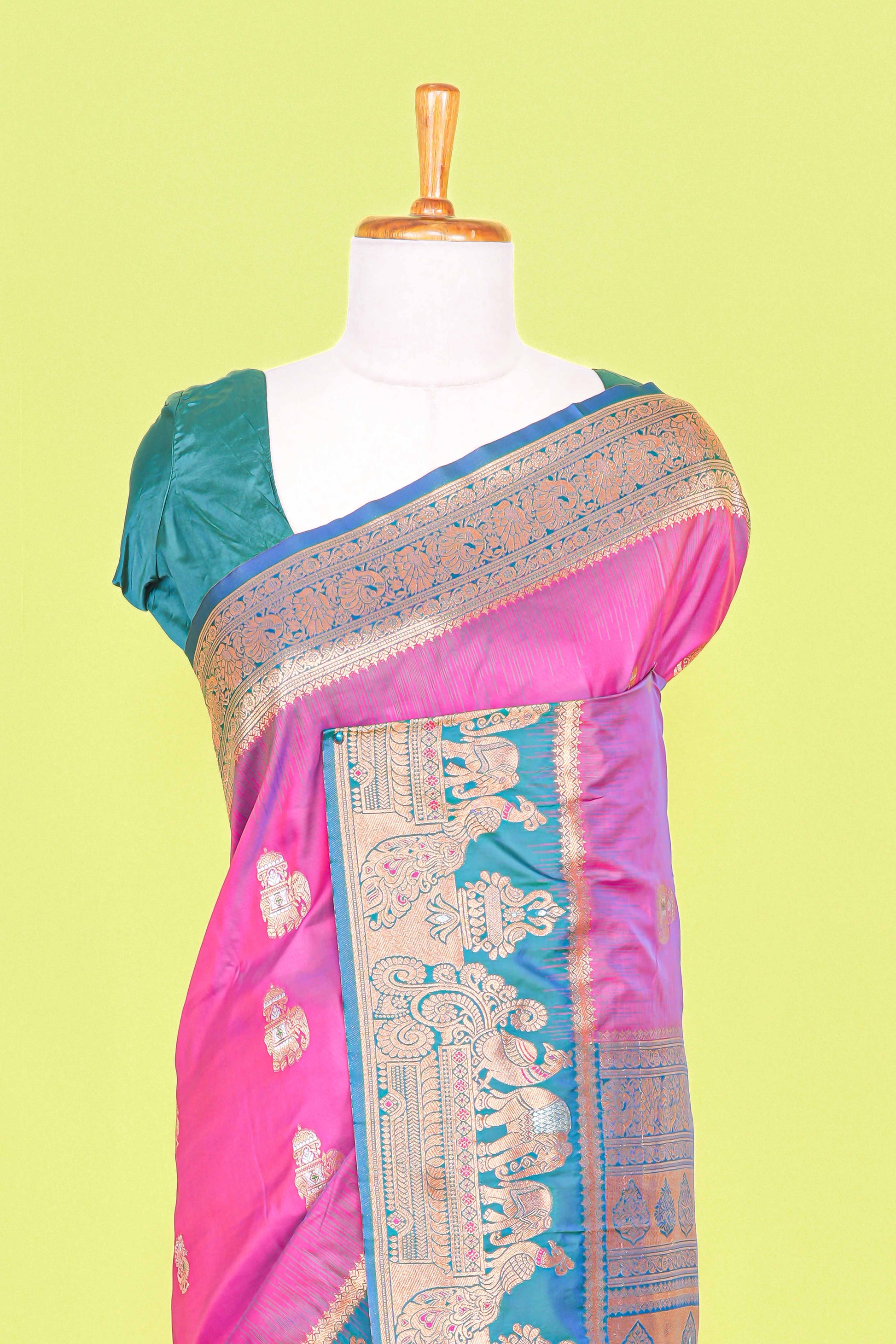 Art Silk Saree Intricate Zari Butta Across The Body With Zari Weaving Mayil, Floral Design Pallu Along With Contrast Blouse