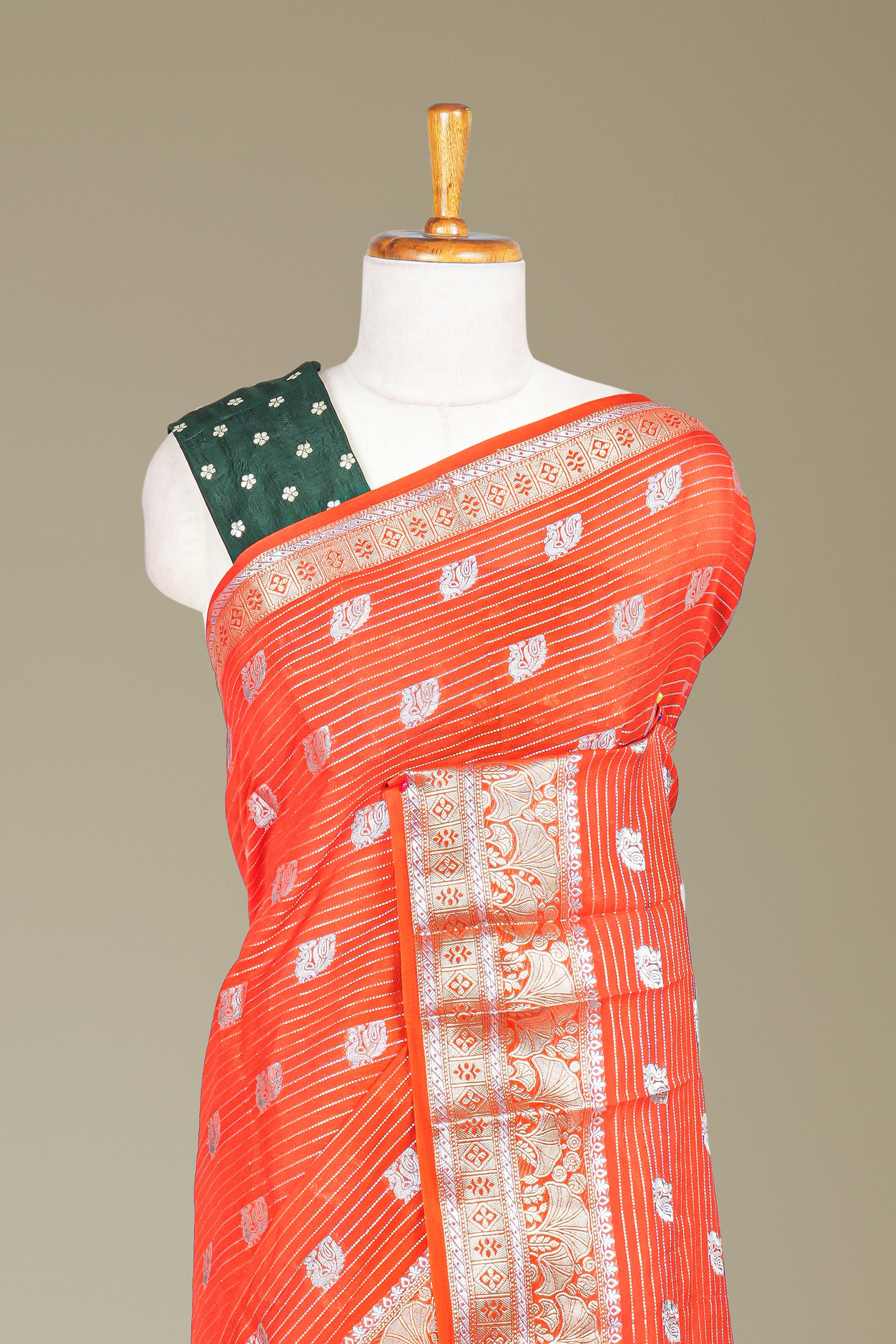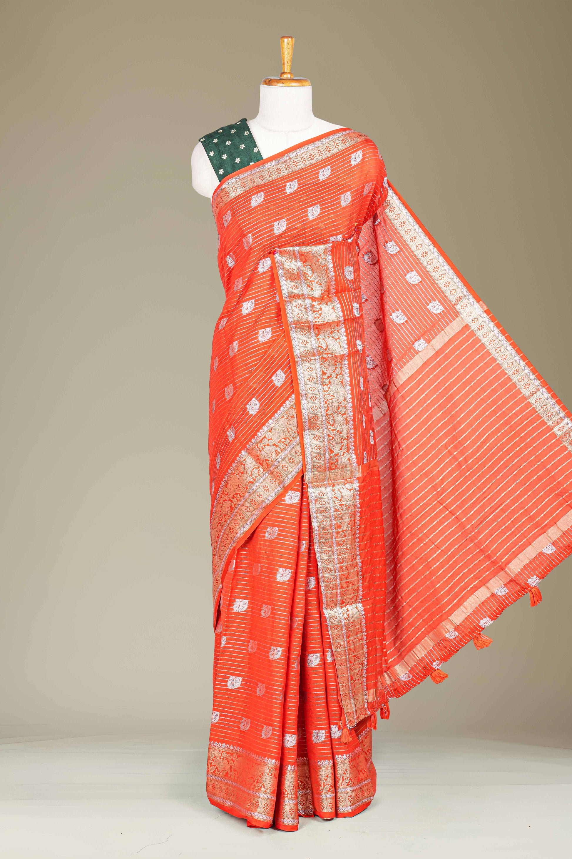 Orange Georgette Saree Rich Golden Zari Stripes Woven & Peacock Motifs Across The Body With Zari Border Along With Contrast Blouse