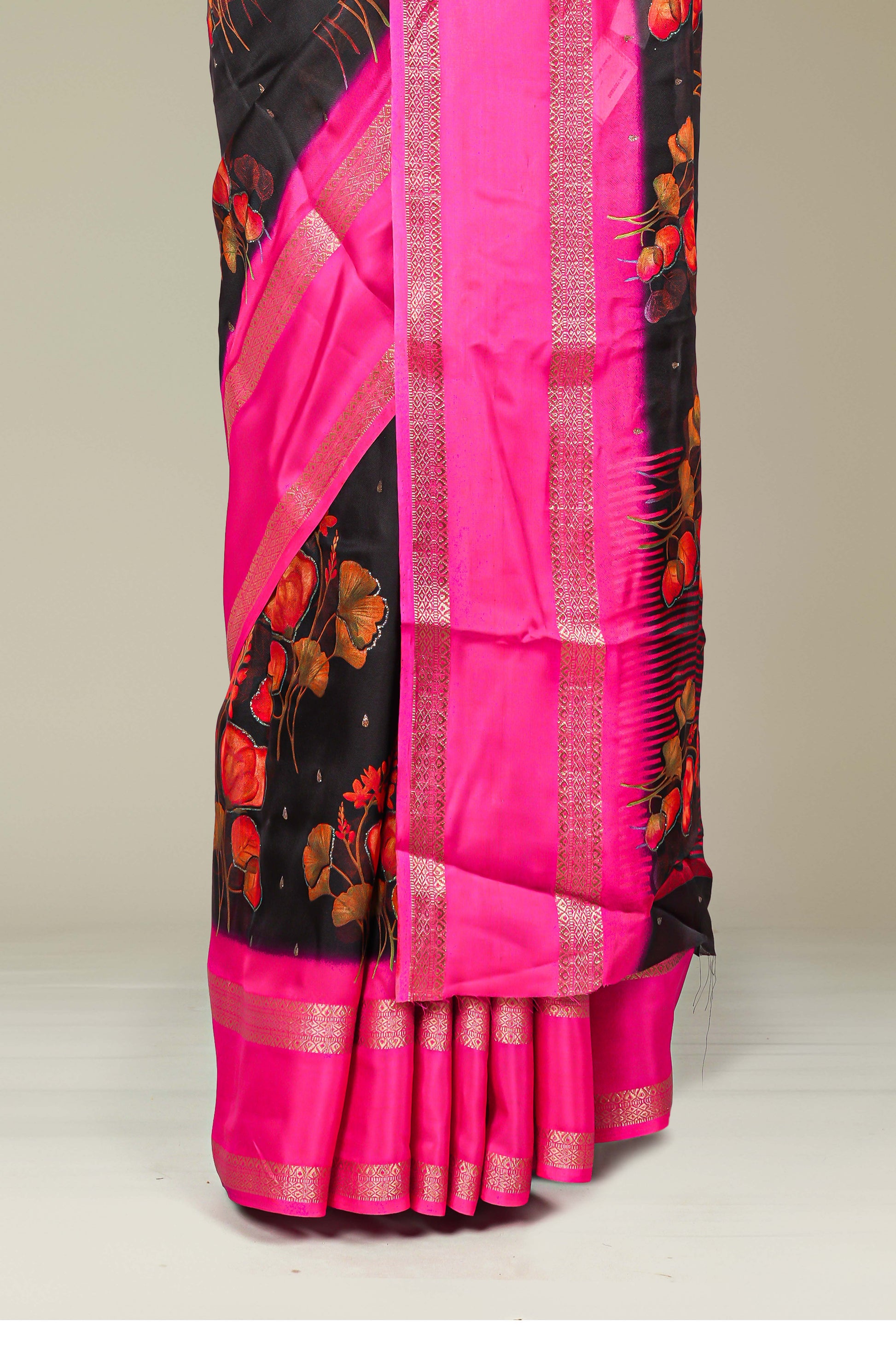 Black Moss Chiffon Saree Floral Motifs Across The Body With Contrast Retta Petta Border & Stripes Pallu Along With Blouse