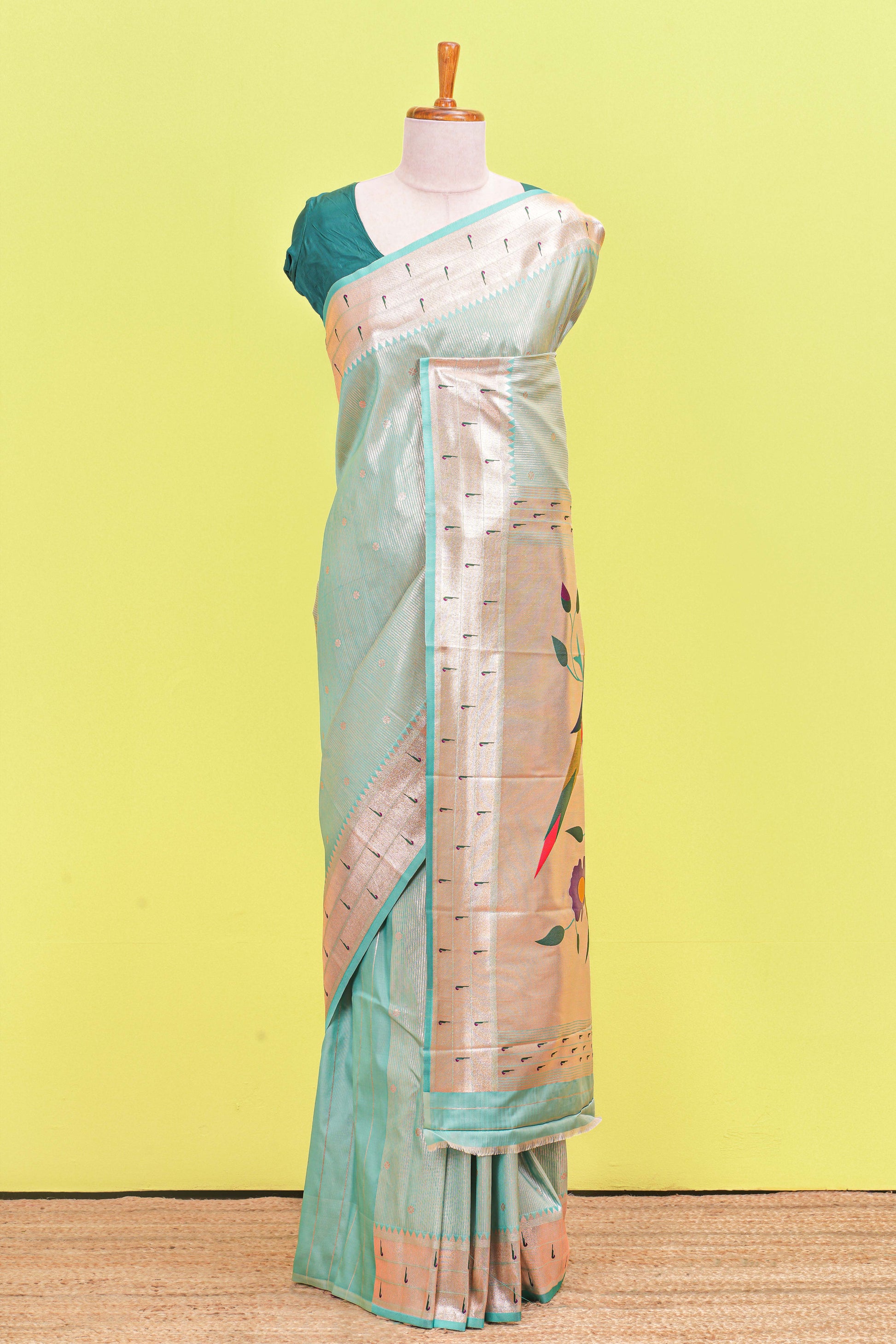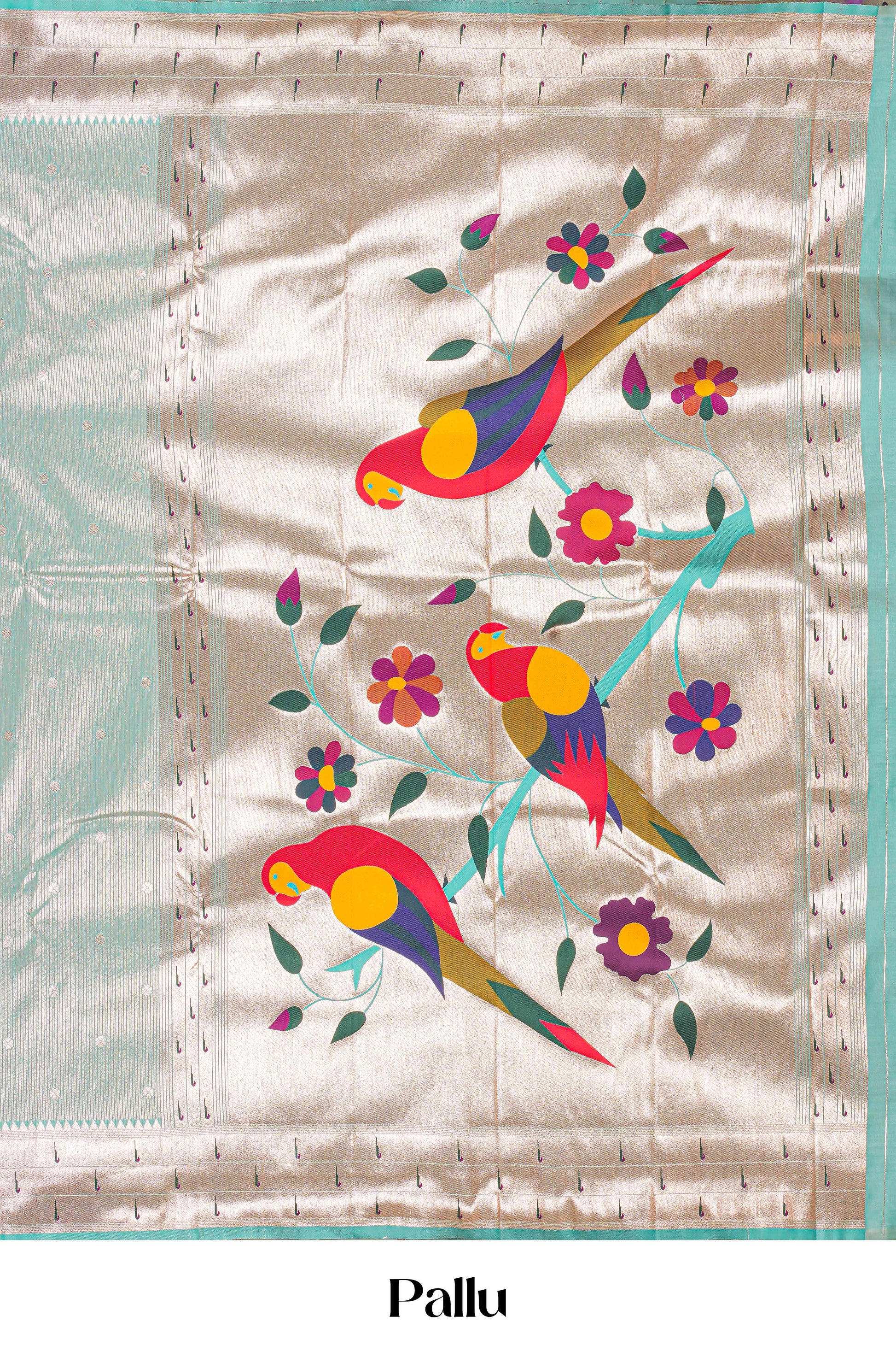 Pastel Green Art Silk Saree Golden Zari Woven All-Over The Body With Muniya Border & Paithani Design Pallu Along With Blouse