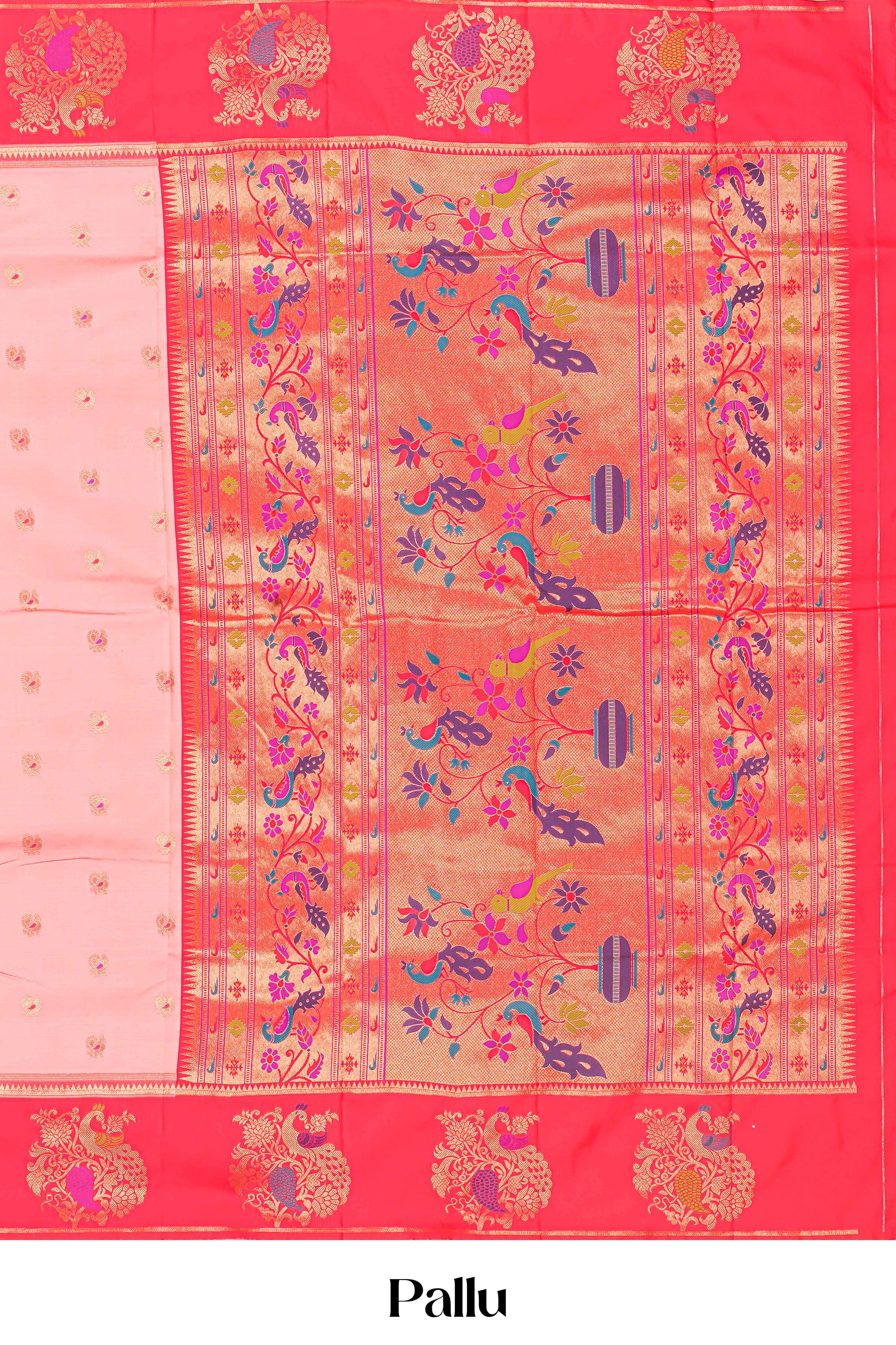 Peach Art Silk Saree Zari Mayil Motifs Across The Body With Contrast Border & Intricate Paithani Pallu Along With Blouse