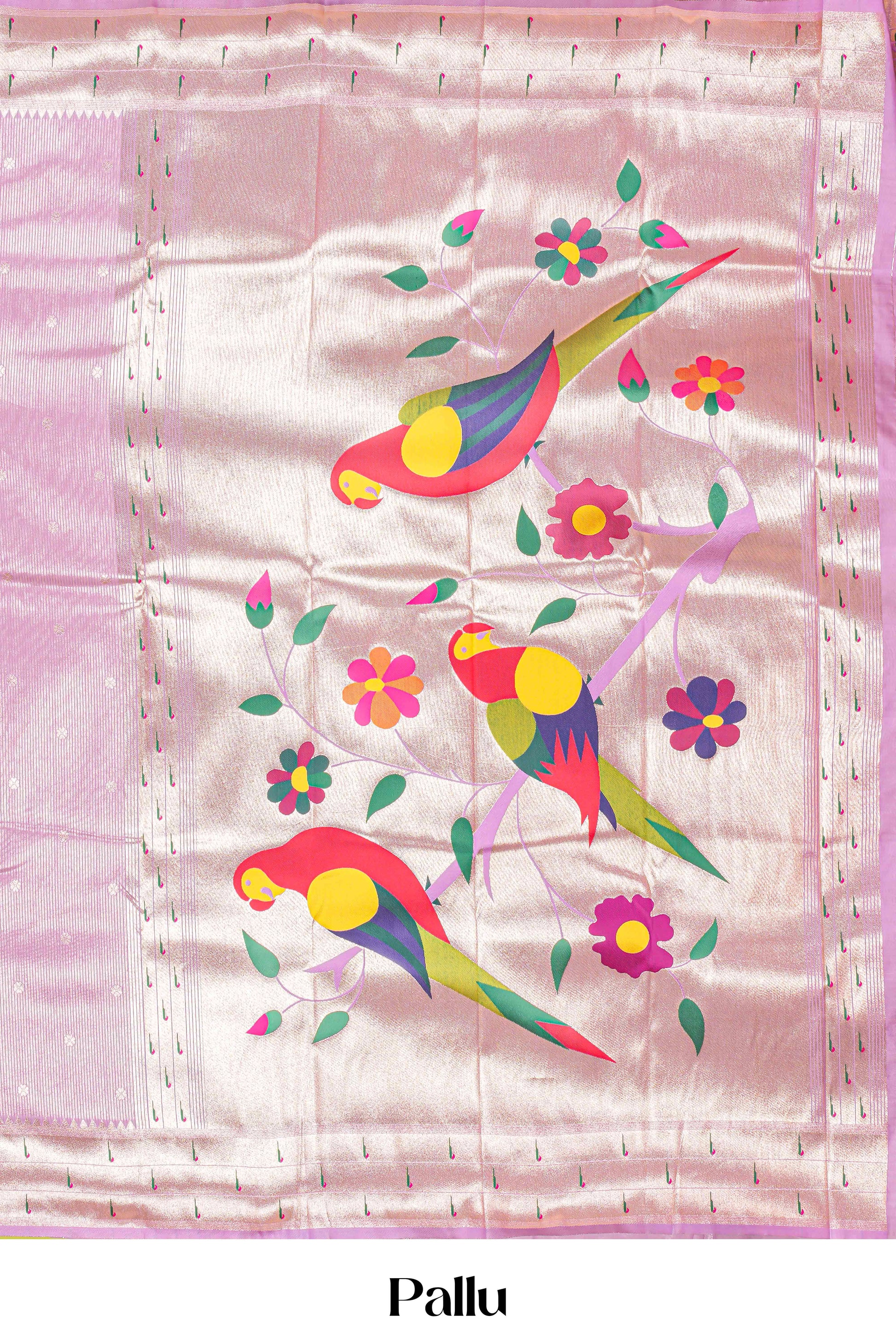 Lavender Art Silk Saree Golden Zari Woven All-Over The Body With Muniya Border & Paithani Design Pallu Along With Blouse
