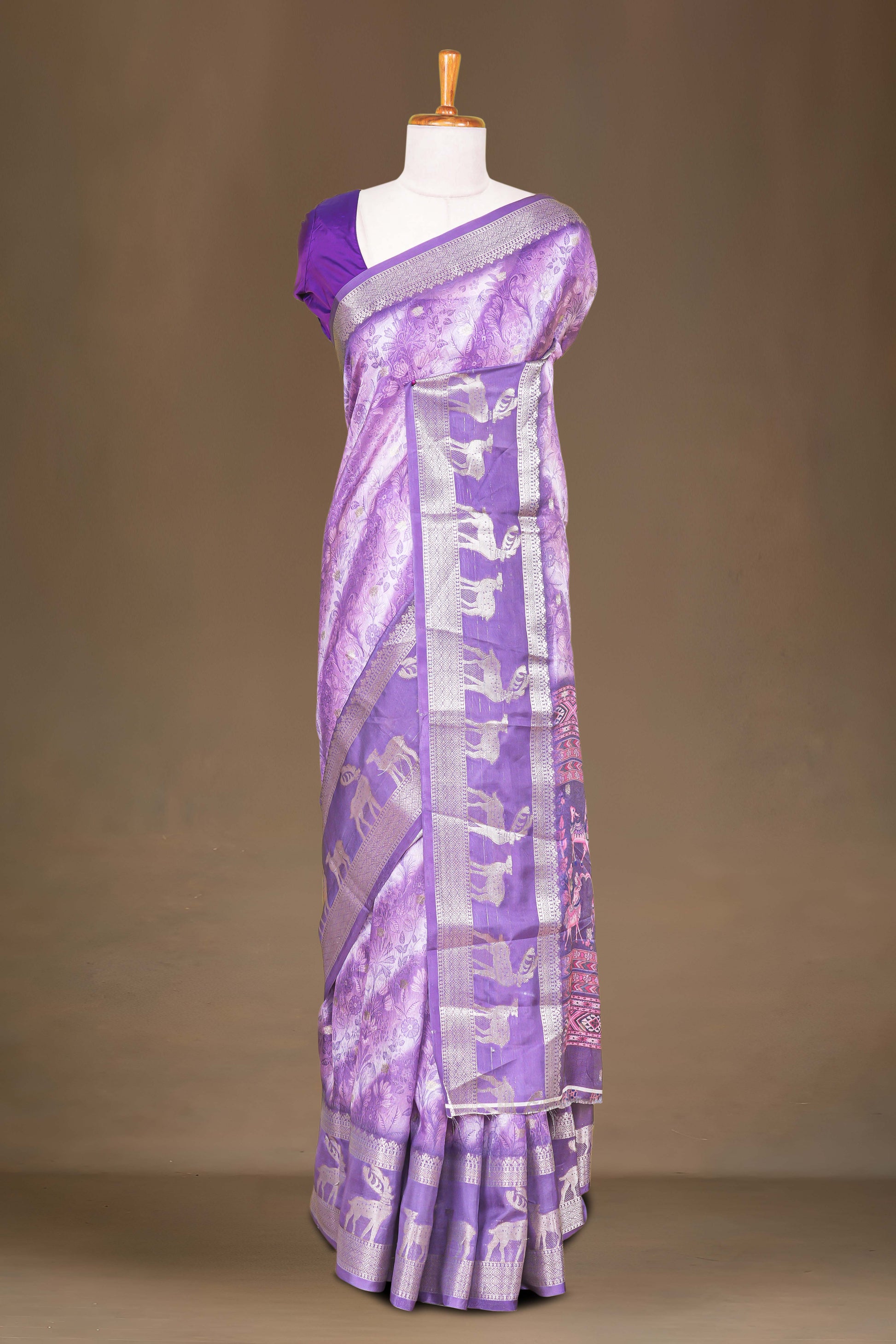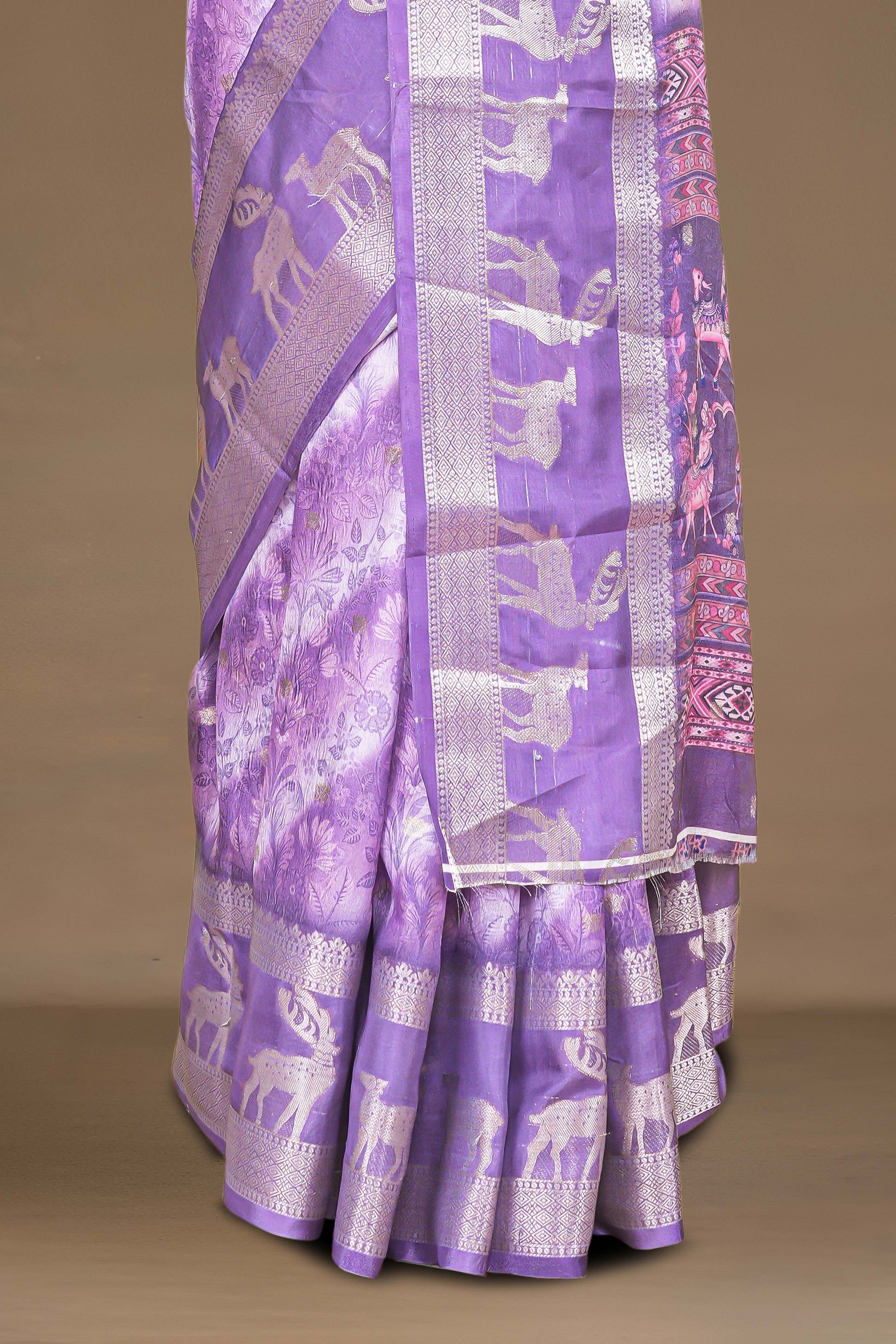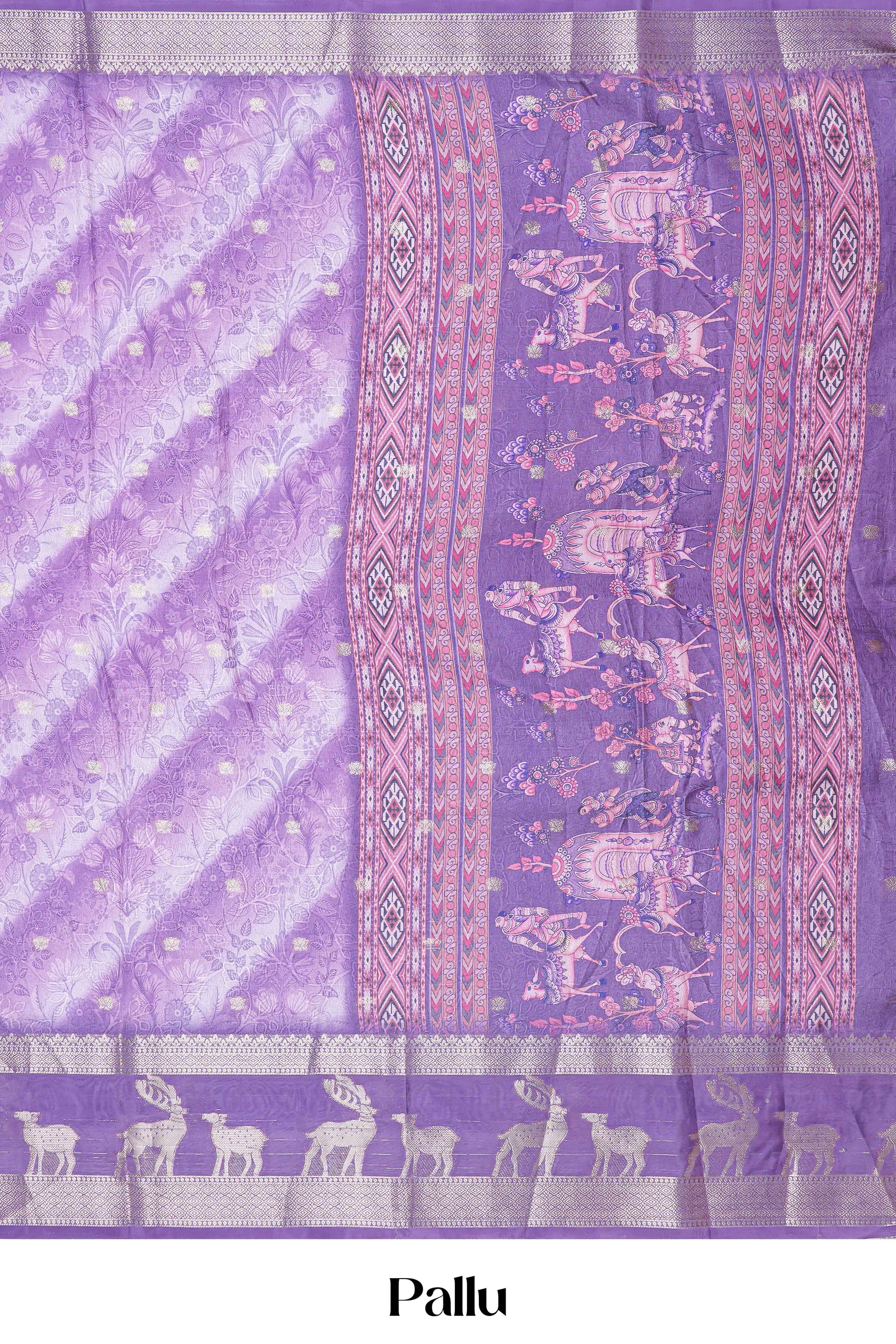 Lavender Marsh Mellow Saree Elegant & Lightweight All-Over Detailing Floral Print With Zari Butta & Traditional Indian Heritage Art & Temple Carvings Printed Pallu Along With Blouse