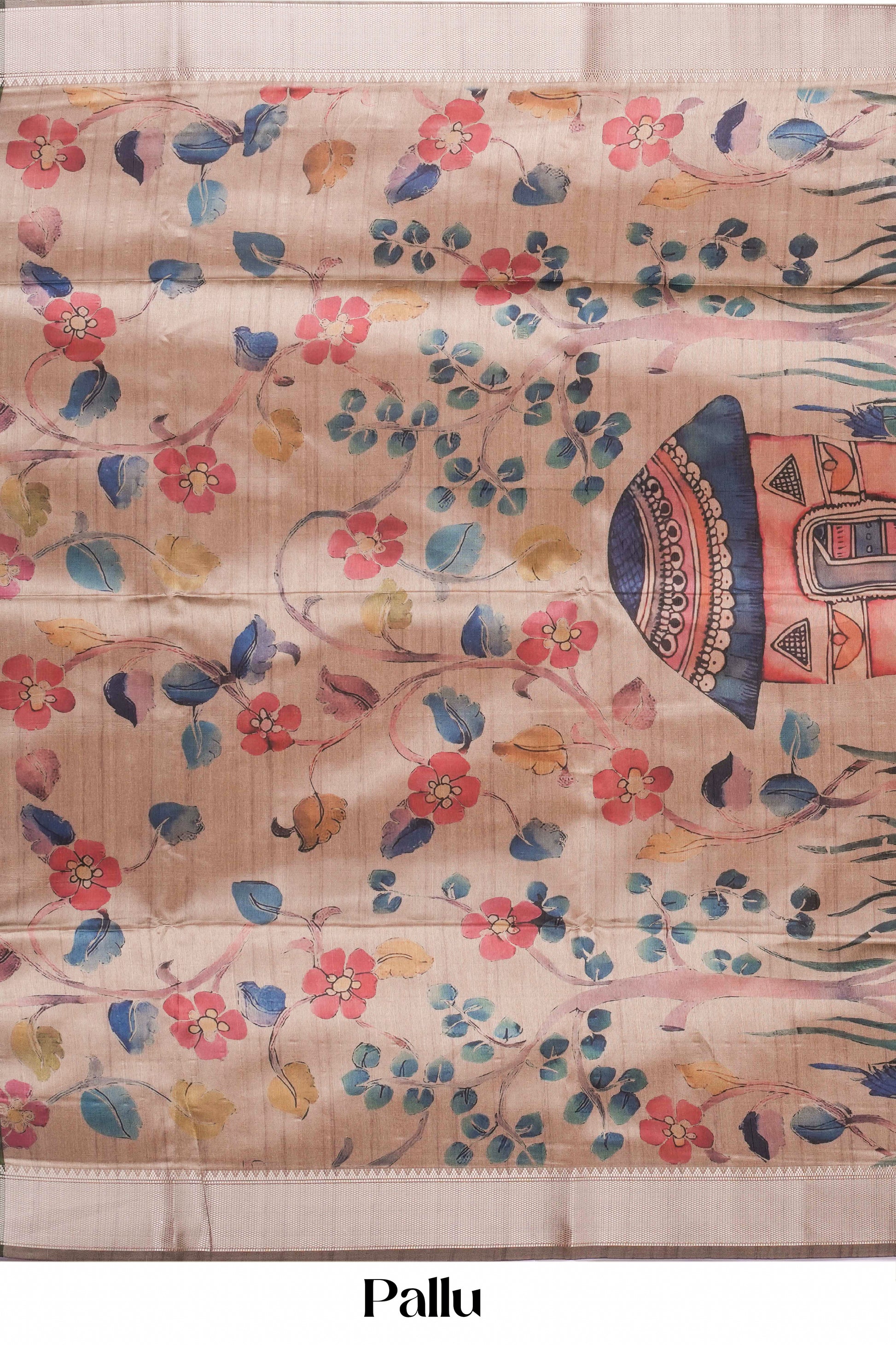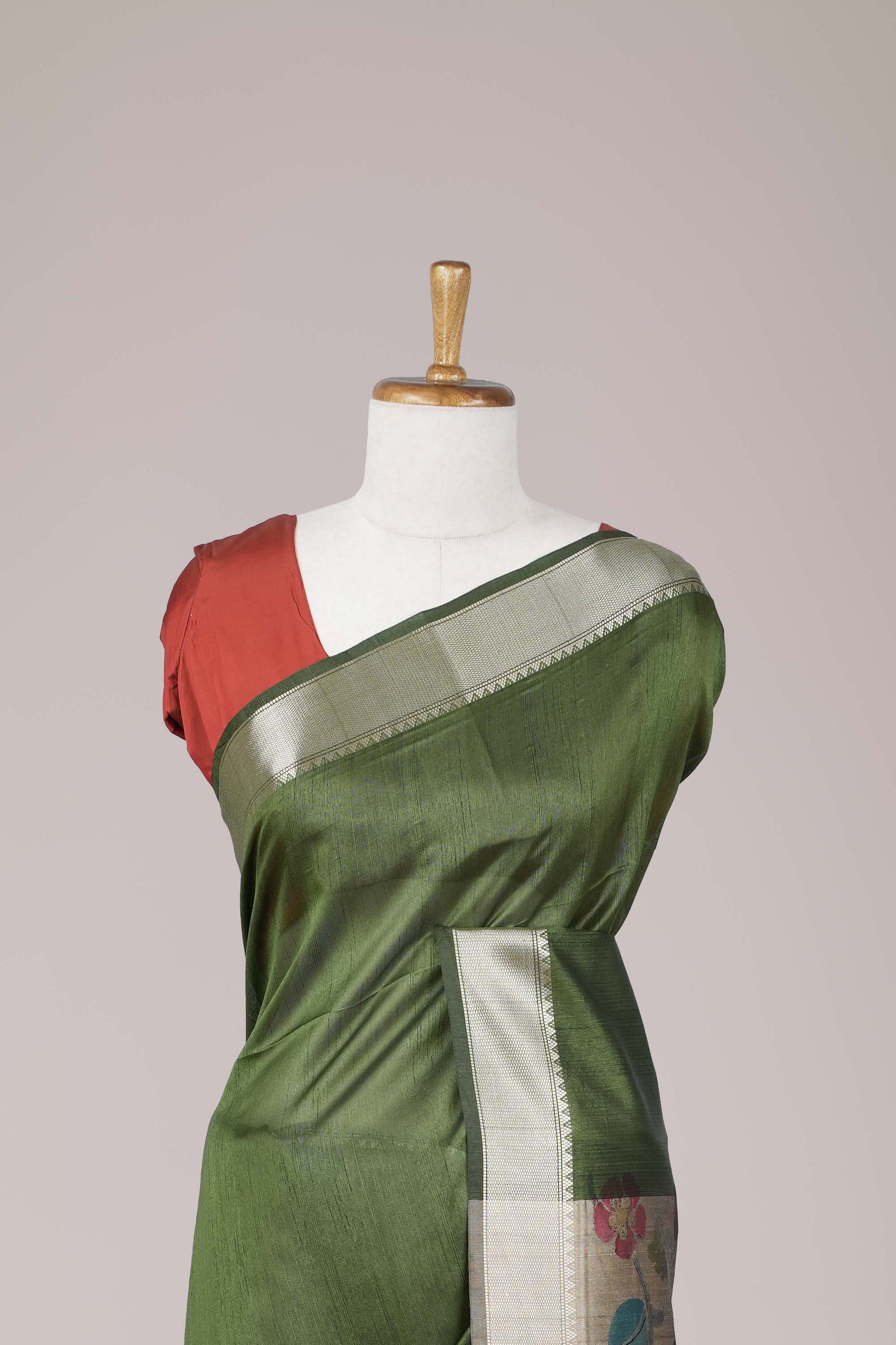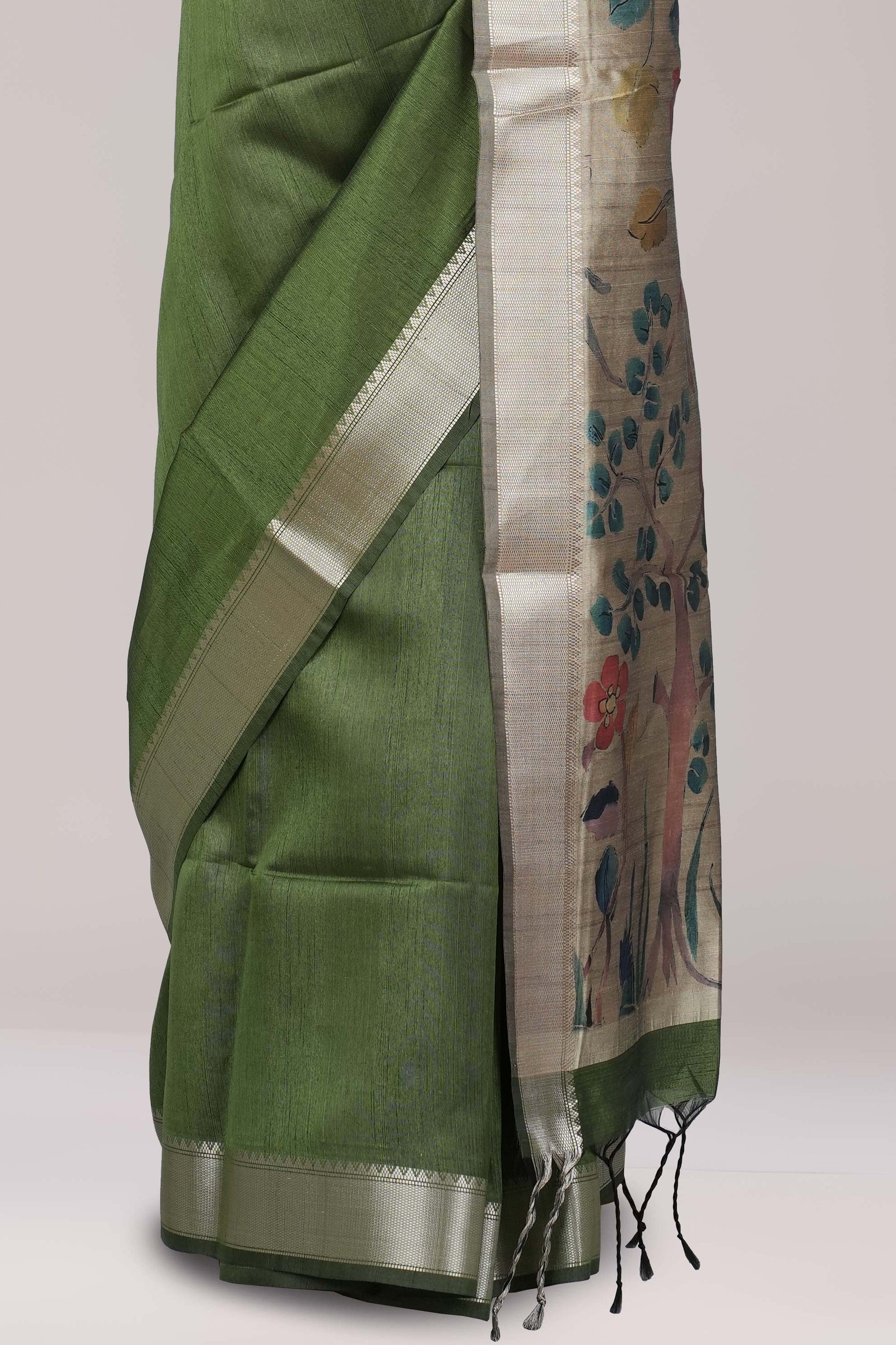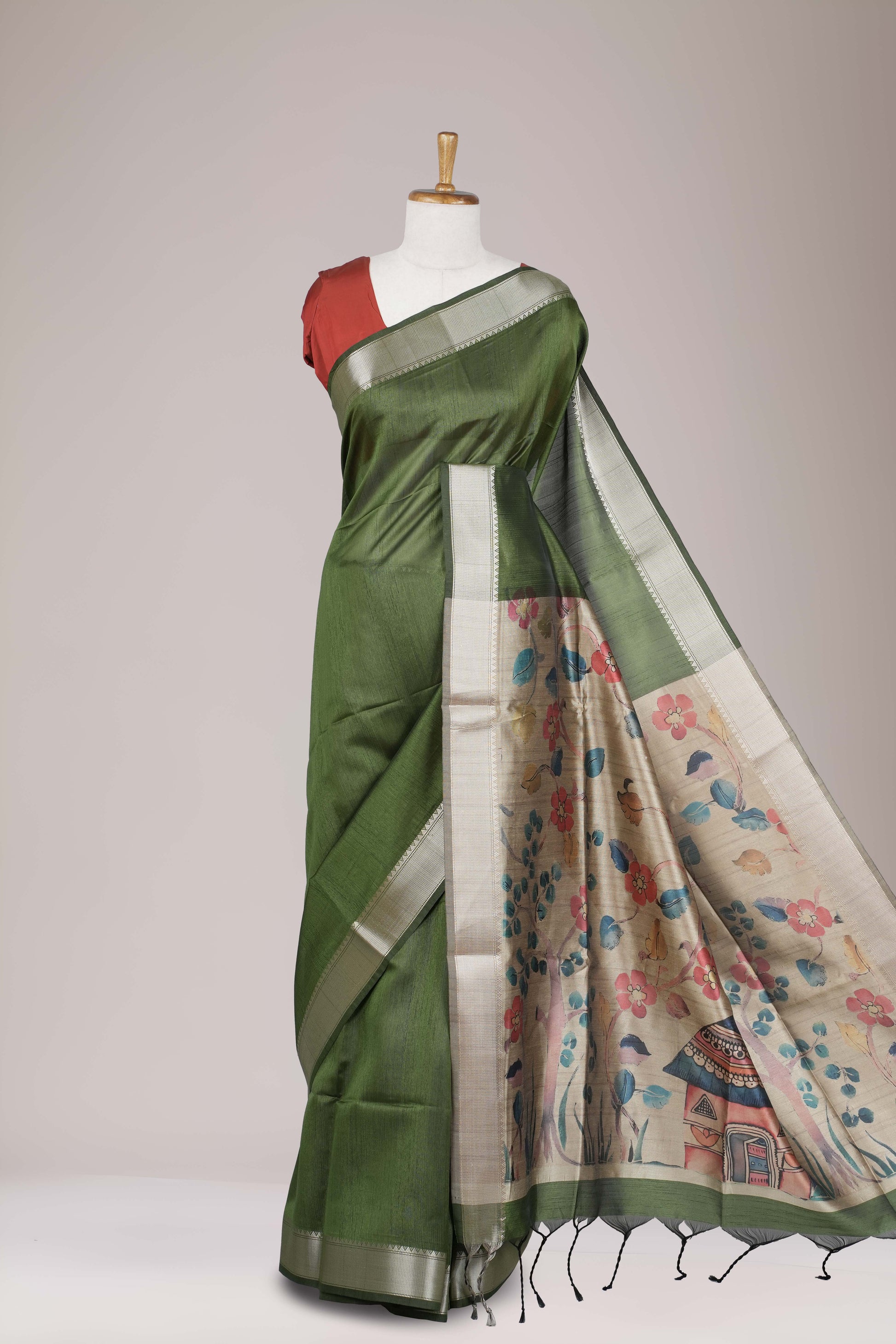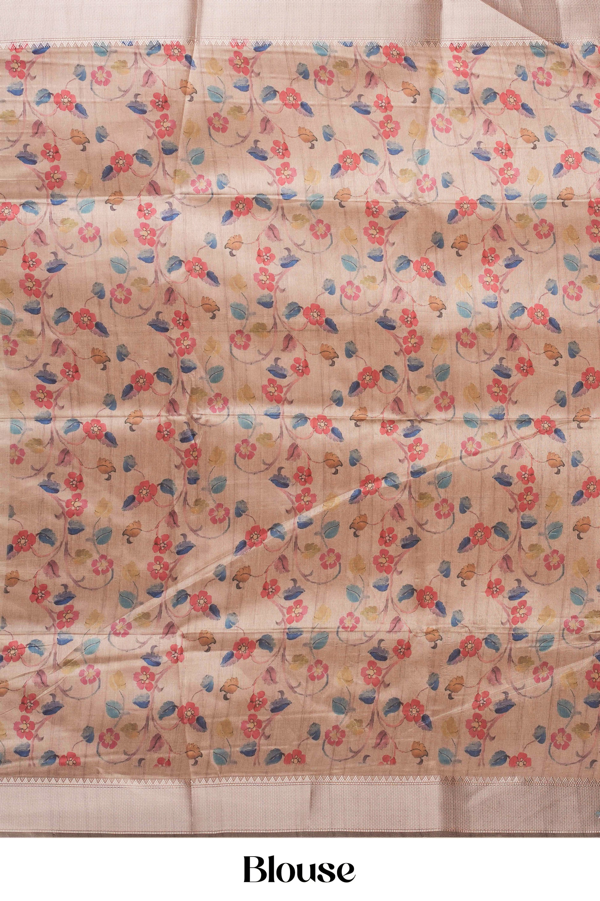 Chappa Tussar Plain Floral Print In Pallu Zari Border