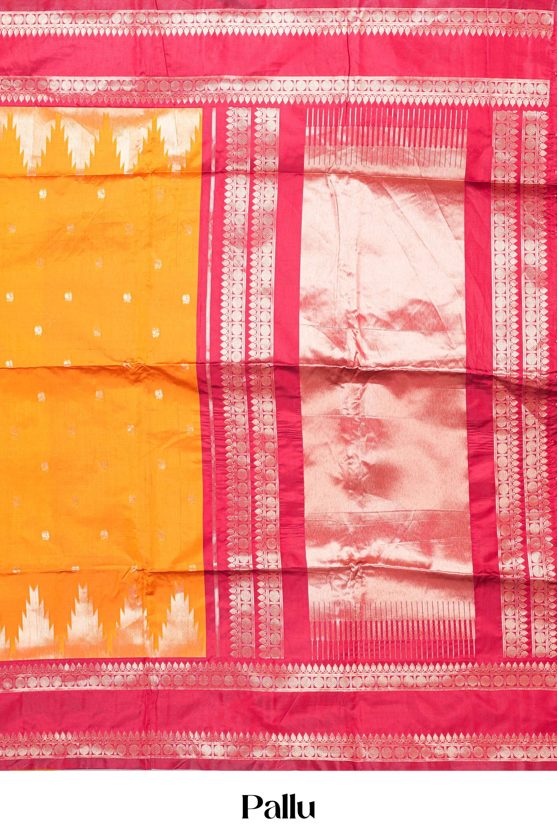 Mustard Yellow Semi Art Silk Saree Delicate Golden Zari Motifs Along With Thalampoo Zari Woven Across The Body. The Border Is Broad With Intricate Floral Zari Weaving & Rich Golden Zari Pallu Along With Contrast Blouse