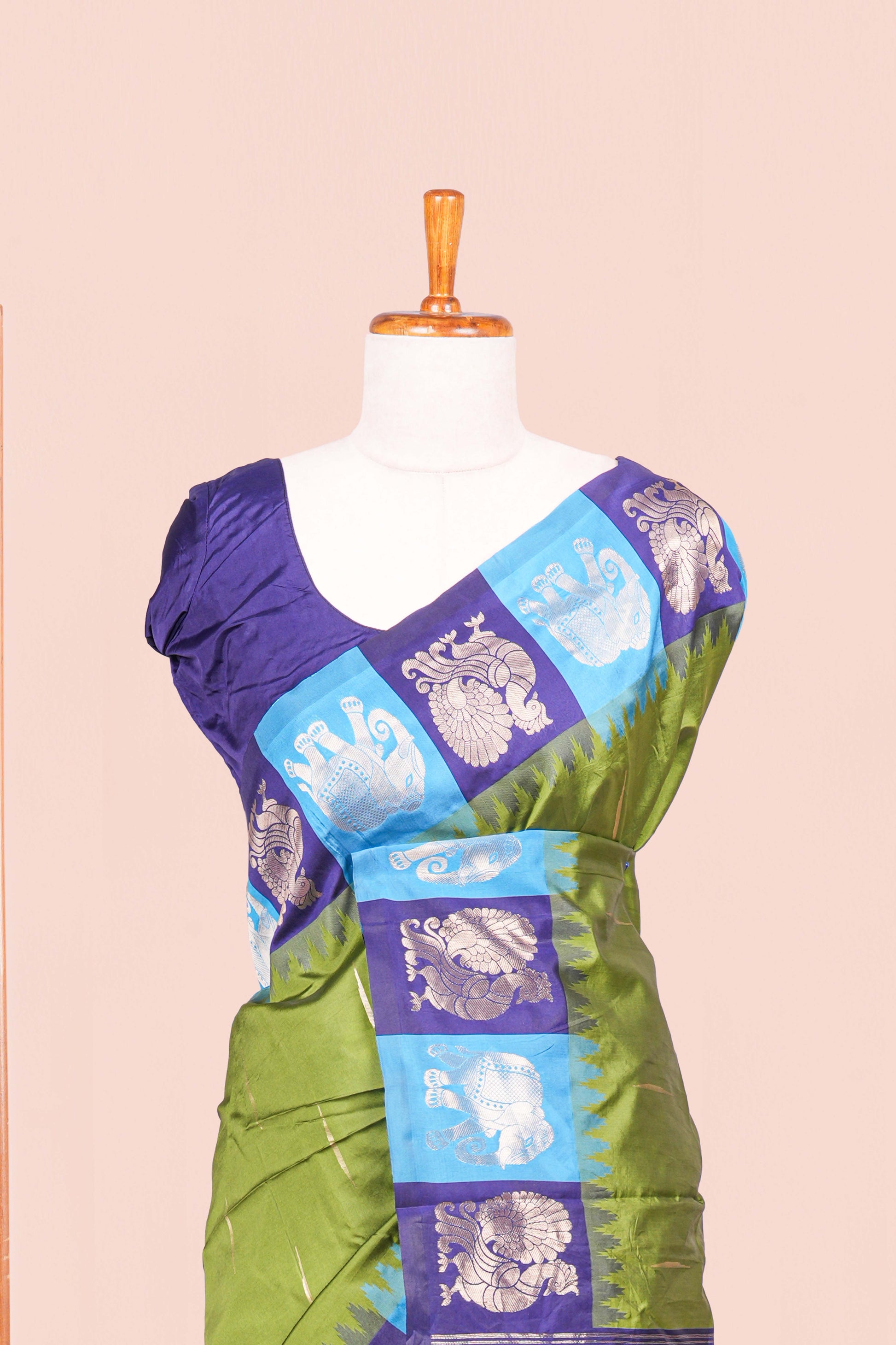 Green Art Silk Saree Body Detailing Zari Butta & Border Are Highlight Contrast Color With Intricate Zari Woven Elephant, Peacock Motifs With Golden Zari Weaving Pallu Along With contrast Blouse