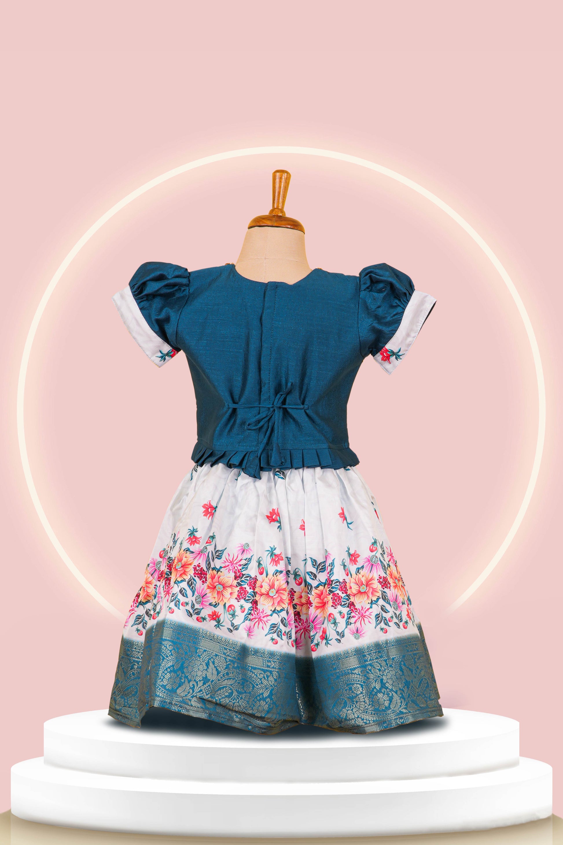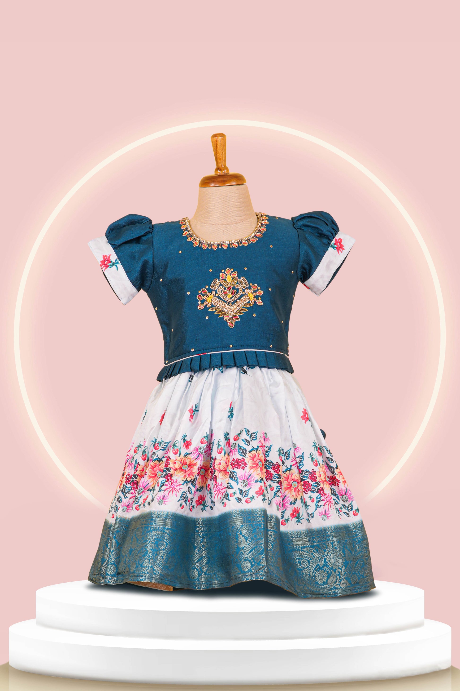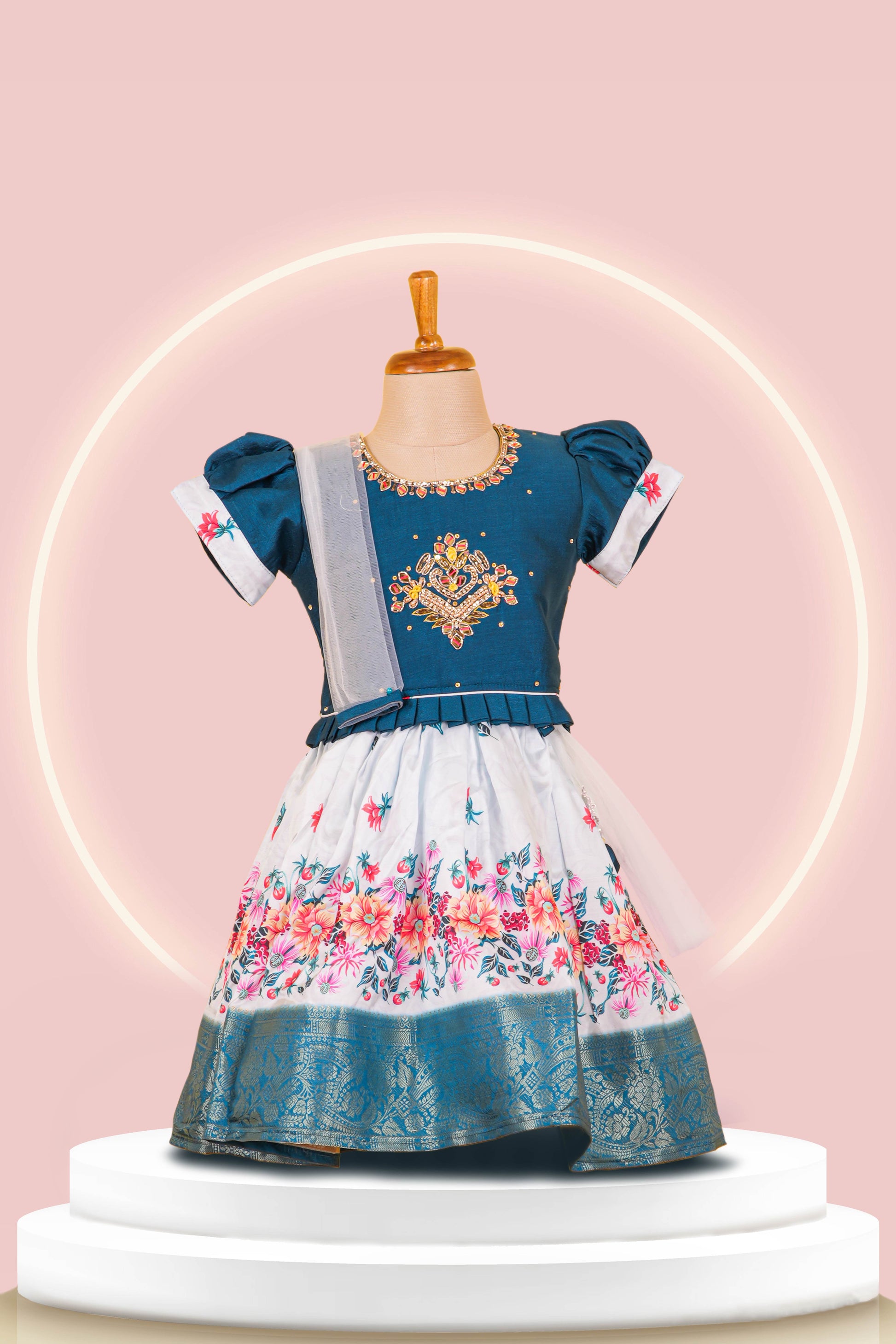 Peacock Blue Choli Lehenga Set Top Stone Embroidery ,Puff Sleeves With Skirt All- Over Floral Print & Net Dupatta