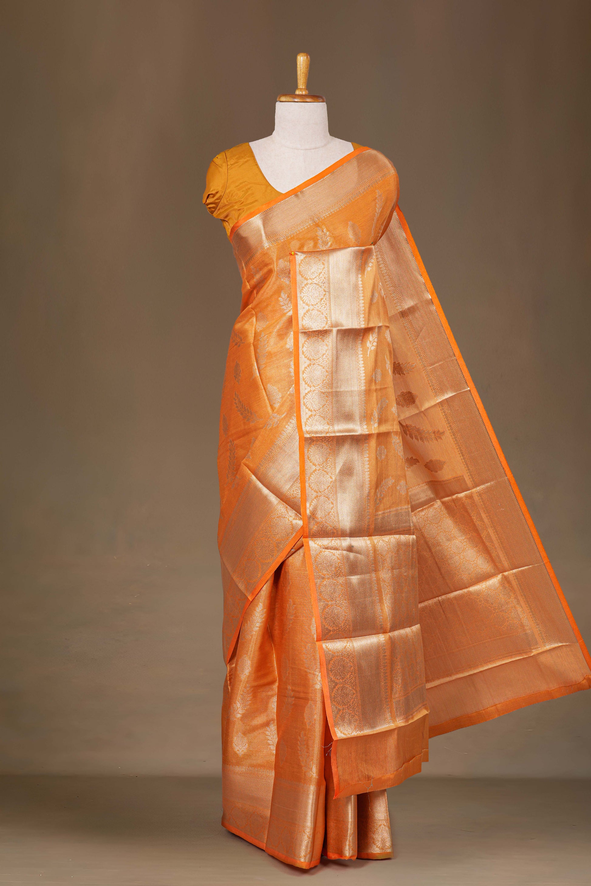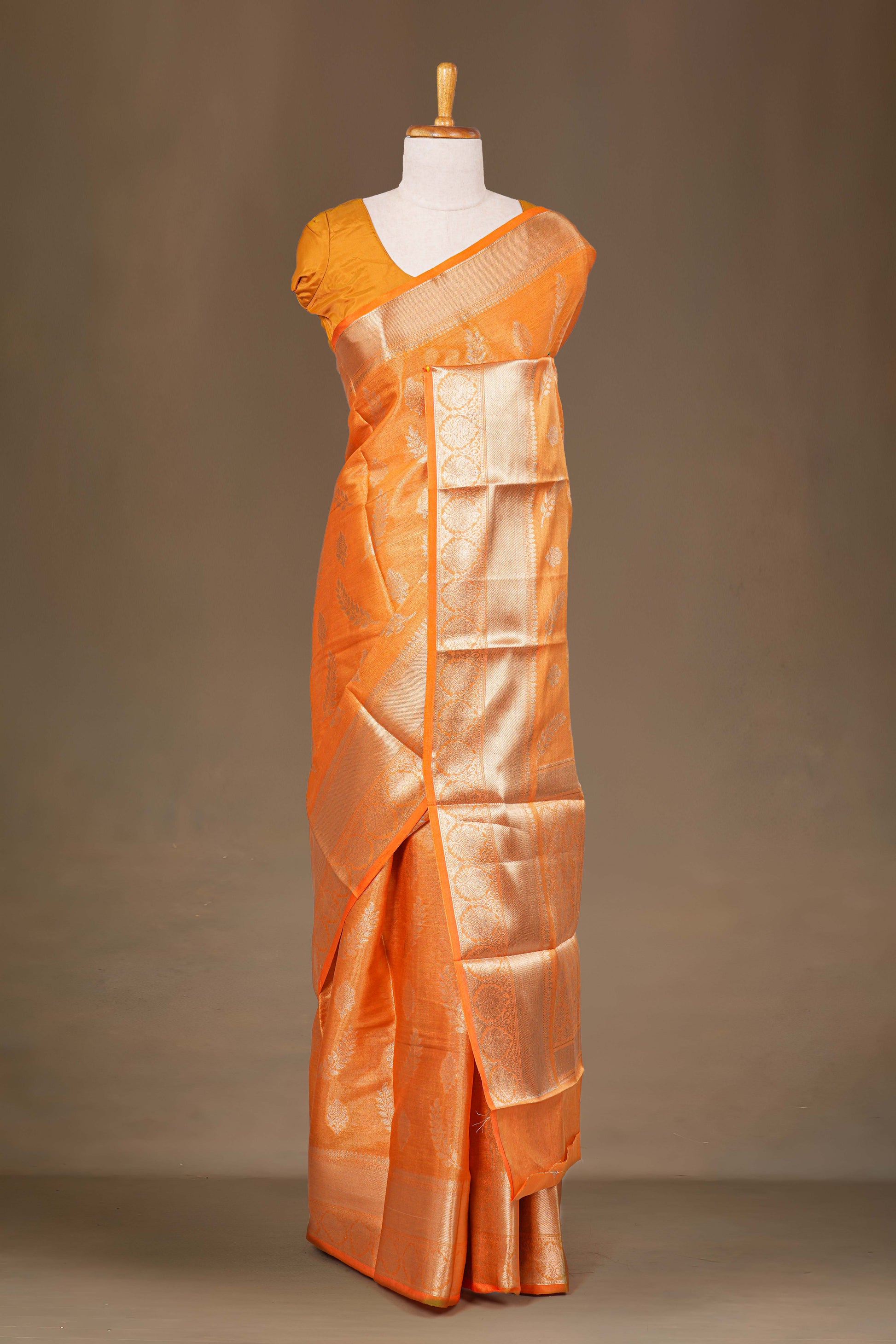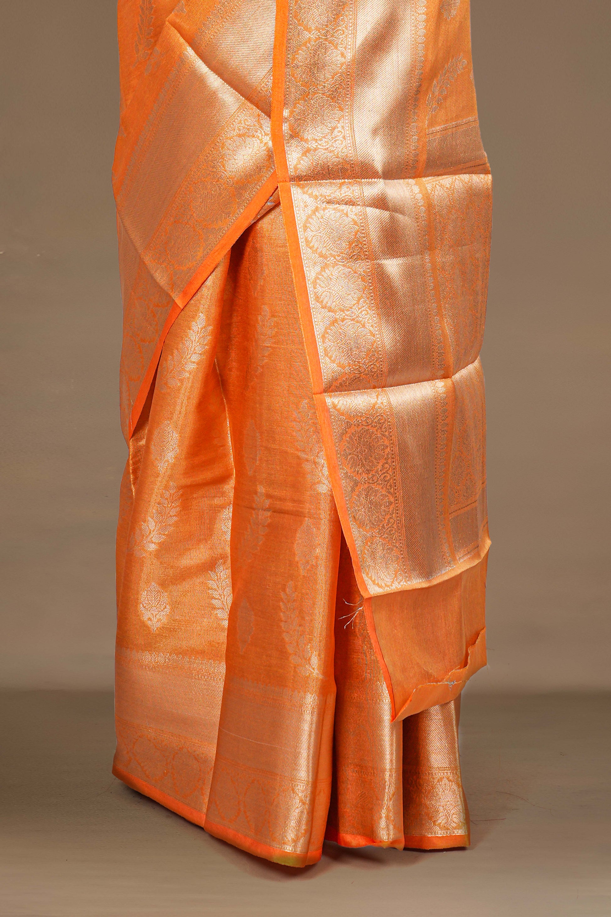 Orange Tissue Silk Saree All-Over Detailing Is Adorned With Subtle Woven Floral & Paisley Motifs. With Broad Zari Border & Rich Gold Zari Weaving Pallu