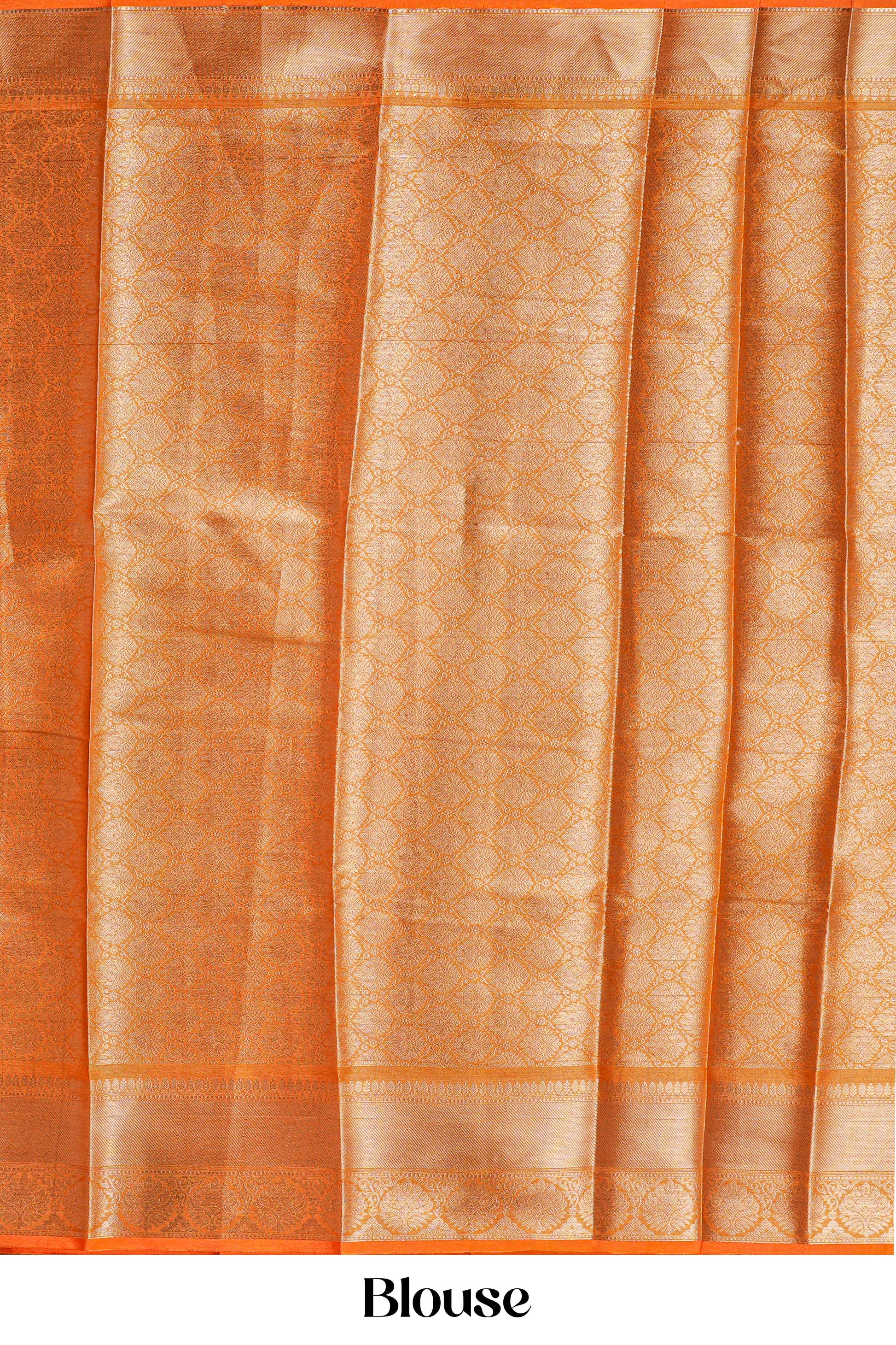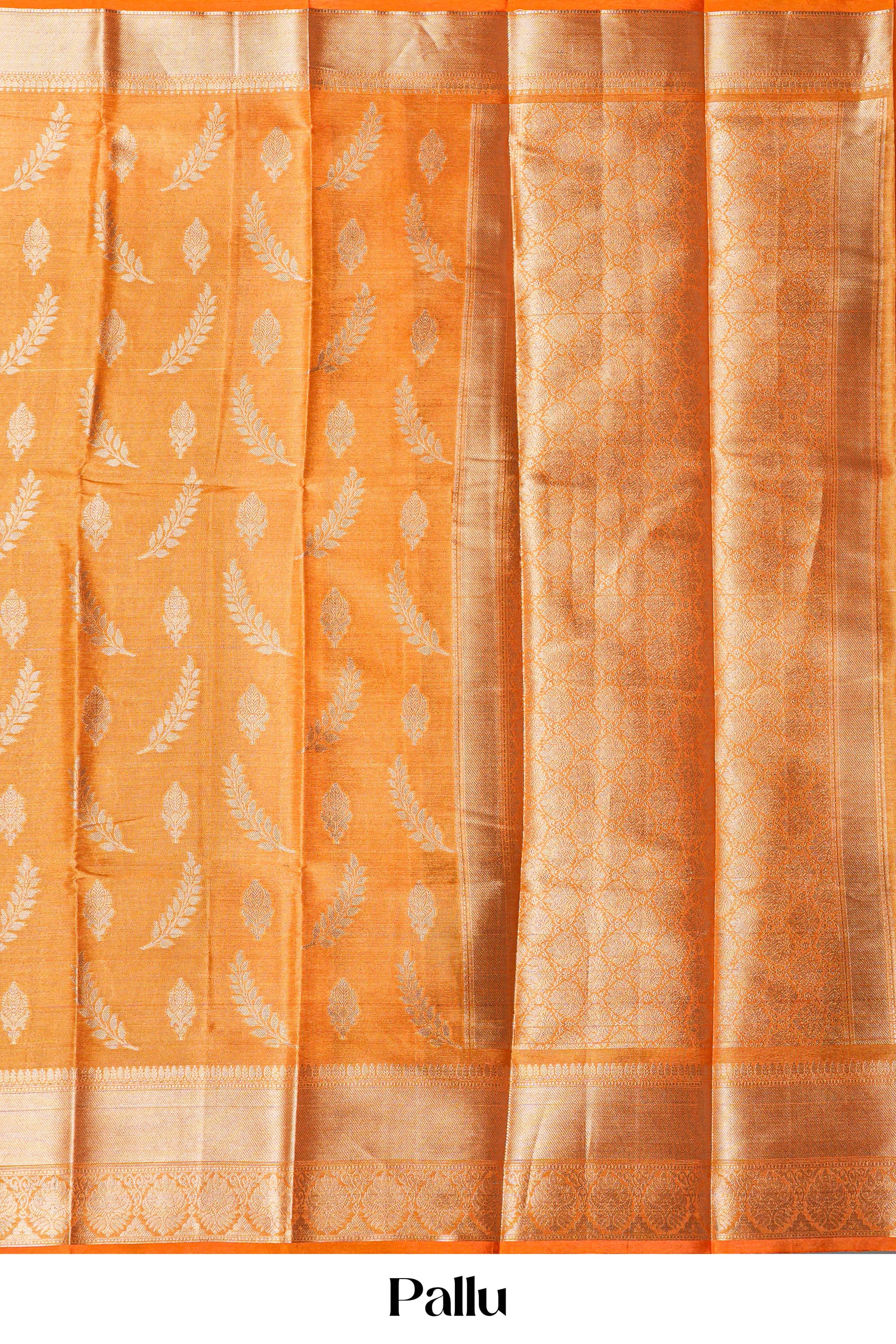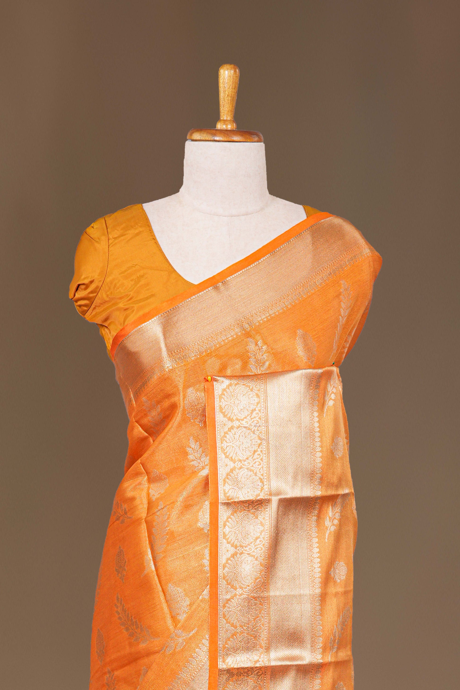Orange Tissue Silk Saree All-Over Detailing Is Adorned With Subtle Woven Floral & Paisley Motifs. With Broad Zari Border & Rich Gold Zari Weaving Pallu