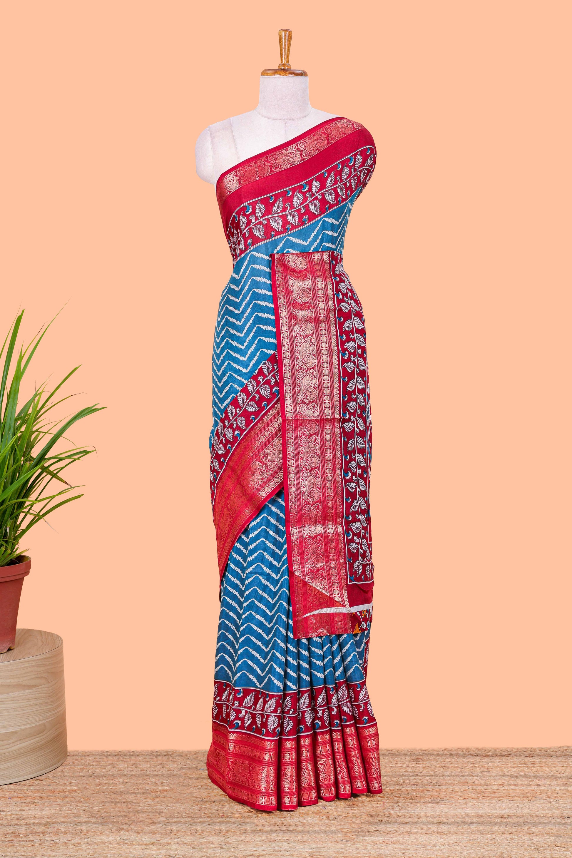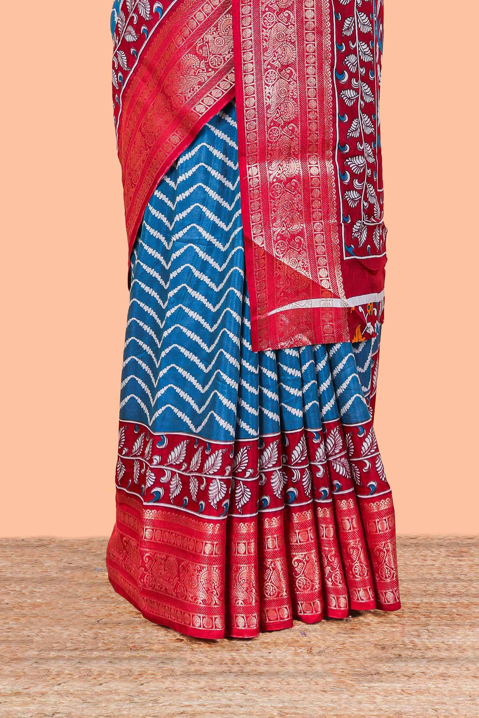 Turkish Blue Tusser Silk Geometrical Design With Jacquard Border