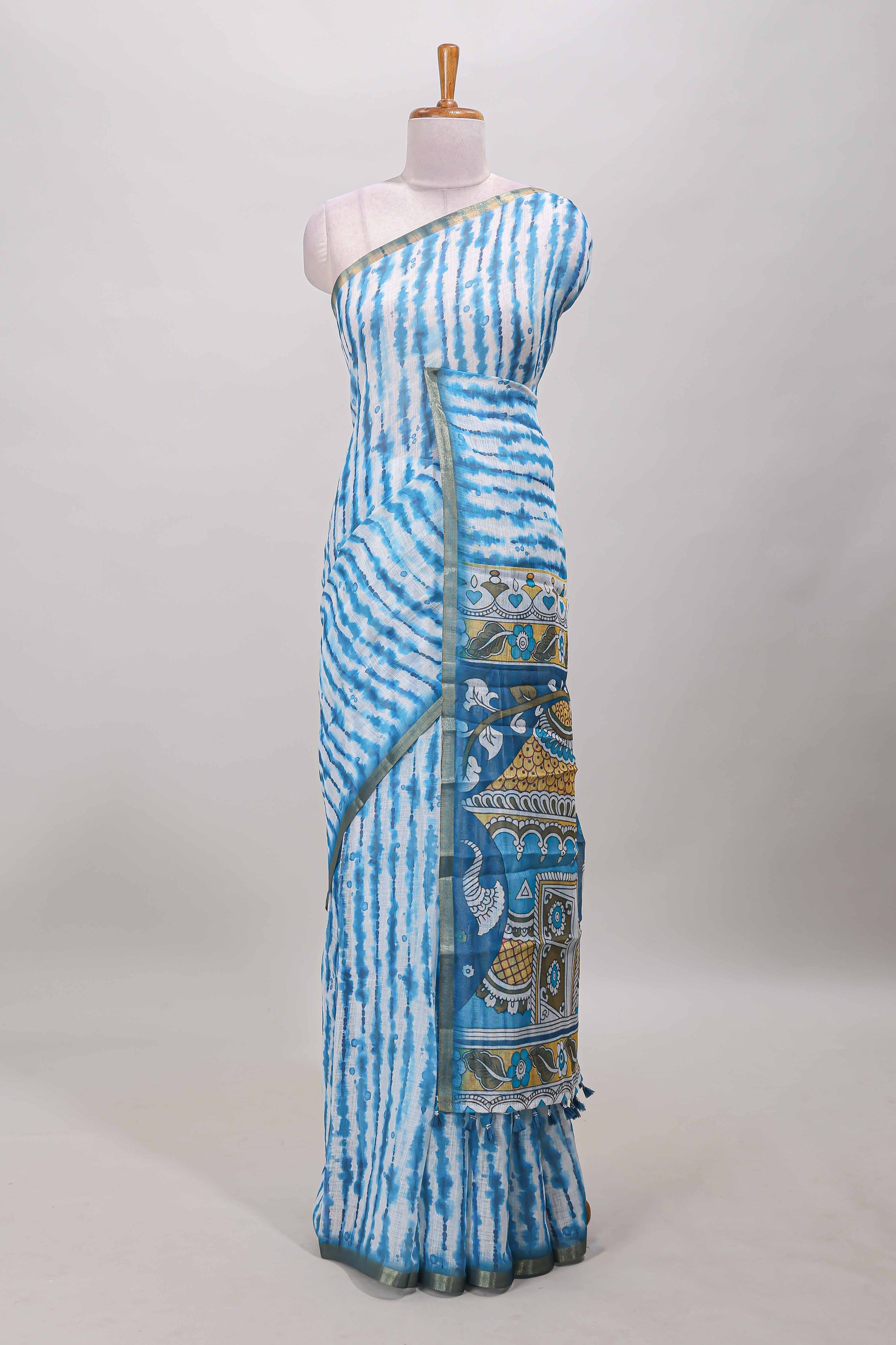 Turquoise blue striped shibori print linen cotton saree with self zari border and printed pallu