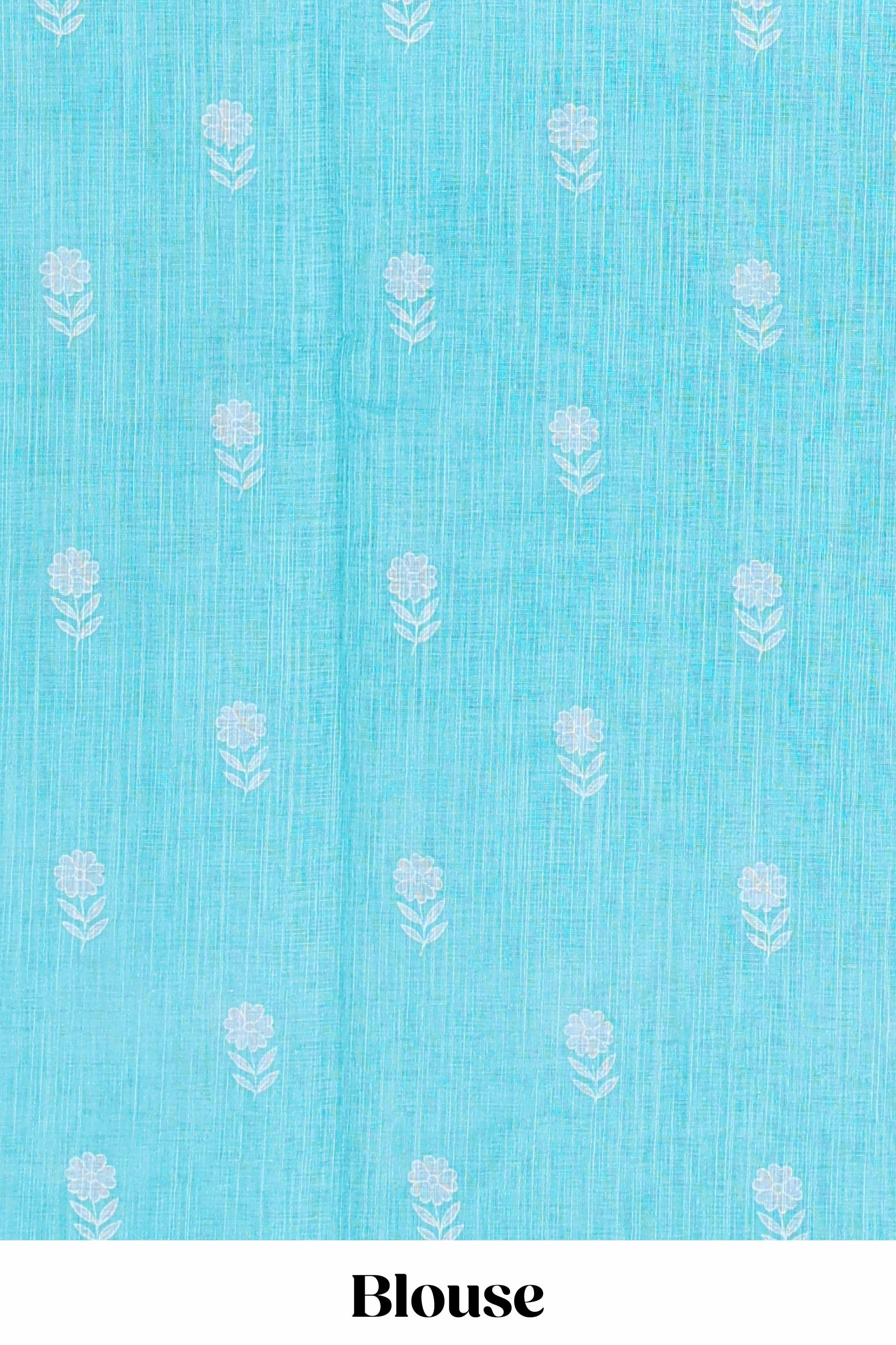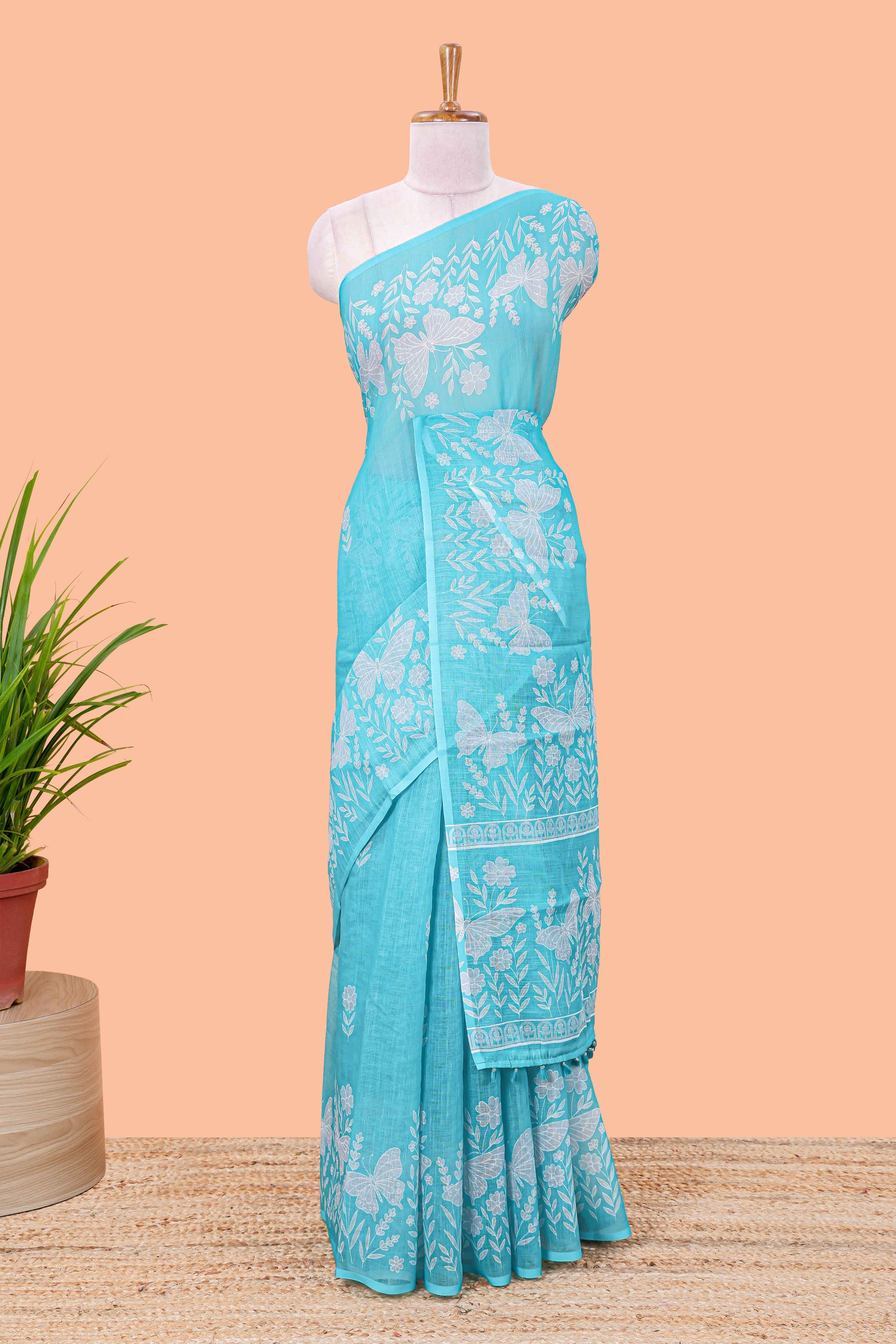 Turquoise green linen cotton saree with floral buttas and butterfly motifs border, Printed self pallu and blouse