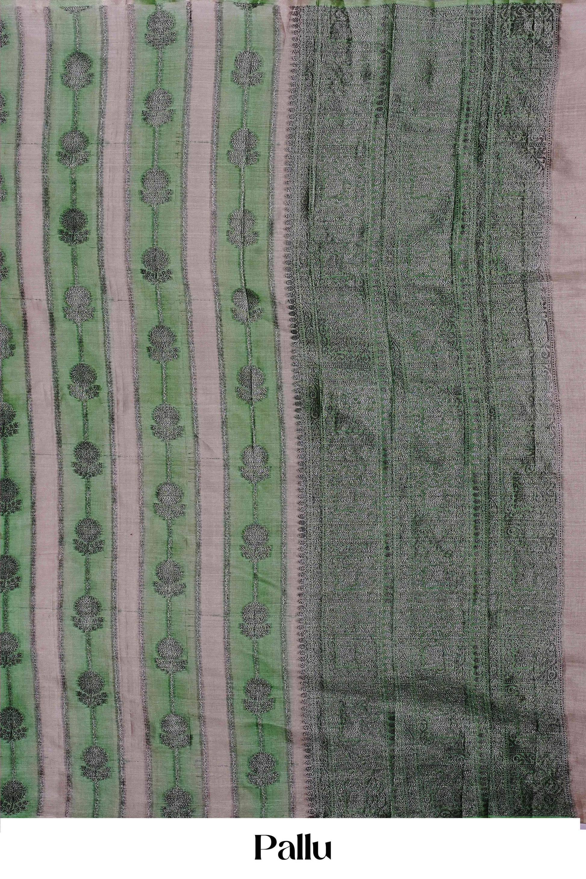 Exquisite Pure Tussar Silk Saree in Fresh Green with Silver Zari Stripes, Intricate Self-Colour Floral Butta Motifs, and Elegant Traditional Drape