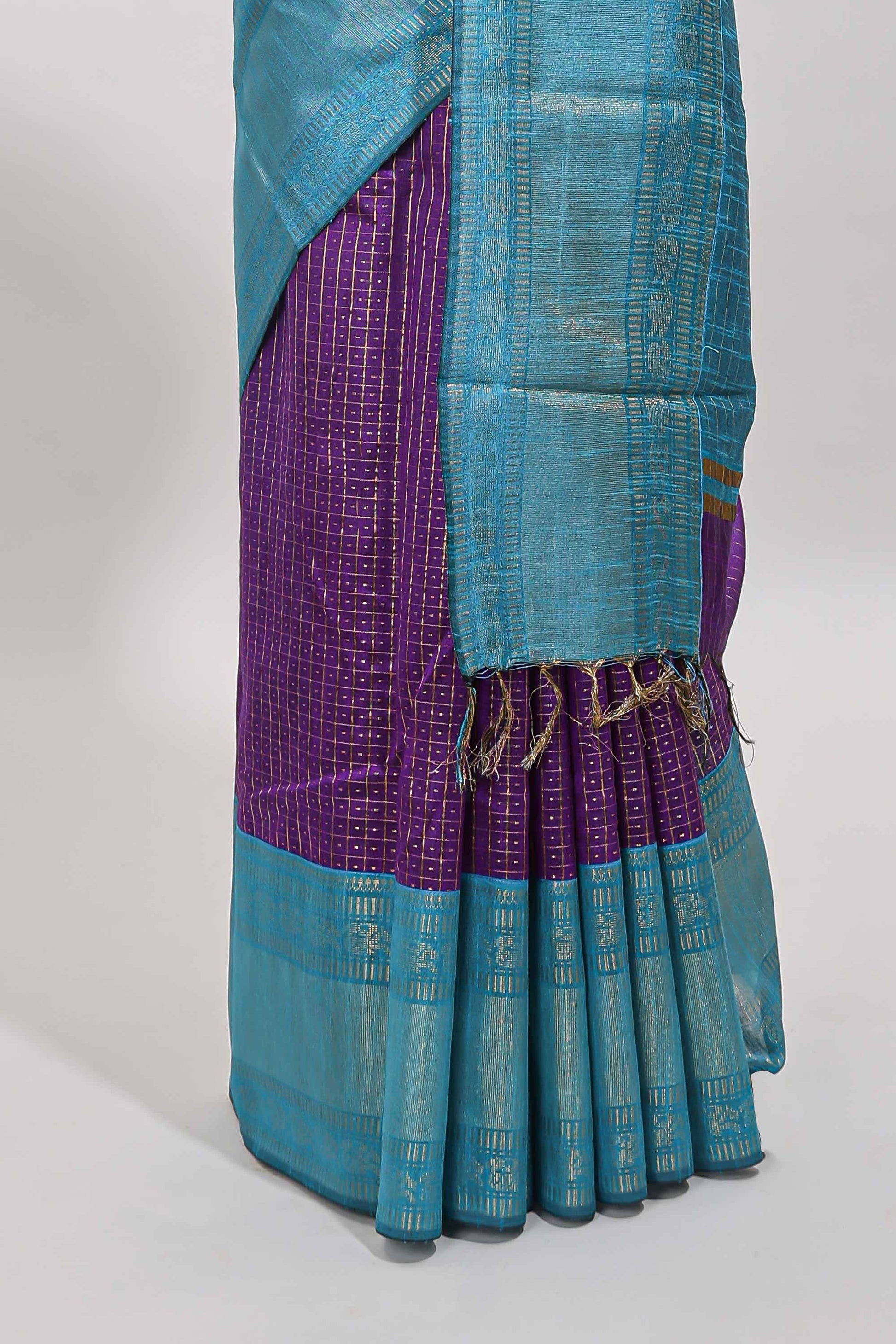 Violet checked tussar saree with contrast blue zari border and checked blouse