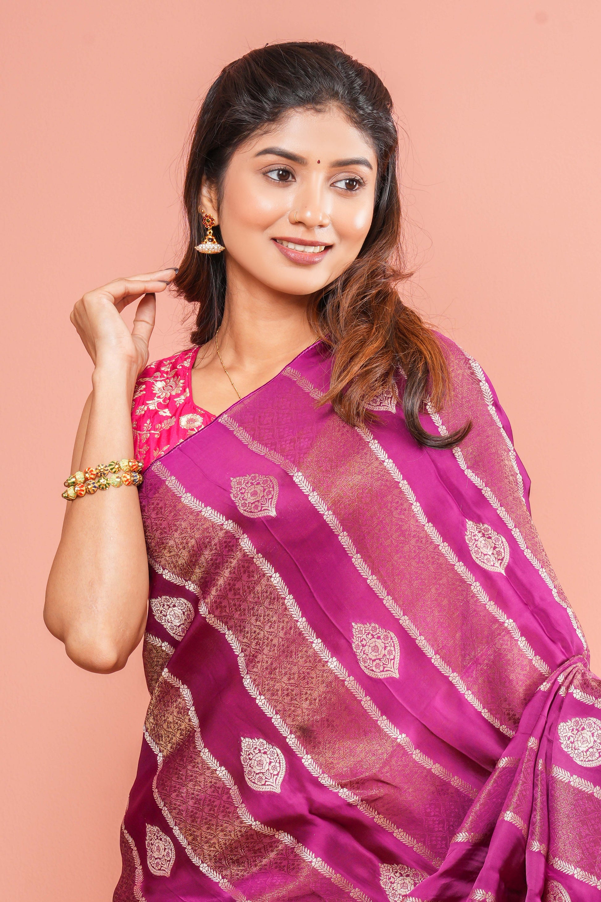 Purple Viscose Georgette Saree Vertical Stripes Woven, Paisley Style Motifs Across The Body & Floral Creeper Design Weaving Pallu Along With Blouse