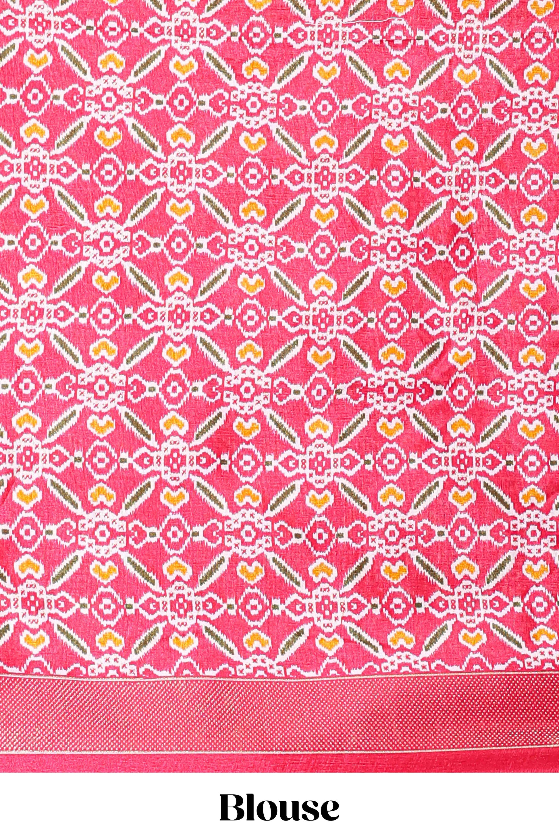 White dola silk floral lehenga with pink pochampalli border and floral butta dhavani