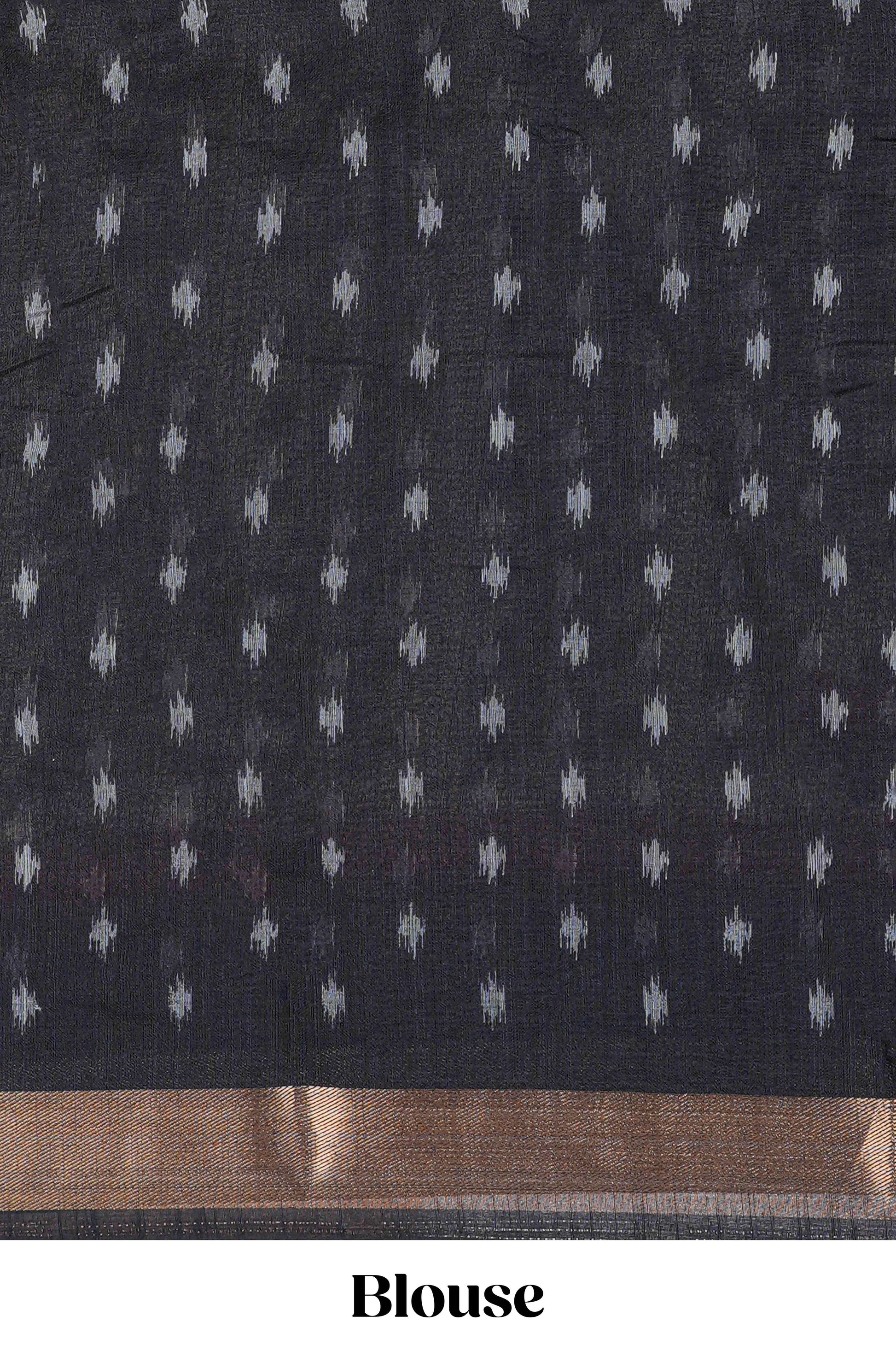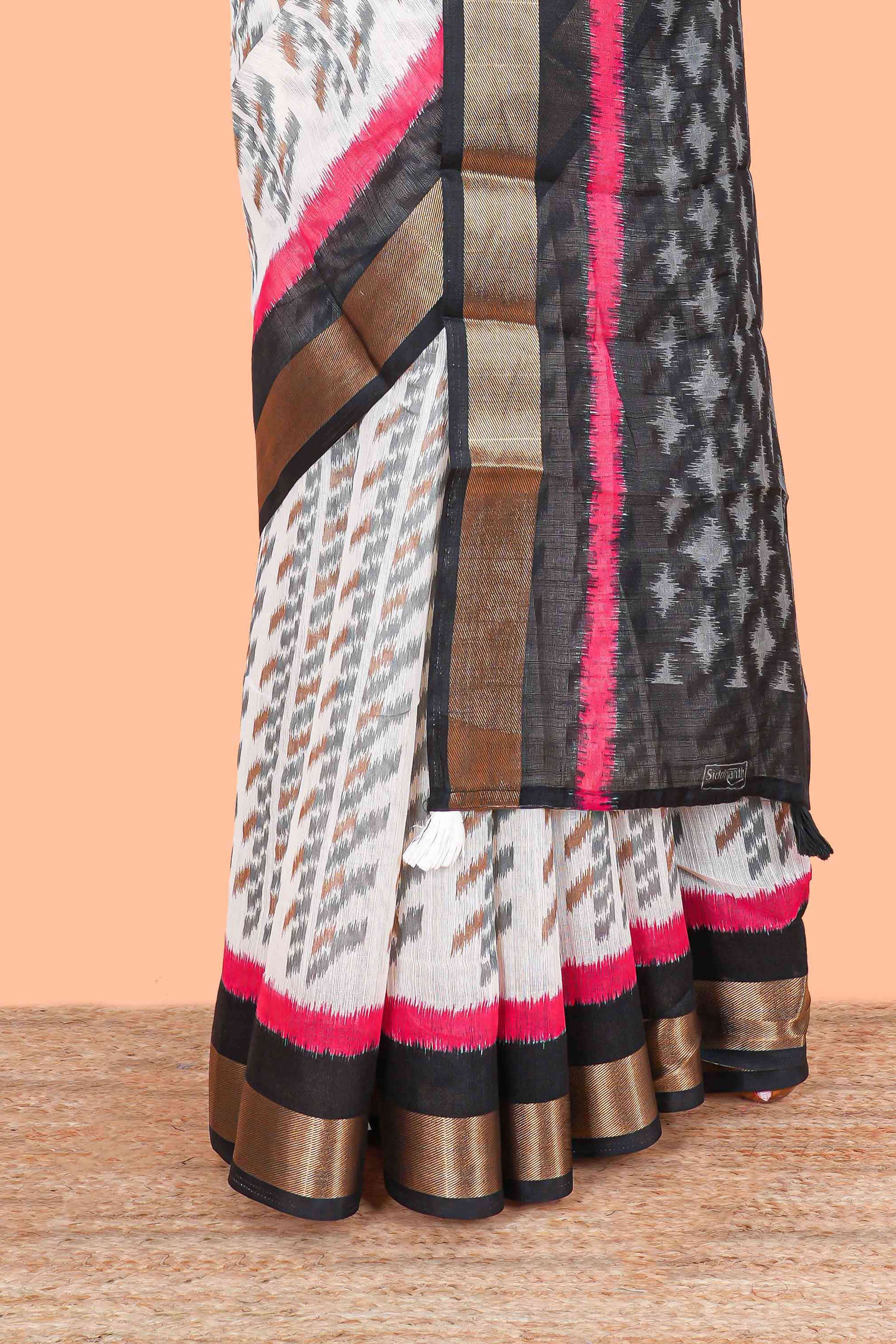 White geomentric ikkat style linen cotton saree with contrast black border and pallu