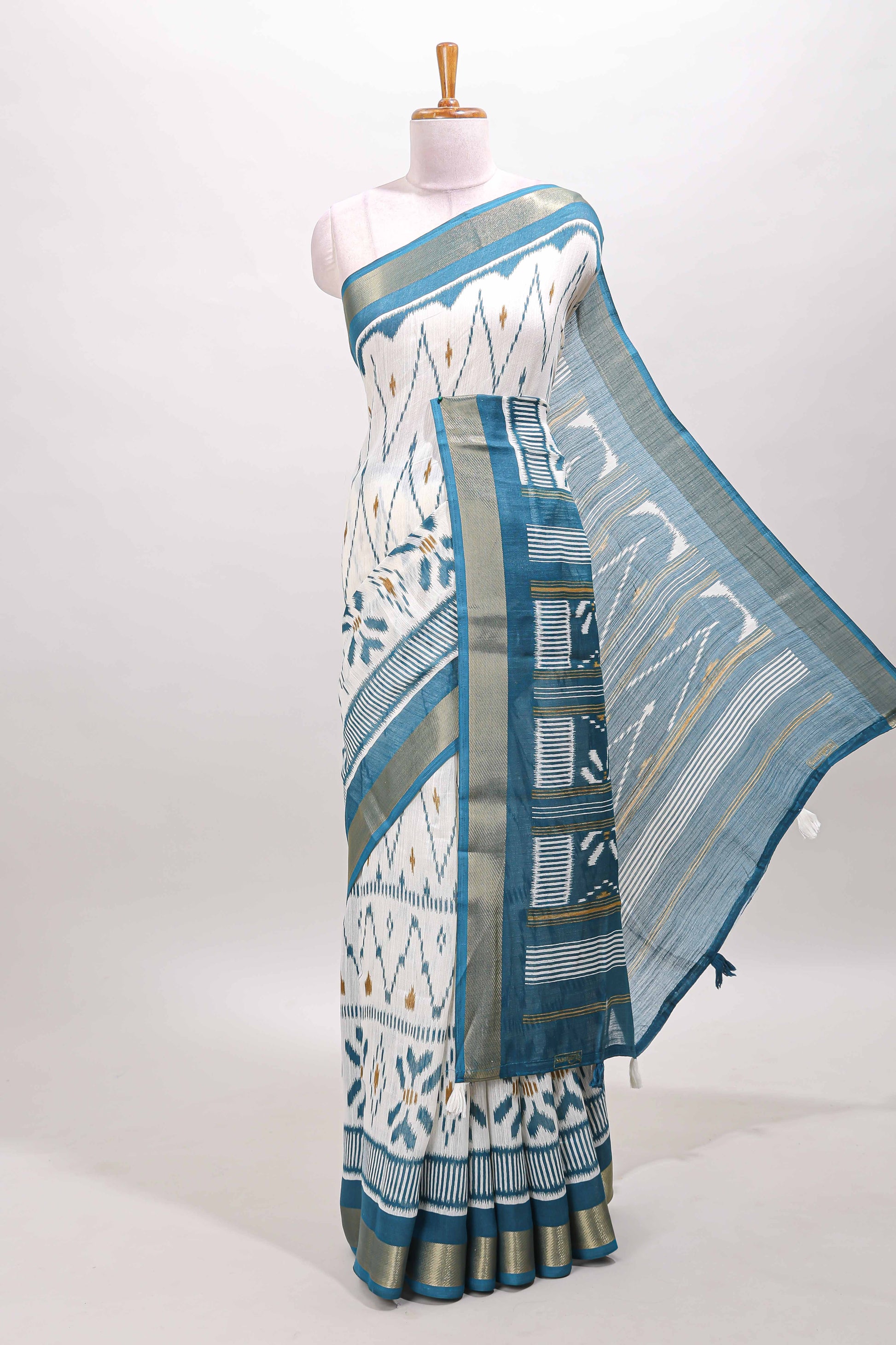 White geometric design ikkat style linen cotton saree with contrast border and striped blouse
