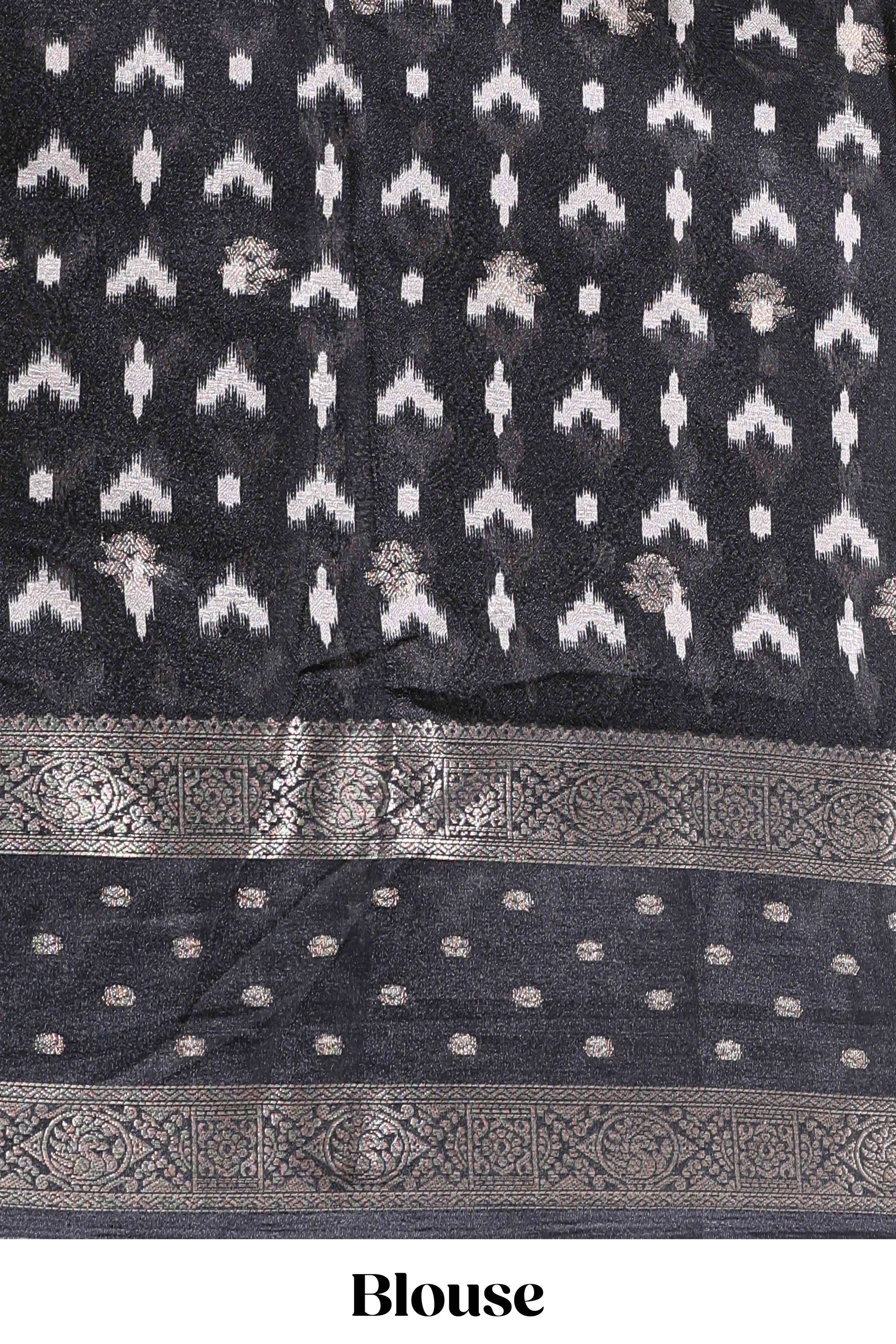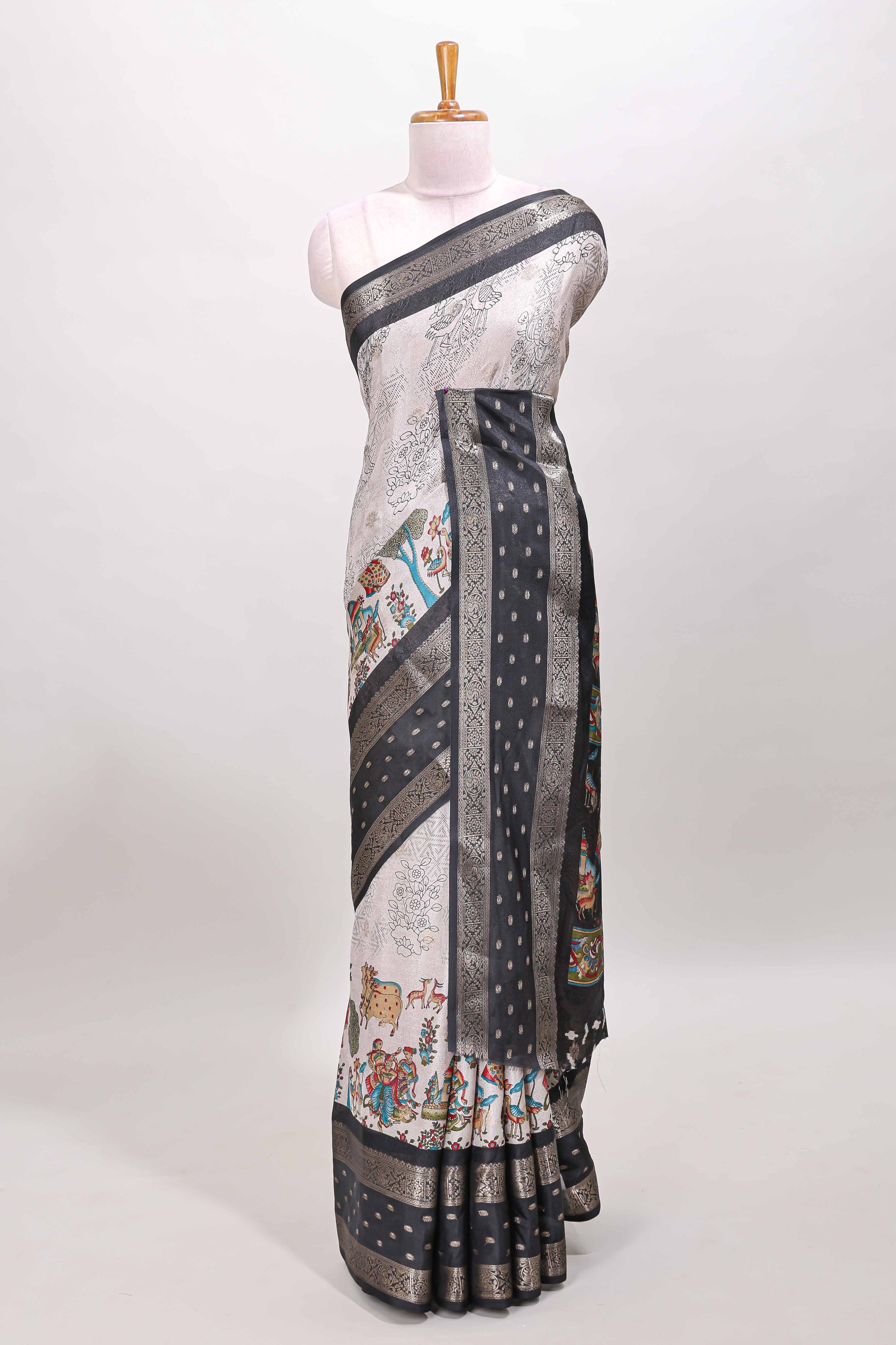 White traditional kalamkari themed marsh georgette saree with contrast black bentex zari border and pallu