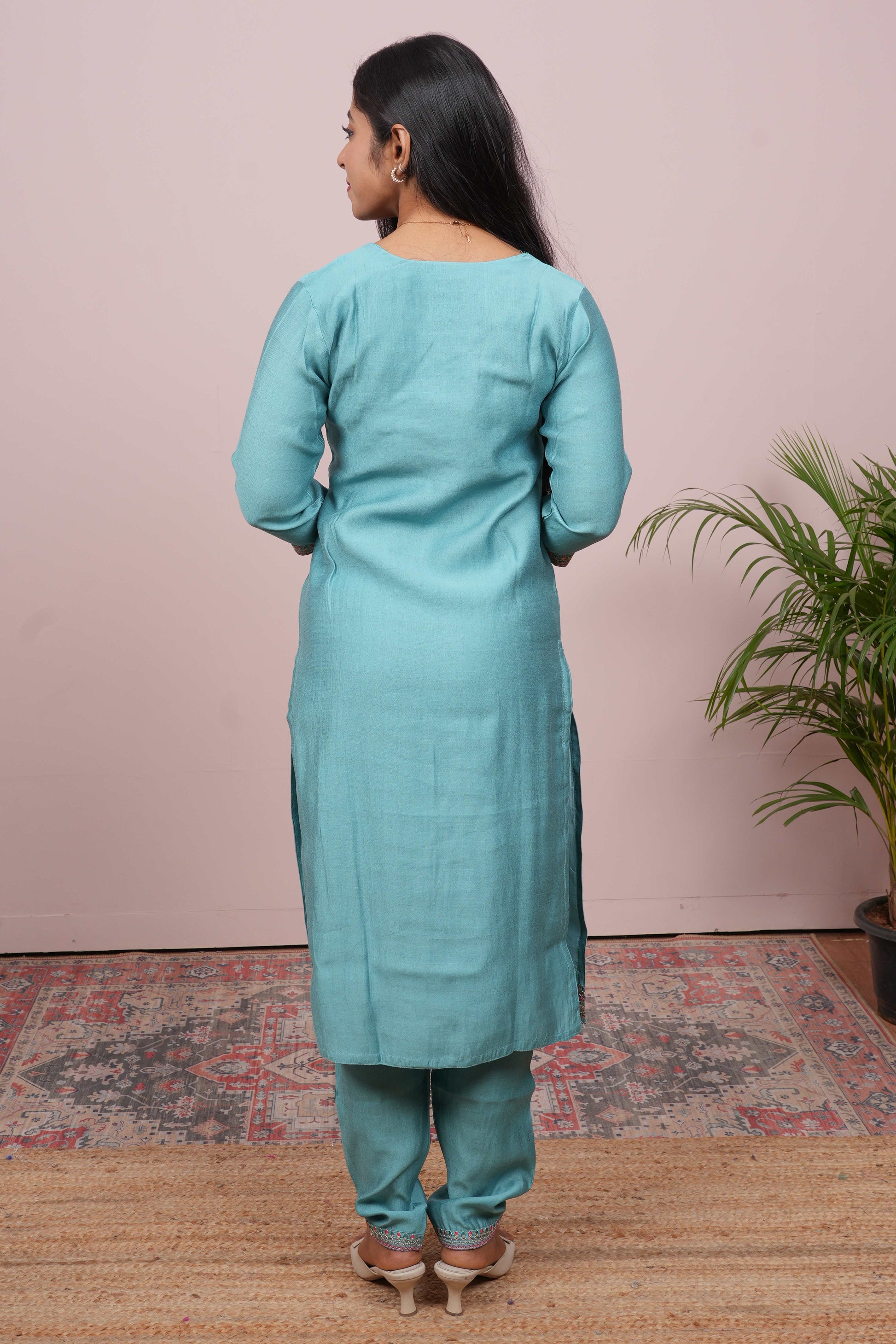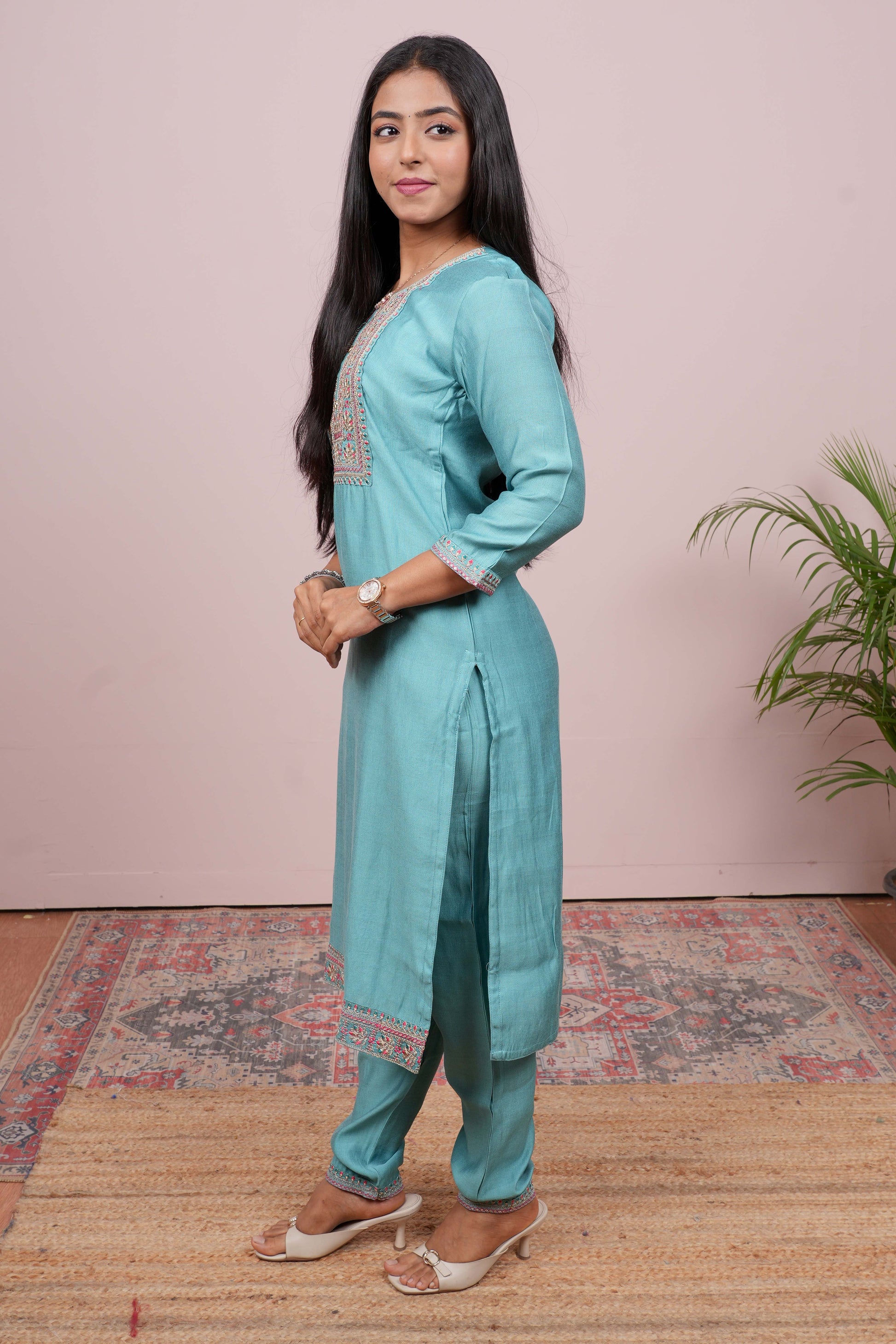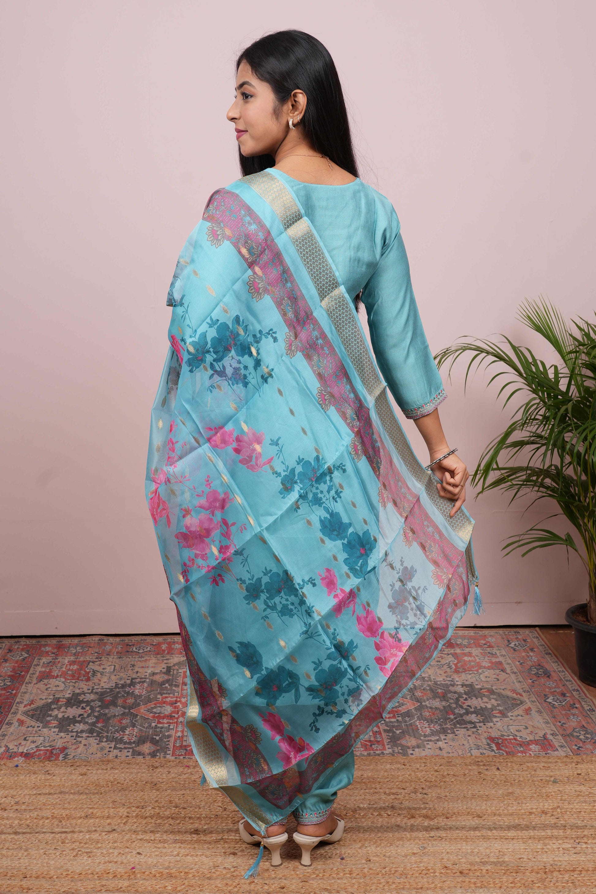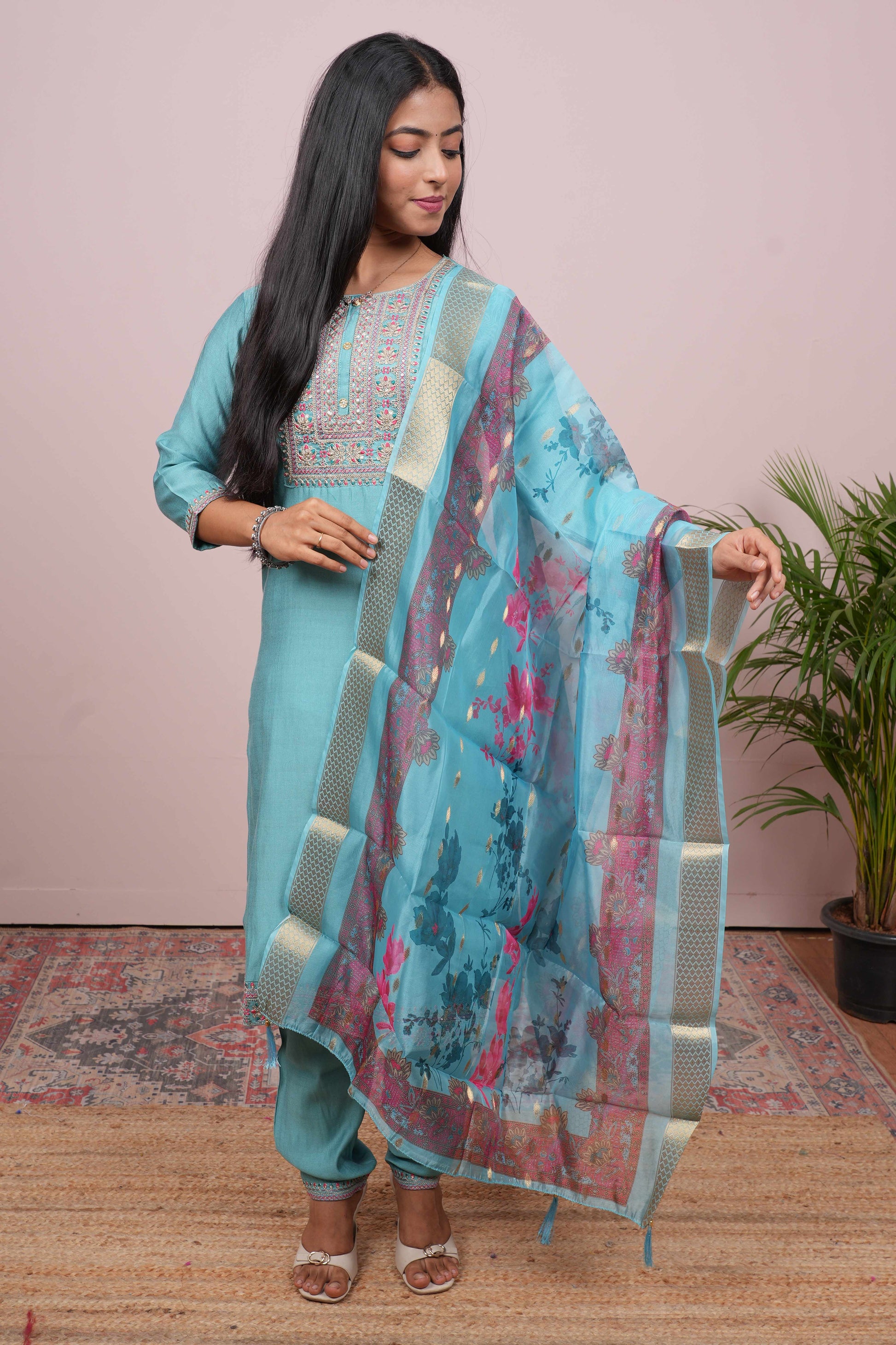A Rich Turquoise Blue Straight - Cut Salwar Set Round Neckline & Multi Colour Thread Embroidery Is Featured On The Yoke With Side Slits Paired With Floral Design Dupatta