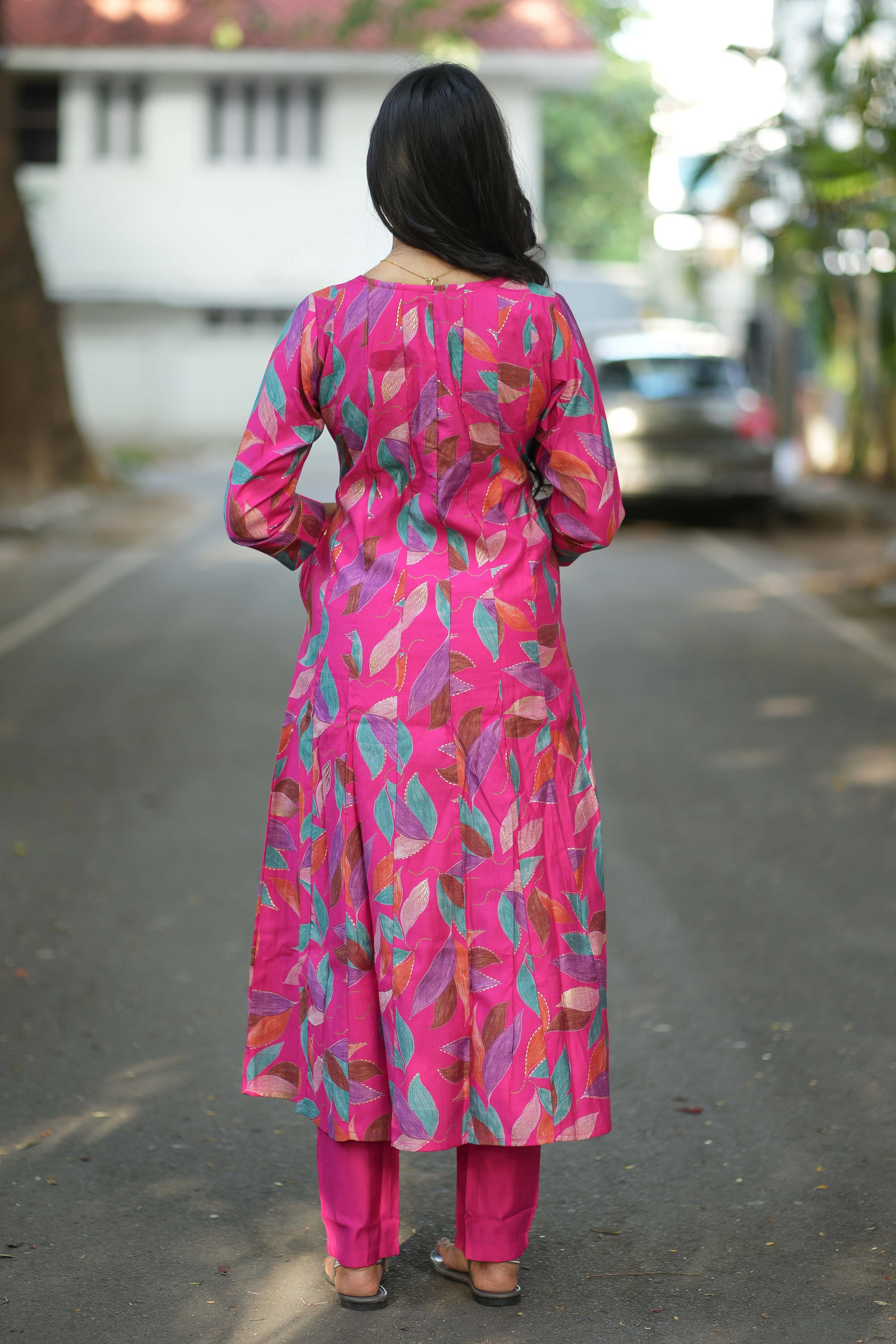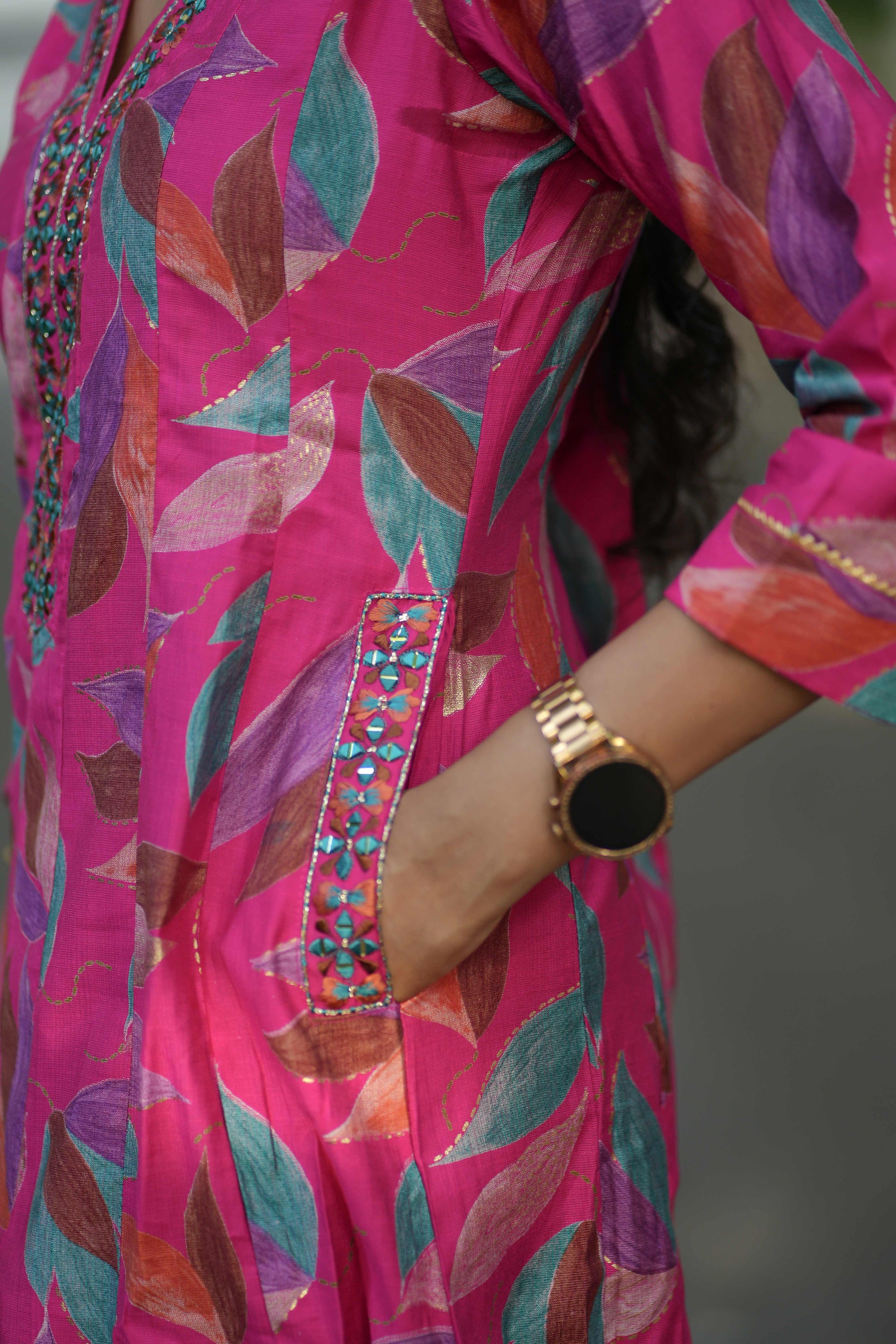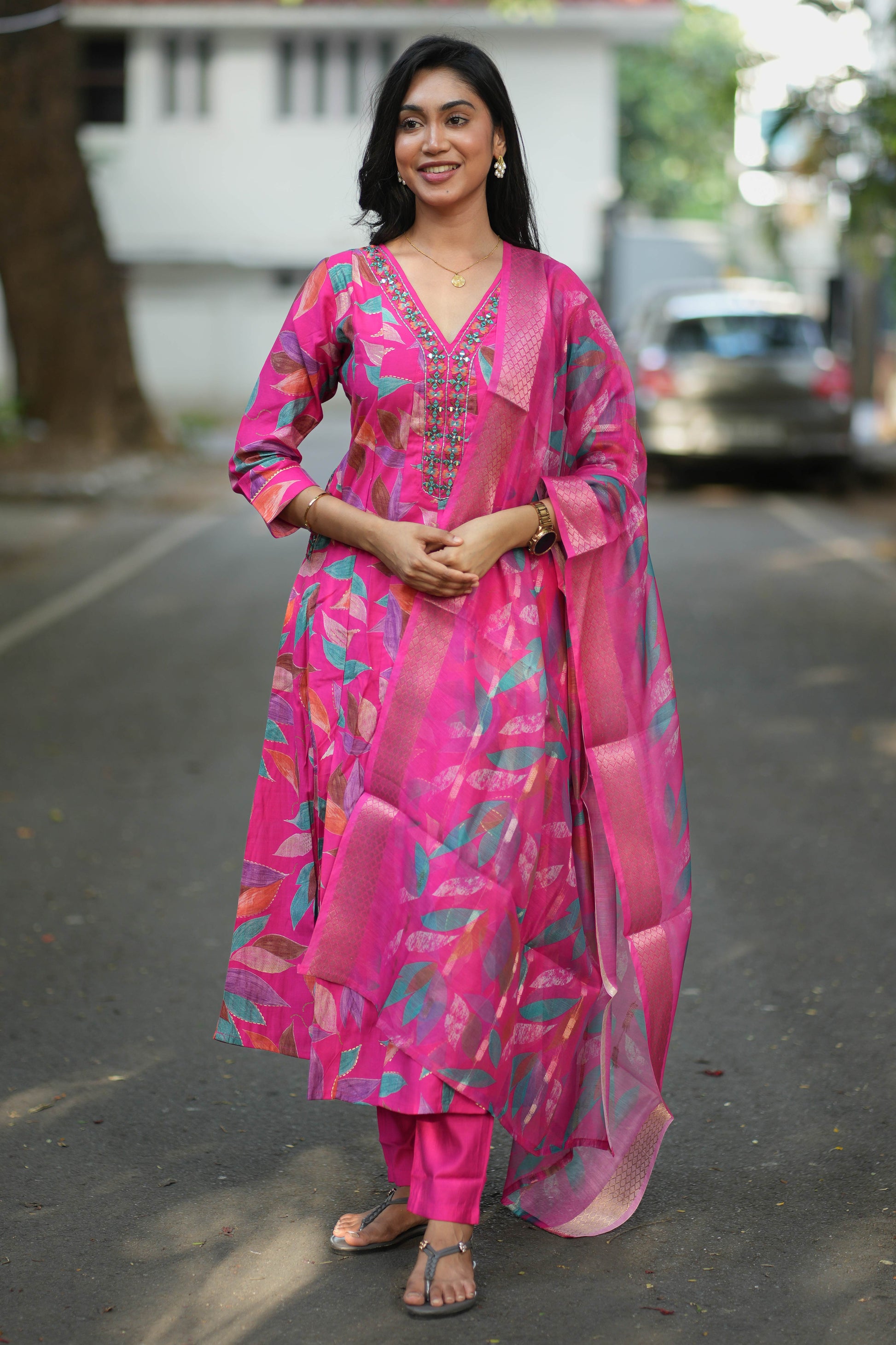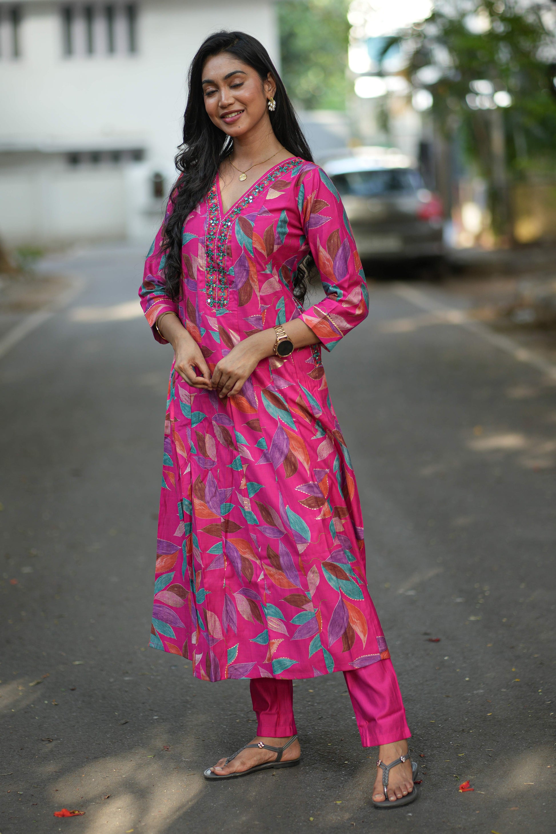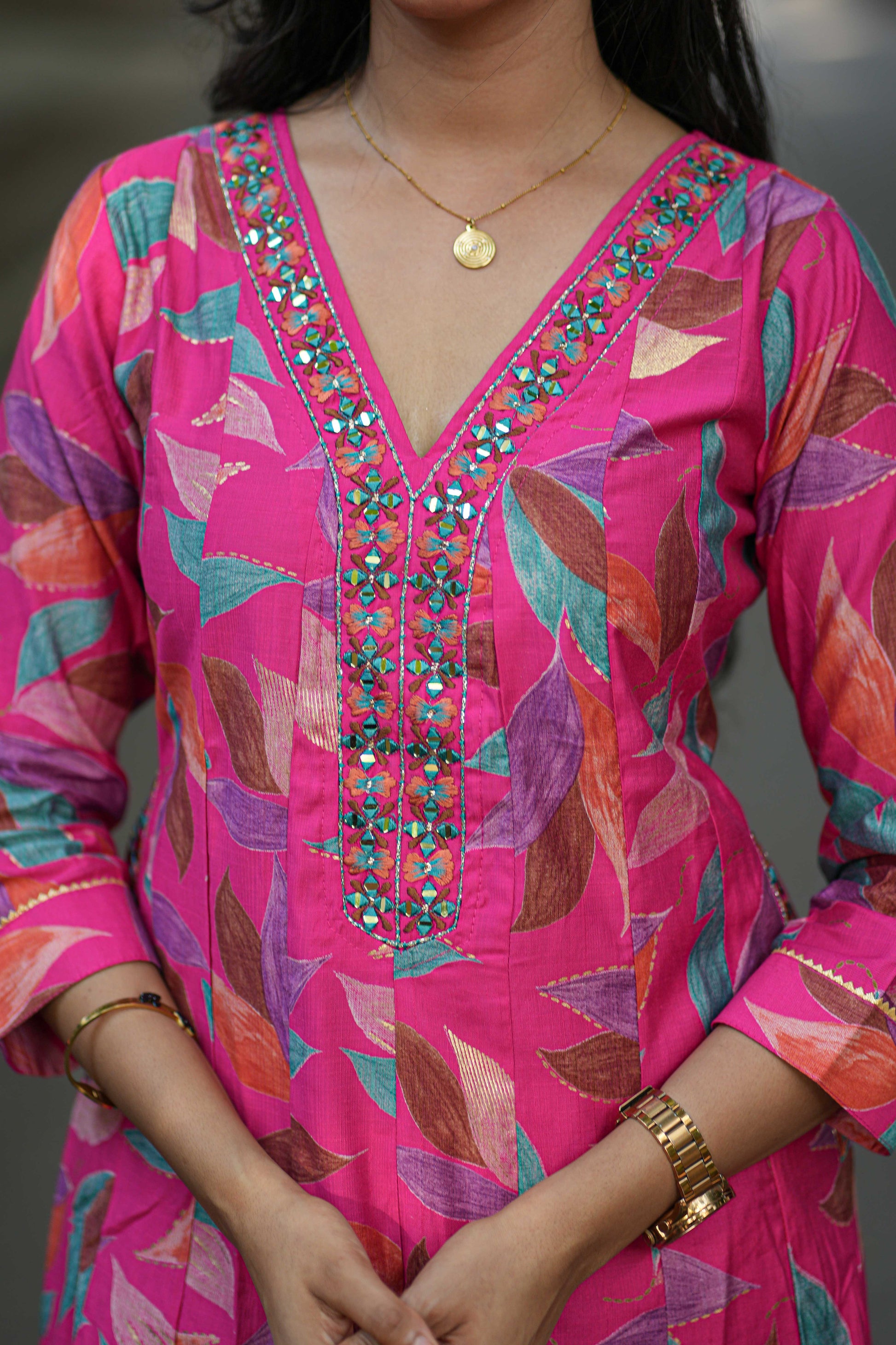 Pink A -Line Kurti Set. Flared Deep V-Neck With a Beautifully Embellished Border Featuring Intricate Embroidery and Mirror Work. Body Detailing Multi Colour Leaf Design. Matching Dupatta With a Woven Zari Border