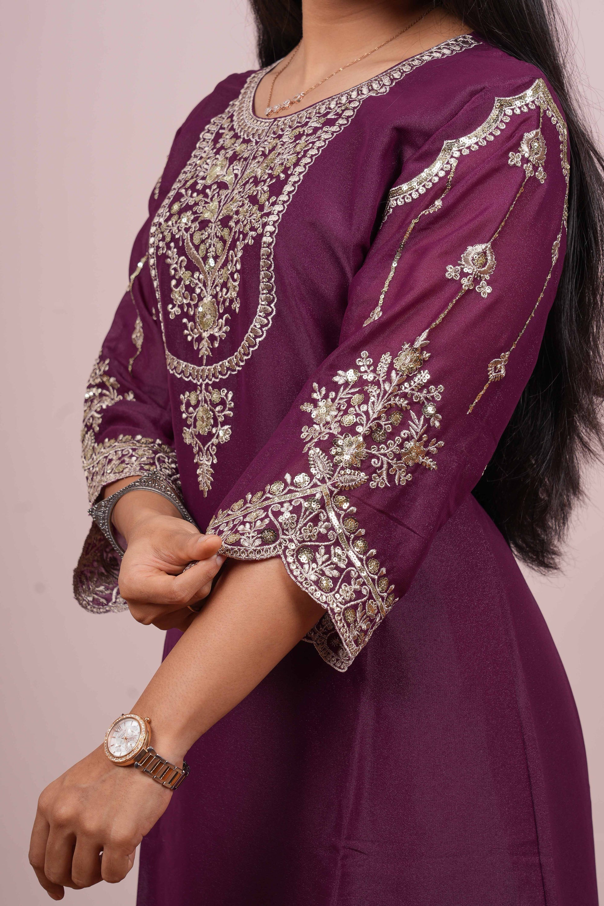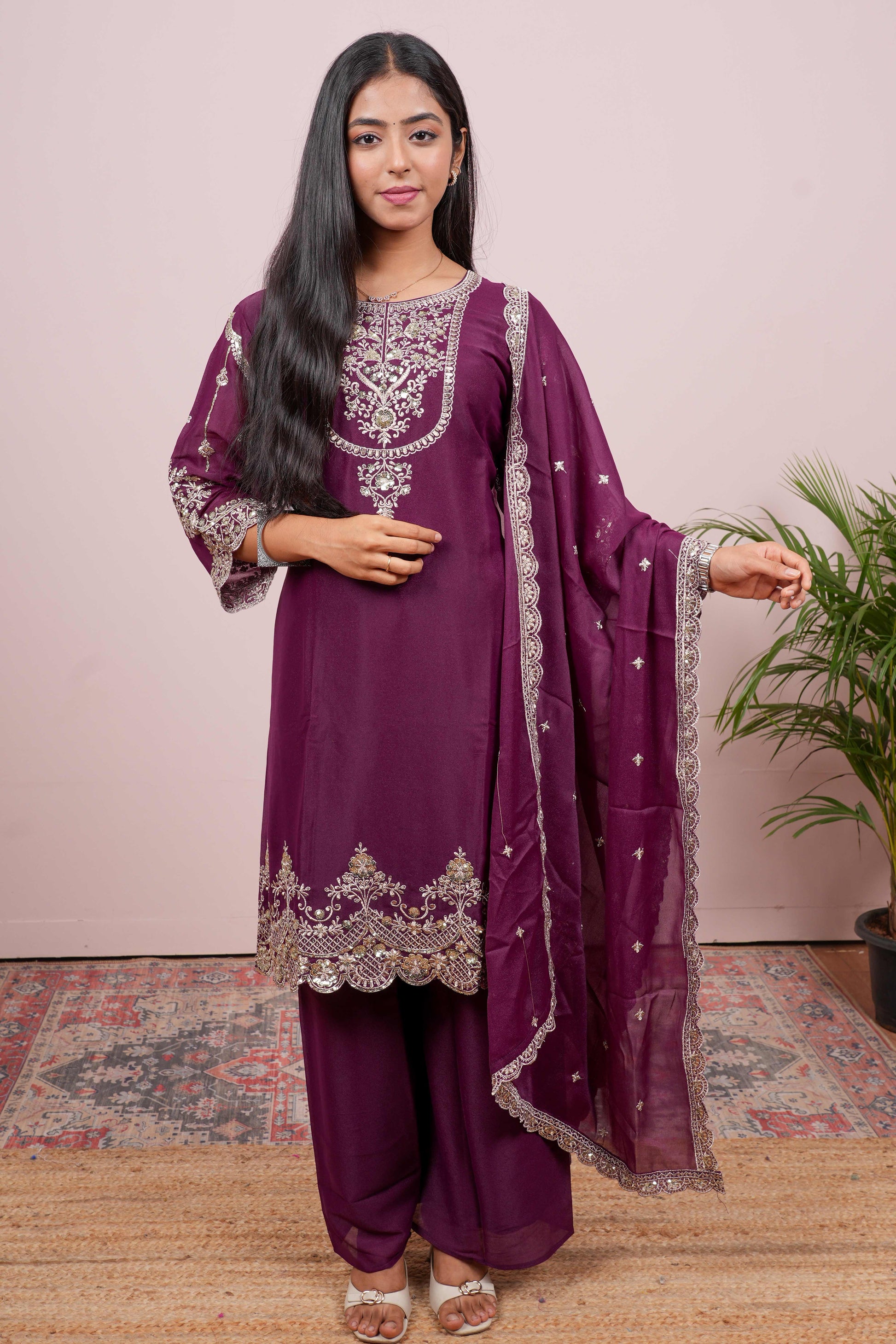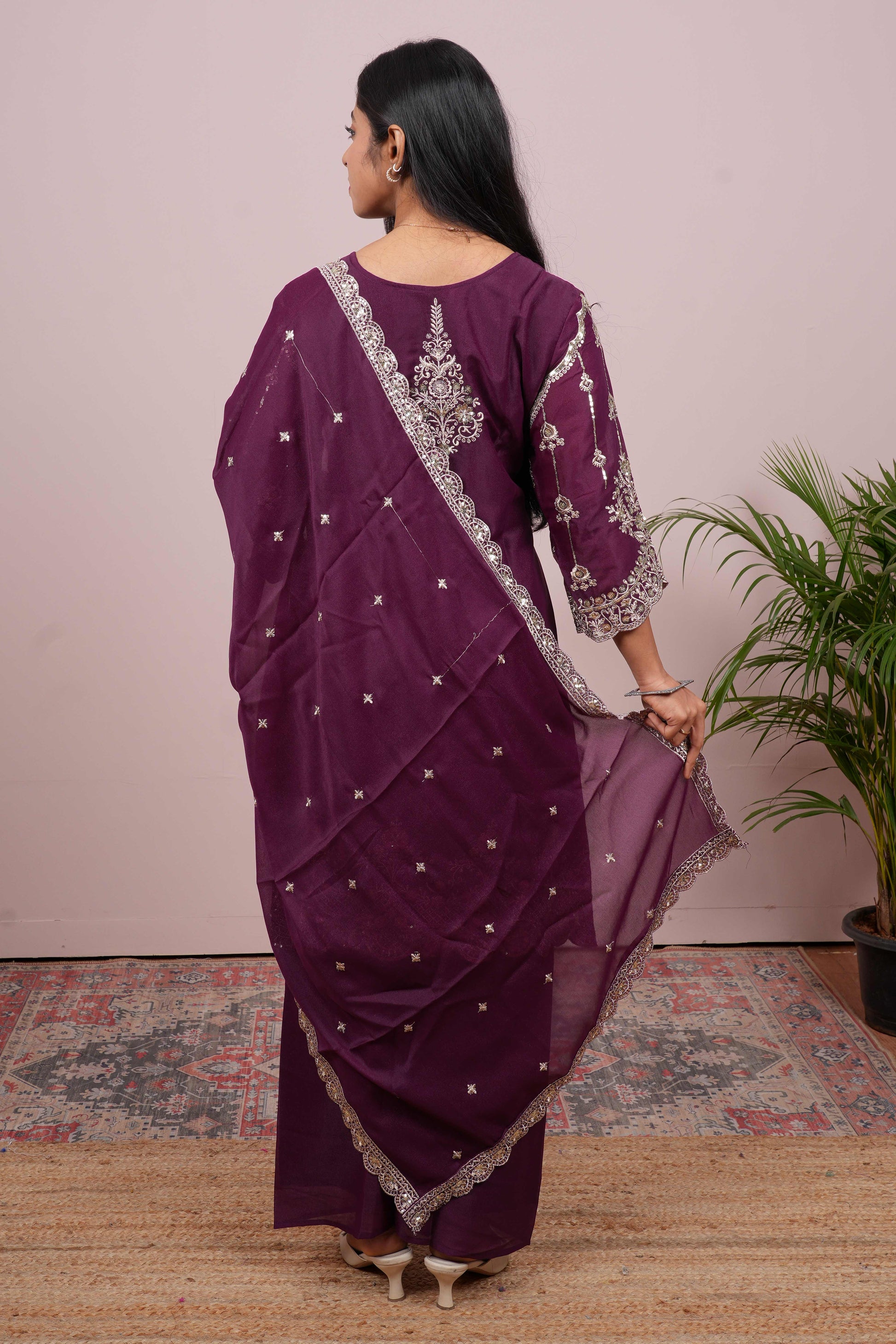 Wine Purple Straight - Cut Salwar Set Round Neck Line With a U-shape Gold Zari Embroidery, sequins & Matching Sheer Dupatta With Gold Zari Embroidery