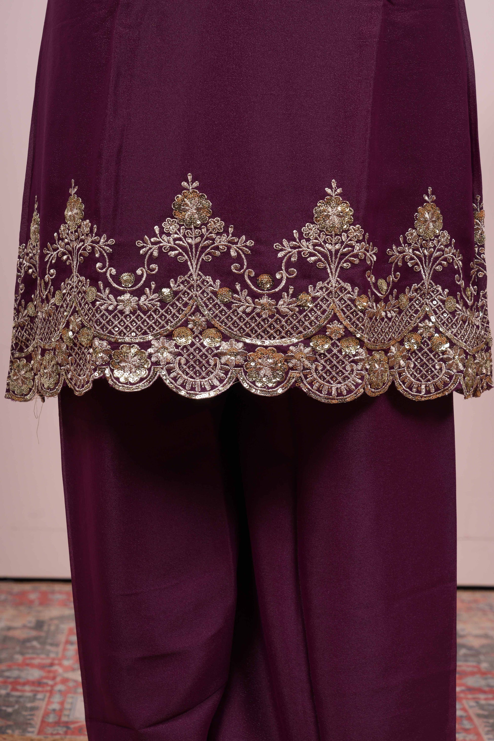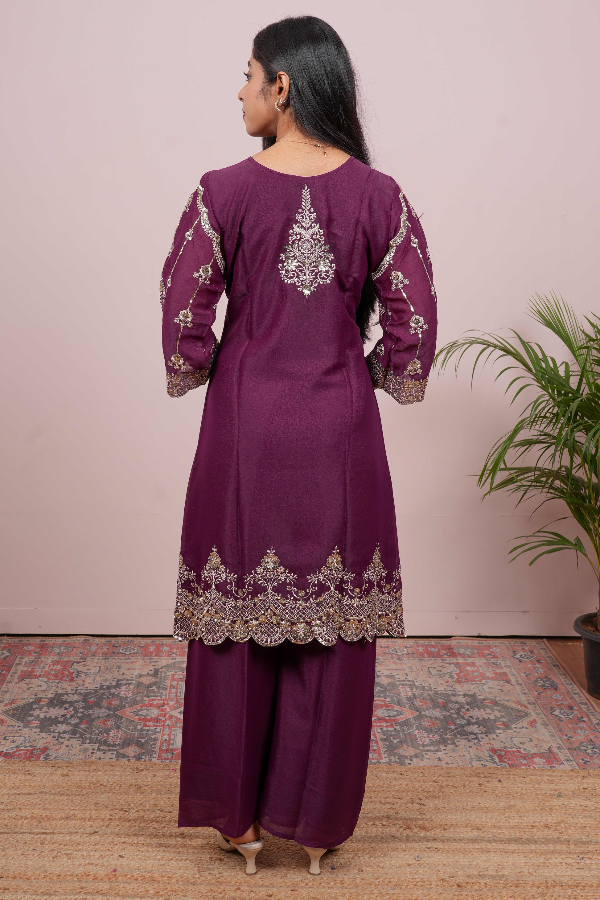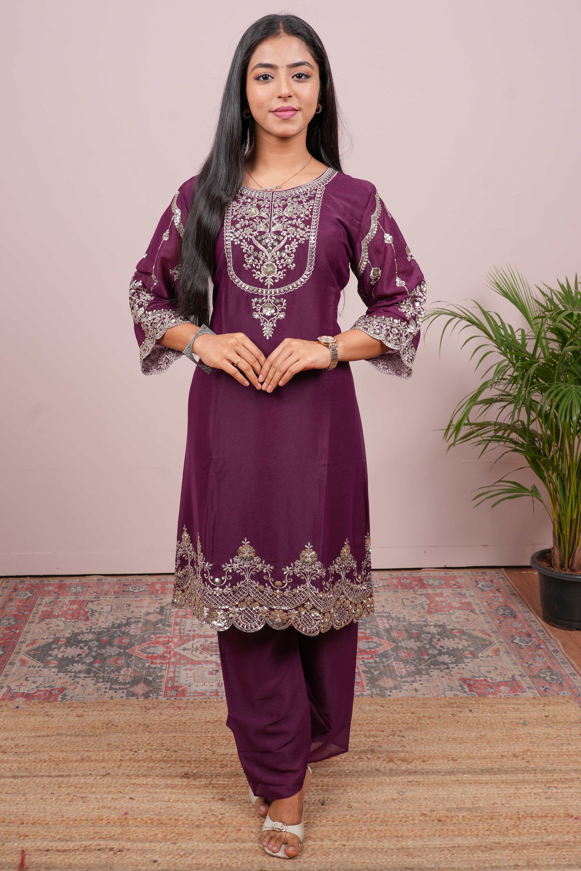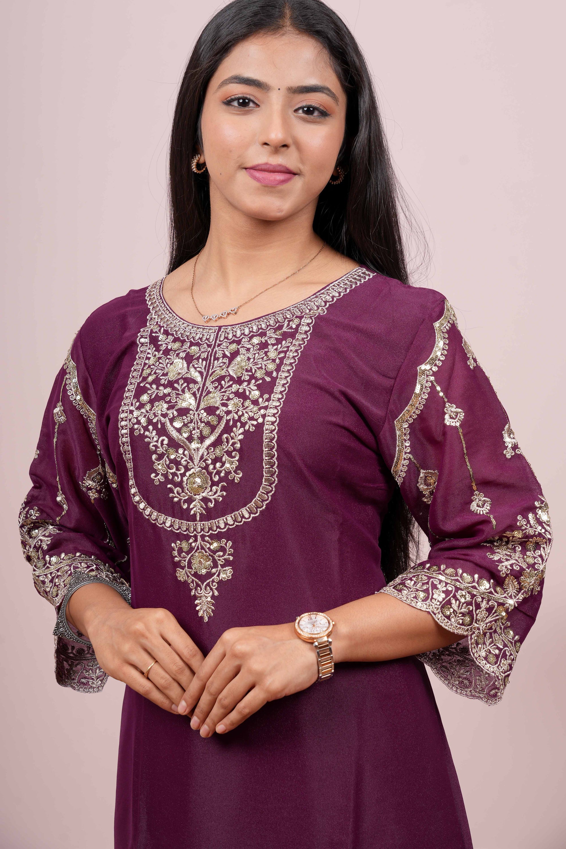 Wine Purple Straight - Cut Salwar Set Round Neck Line With a U-shape Gold Zari Embroidery, sequins & Matching Sheer Dupatta With Gold Zari Embroidery