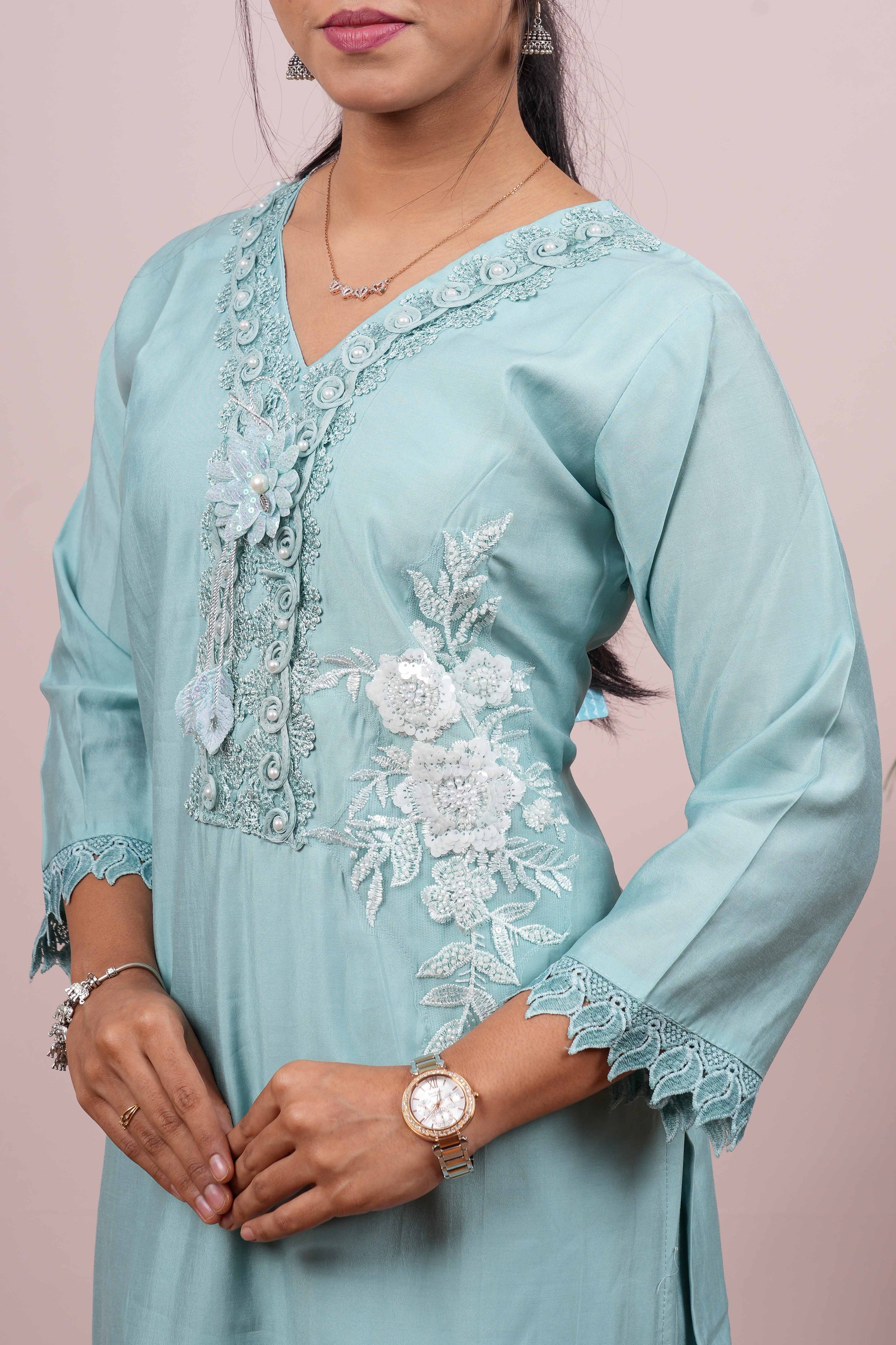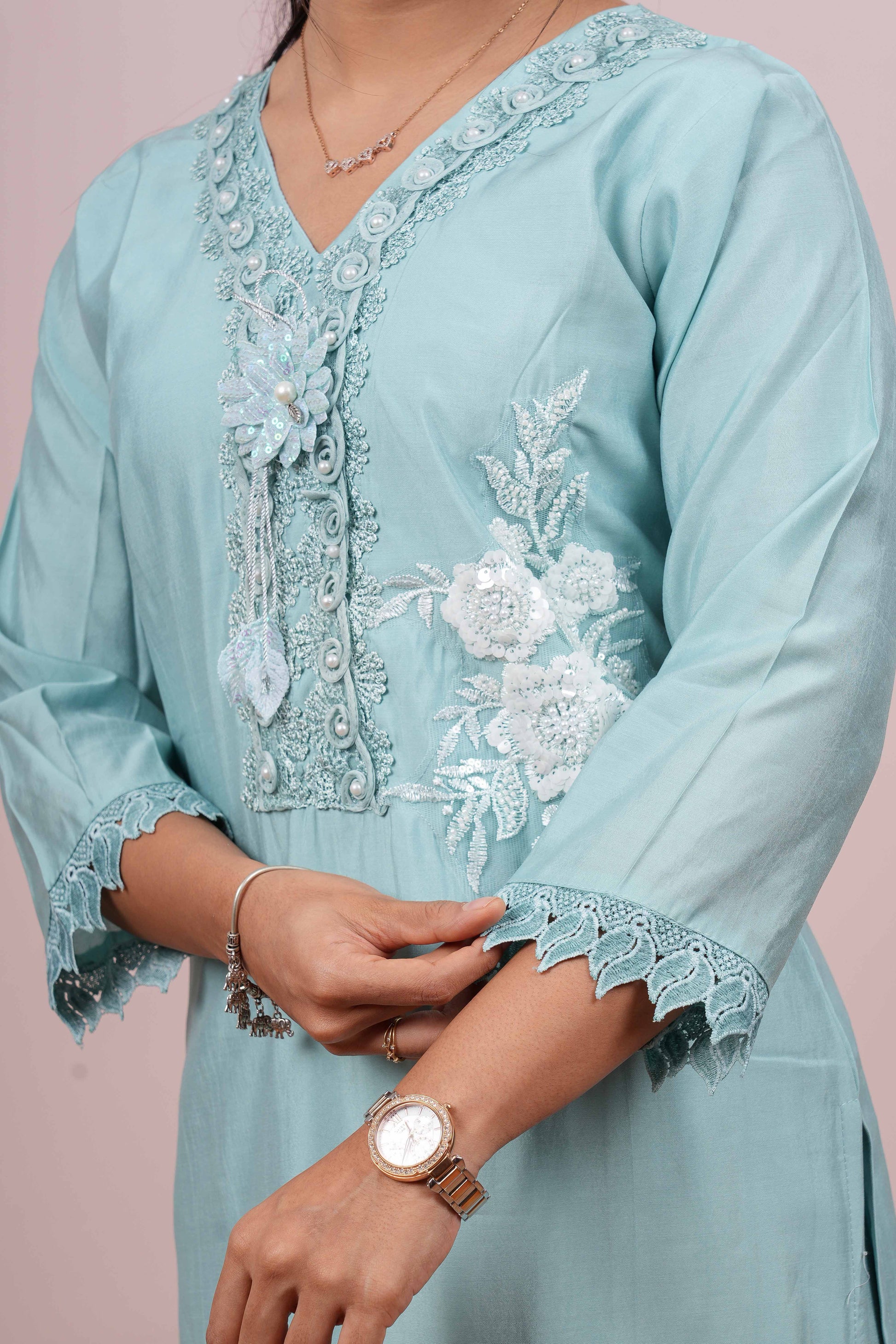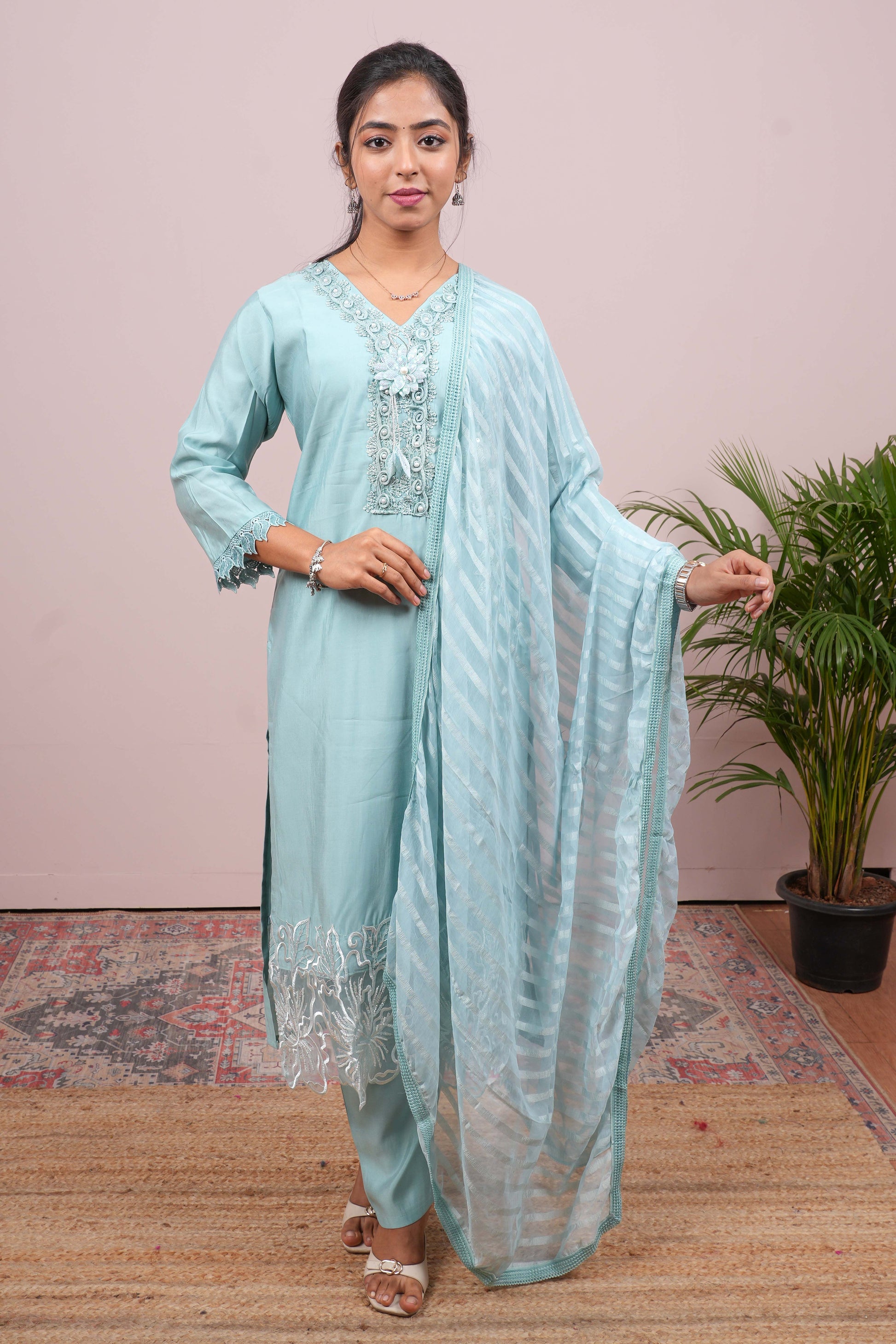 Pastel Blue Straight-Cut Salwar Set V-Neck With Intricate Embroidery and 3D Floral Applique Work Along The Neckline & Lightweight Matching Dupatta