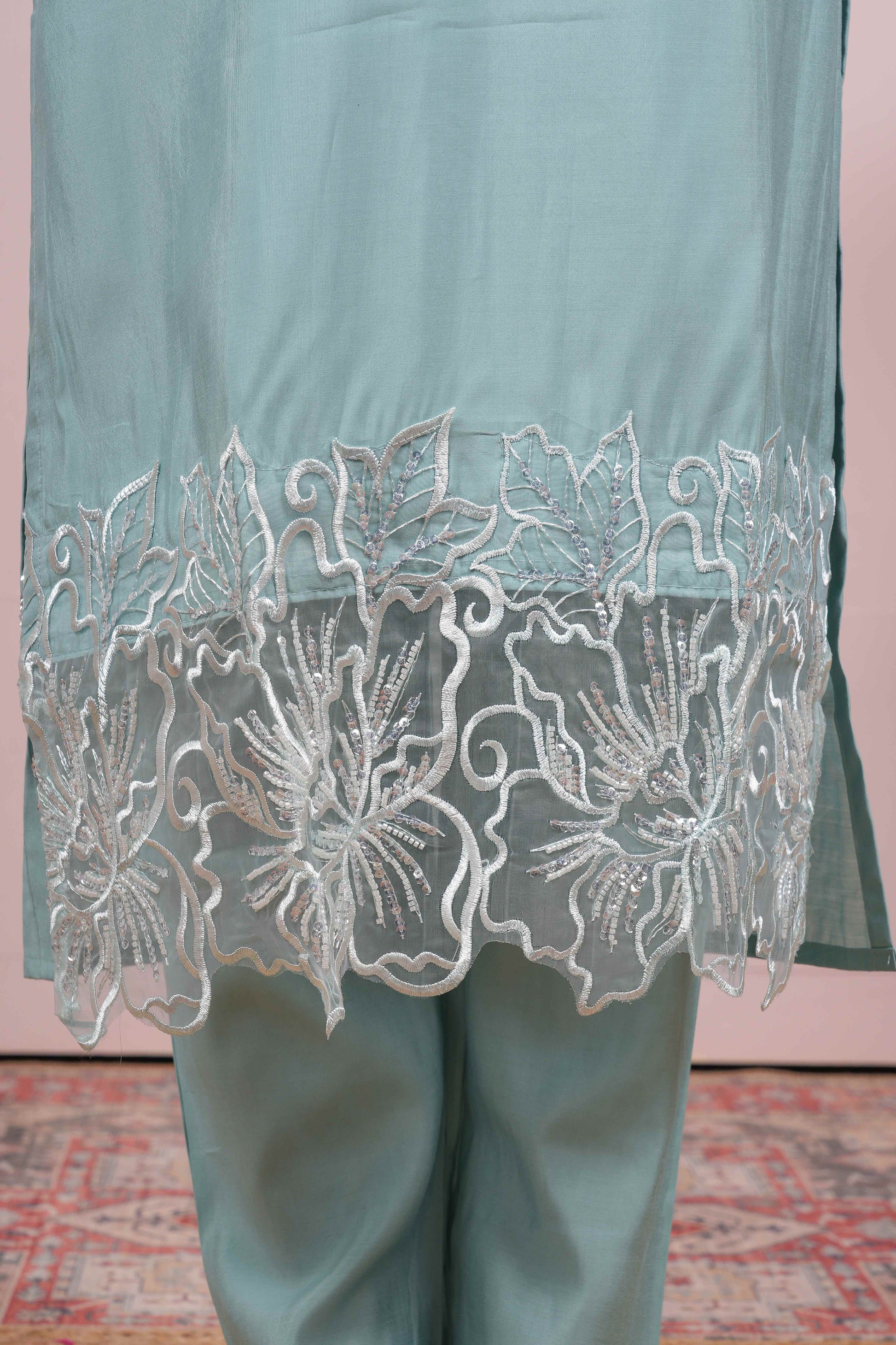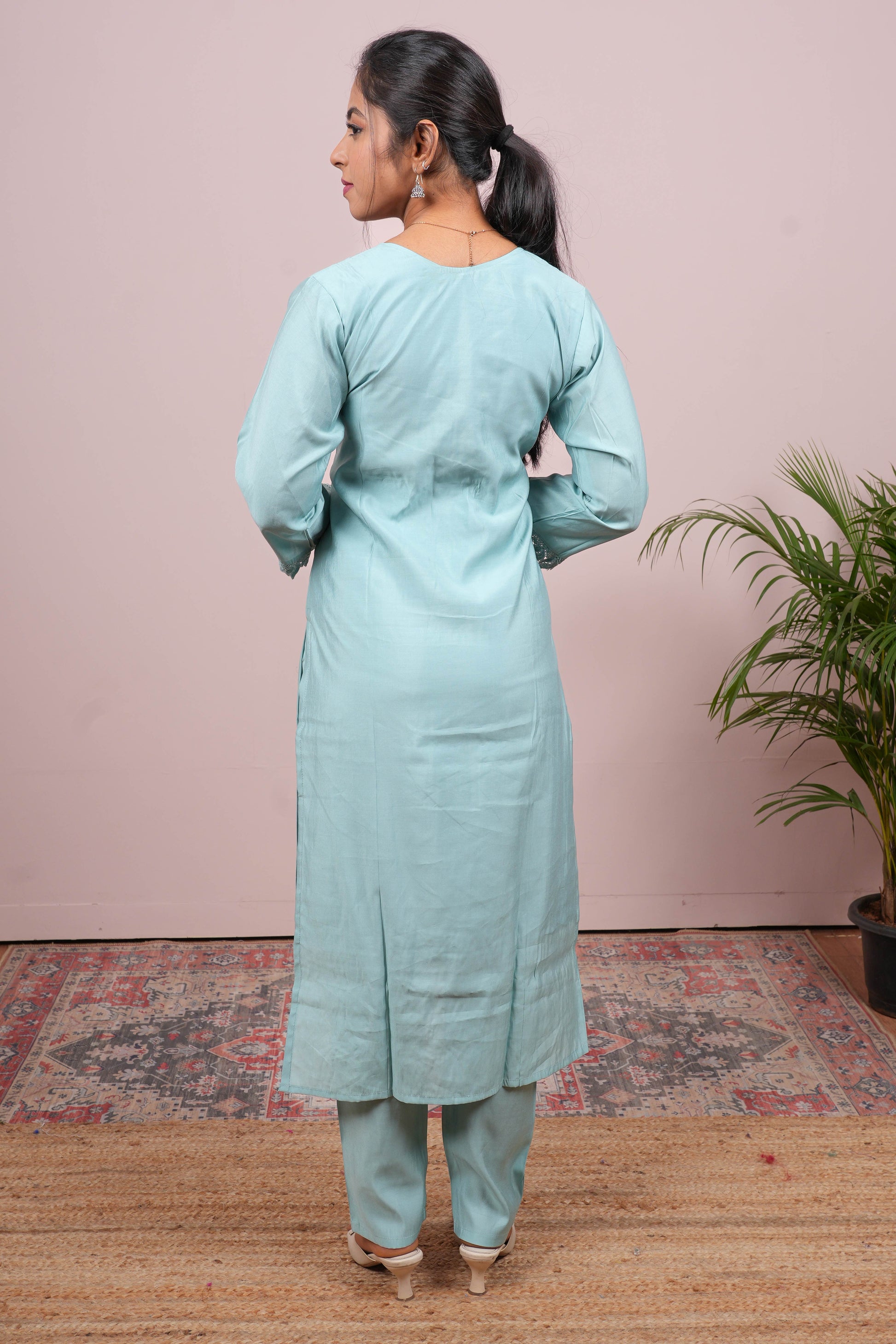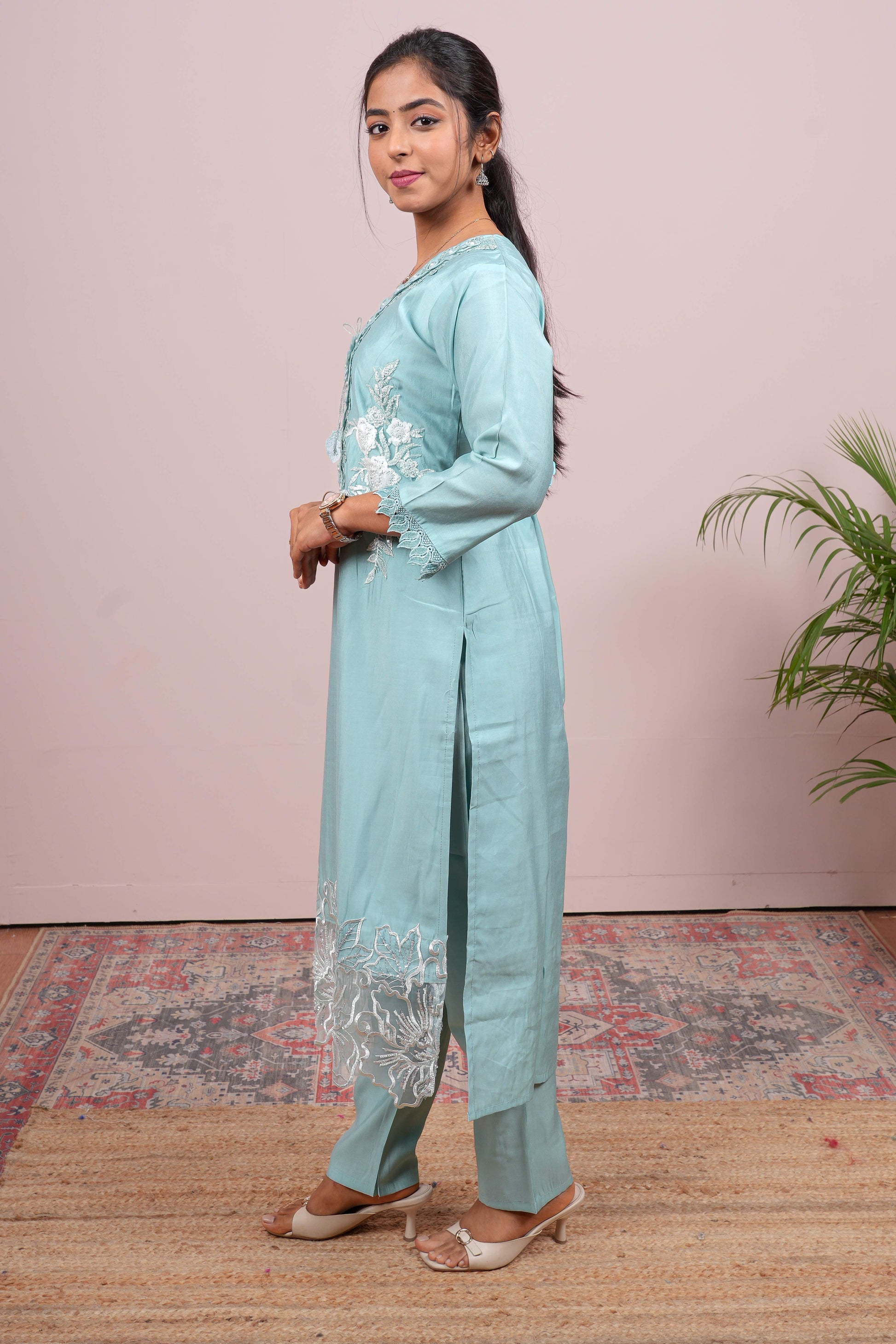 Pastel Blue Straight-Cut Salwar Set V-Neck With Intricate Embroidery and 3D Floral Applique Work Along The Neckline & Lightweight Matching Dupatta