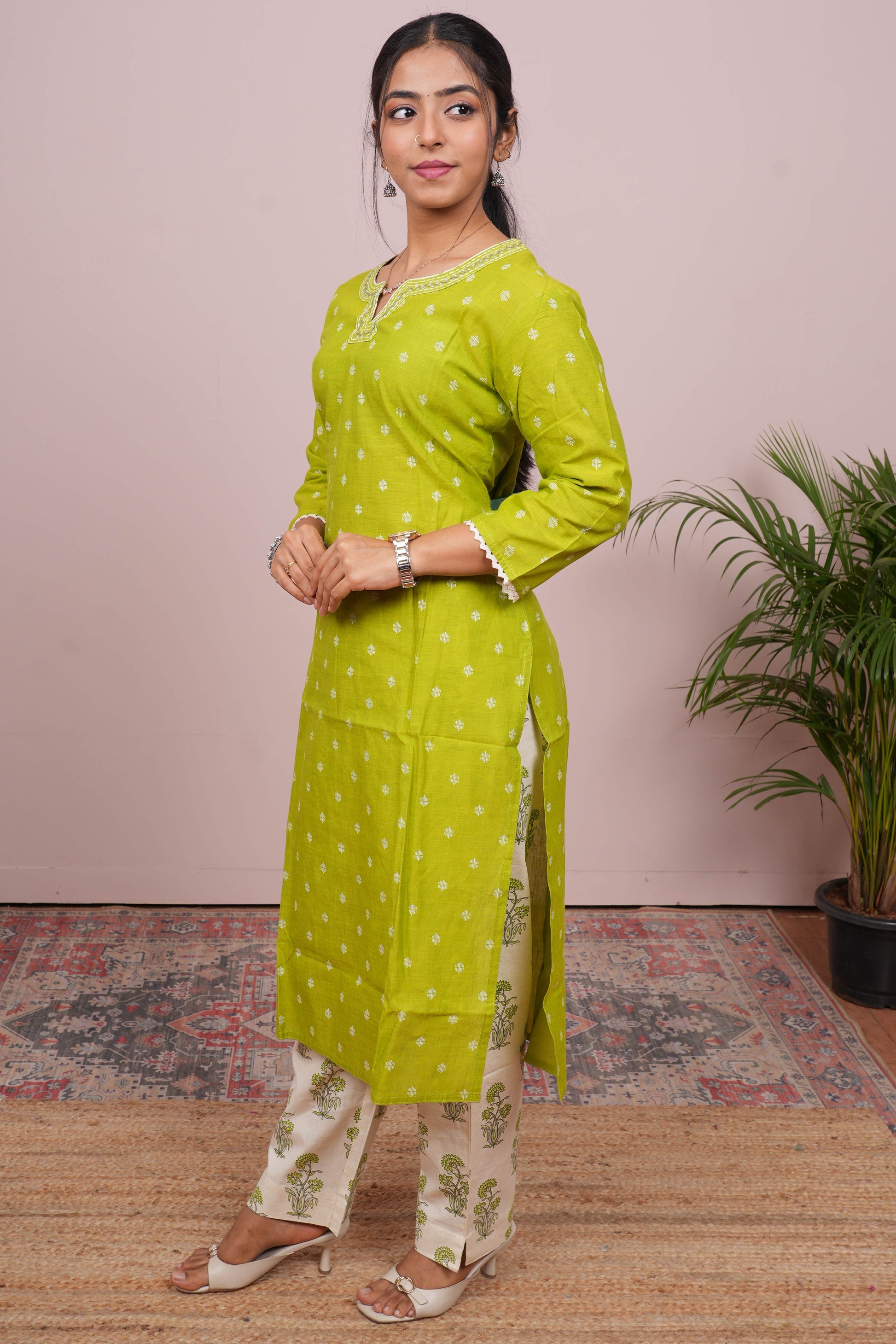 Green Salwar Set. Round V-Cut Neck & Embroidery With Small White Butta
