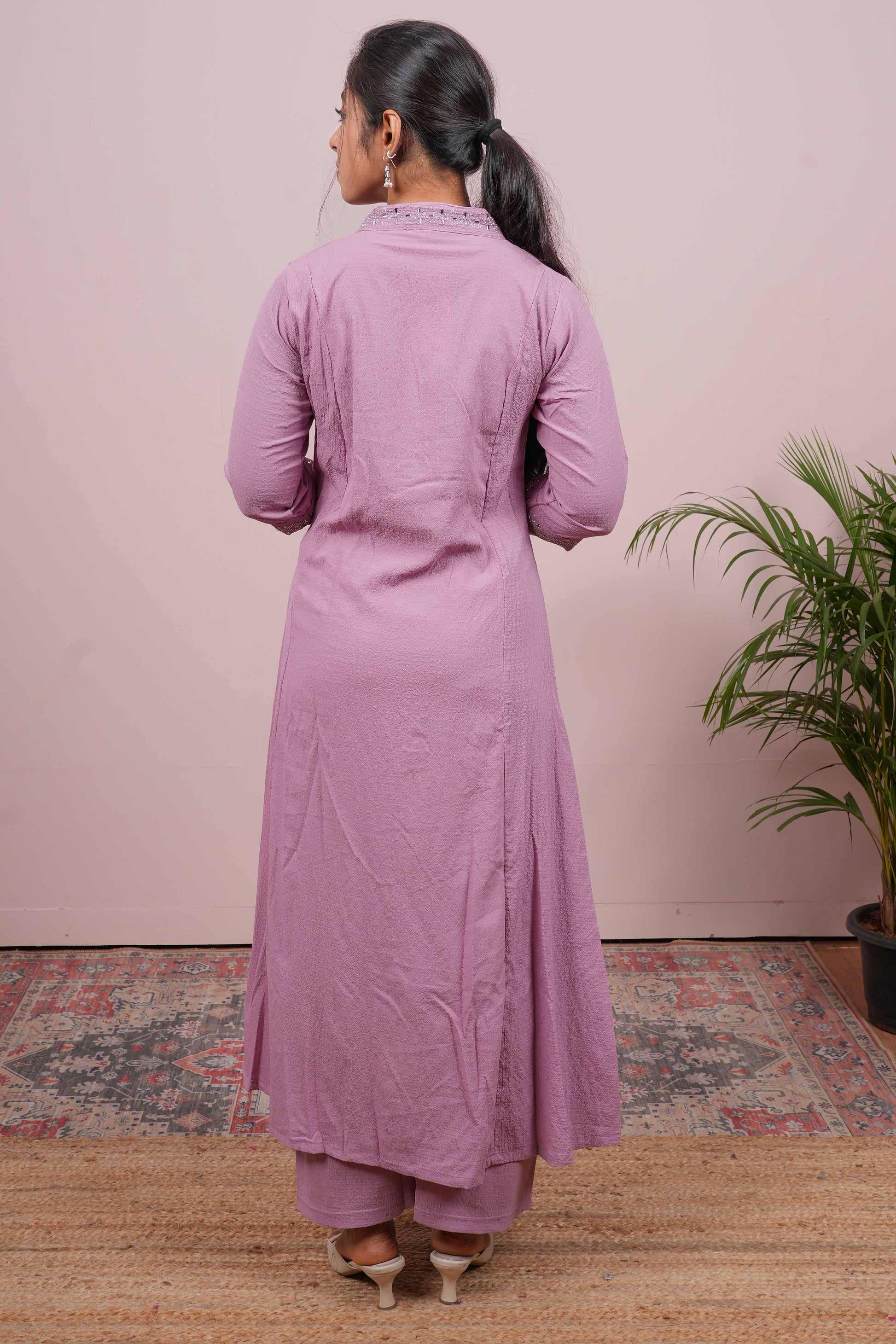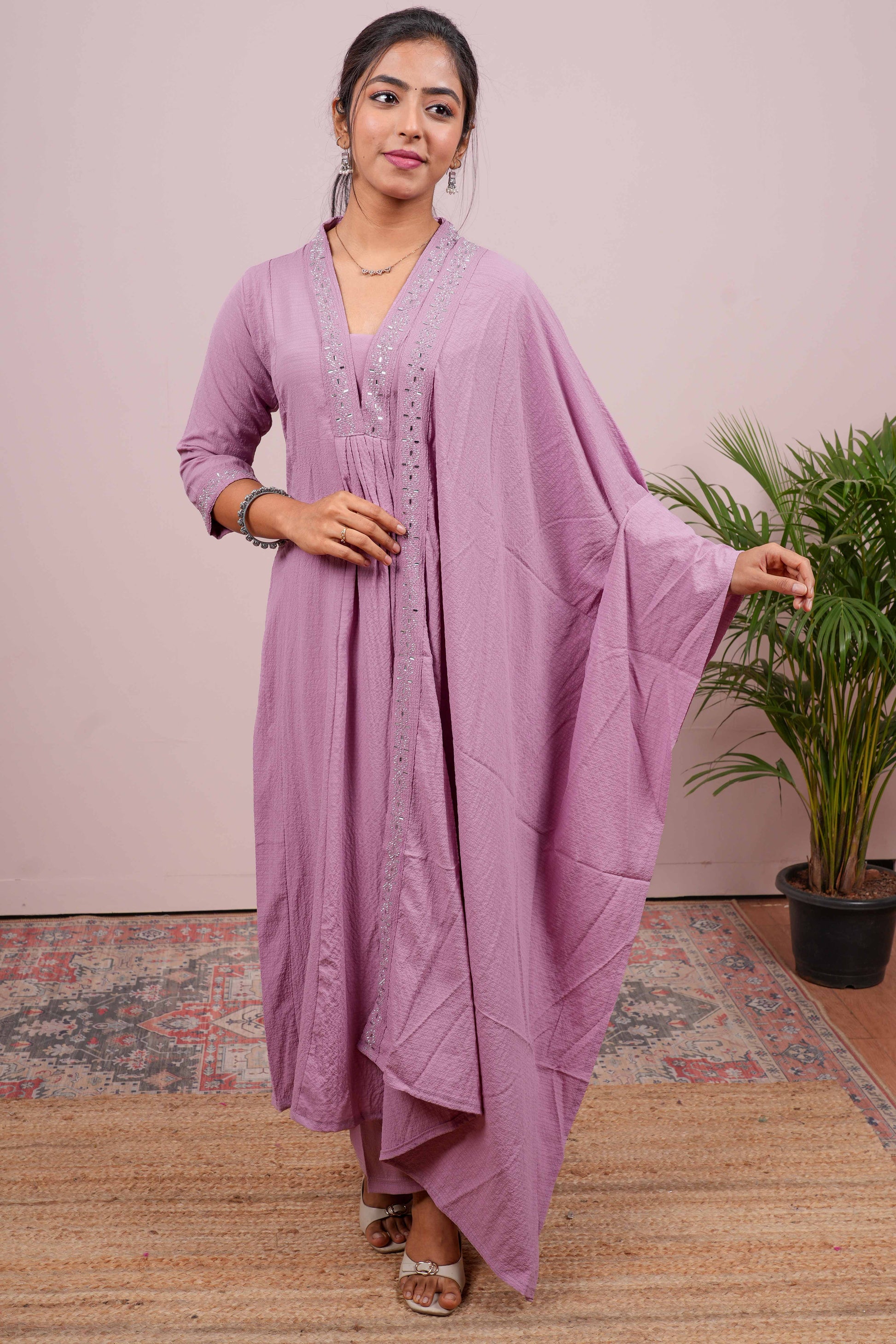 Lavender Salwar Set V-Neck & Detailing Mirror Work Along The Front Panel