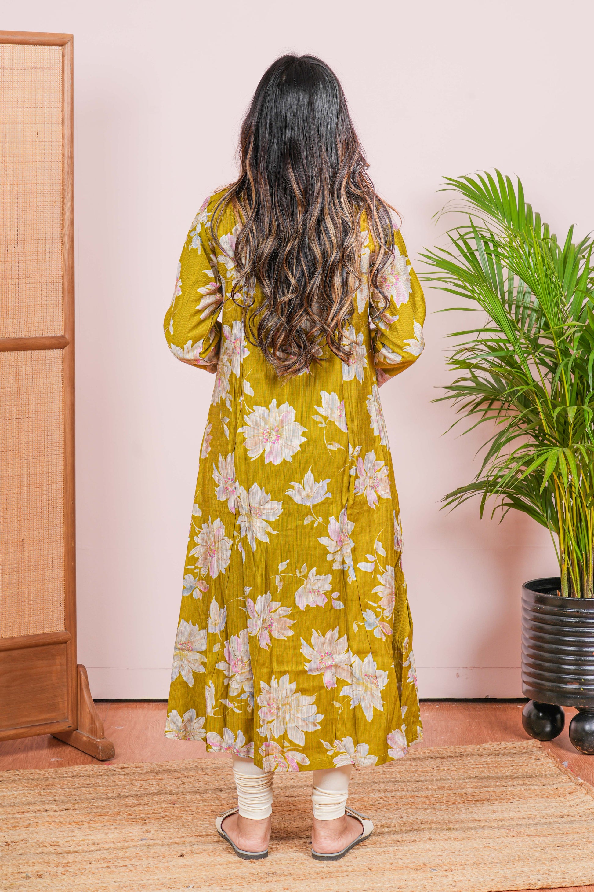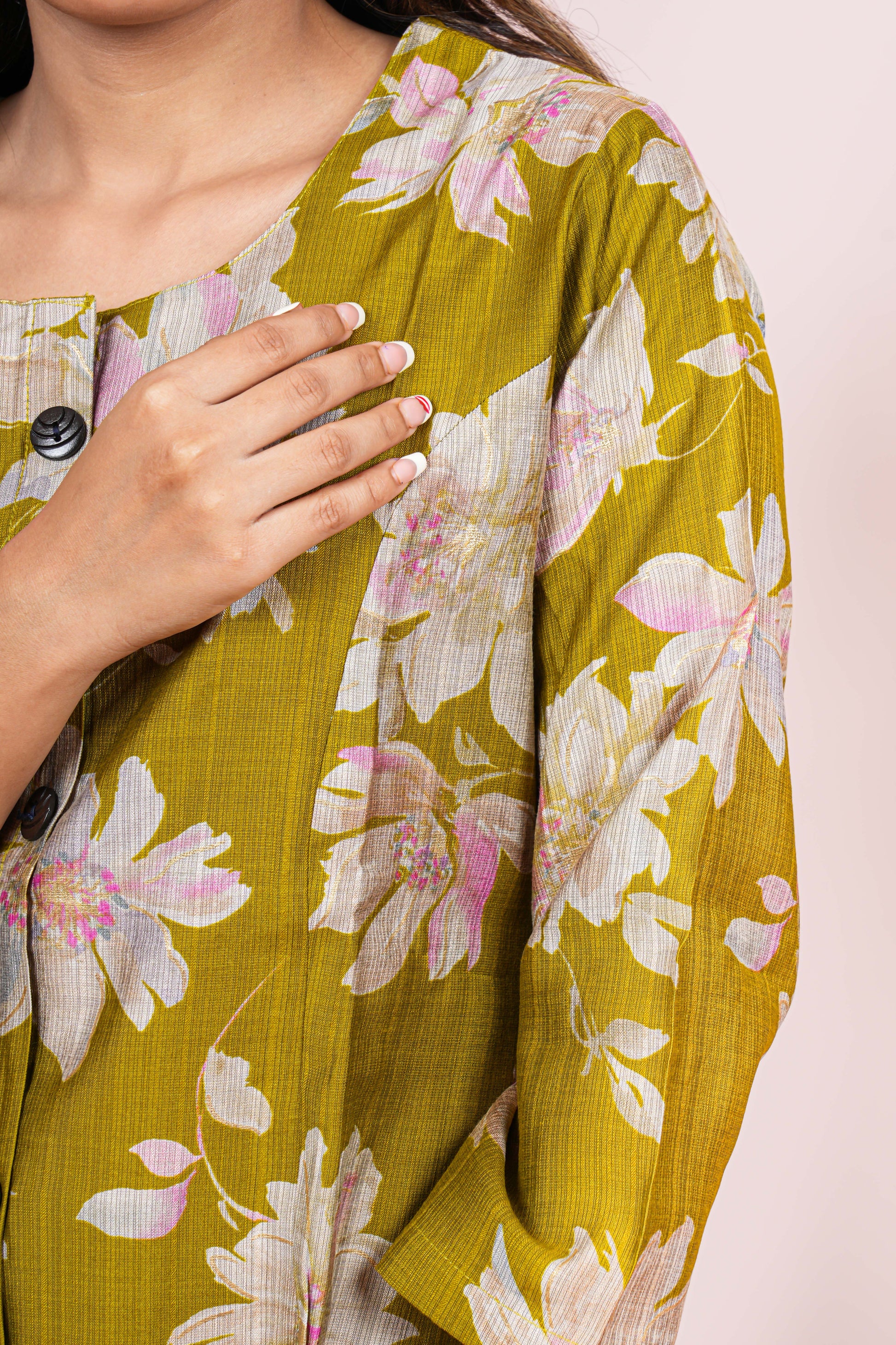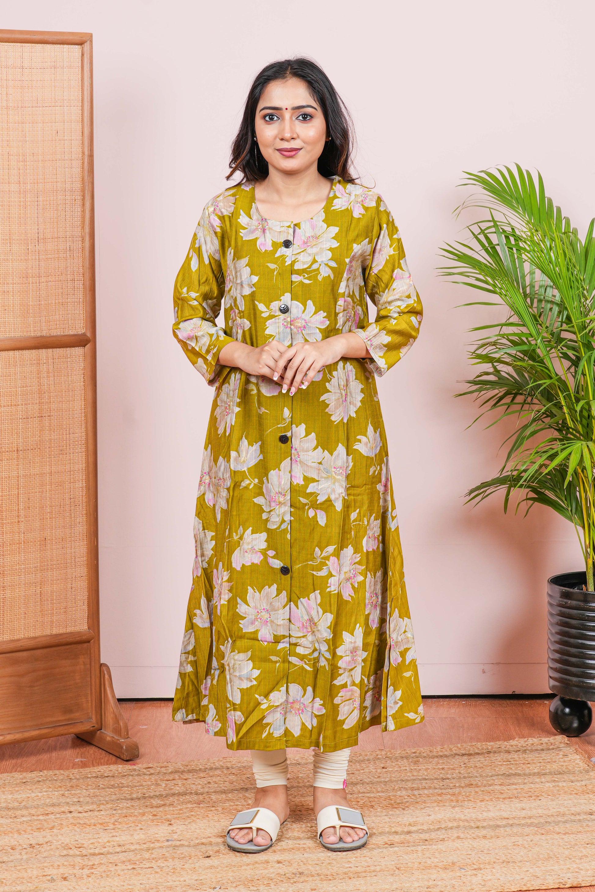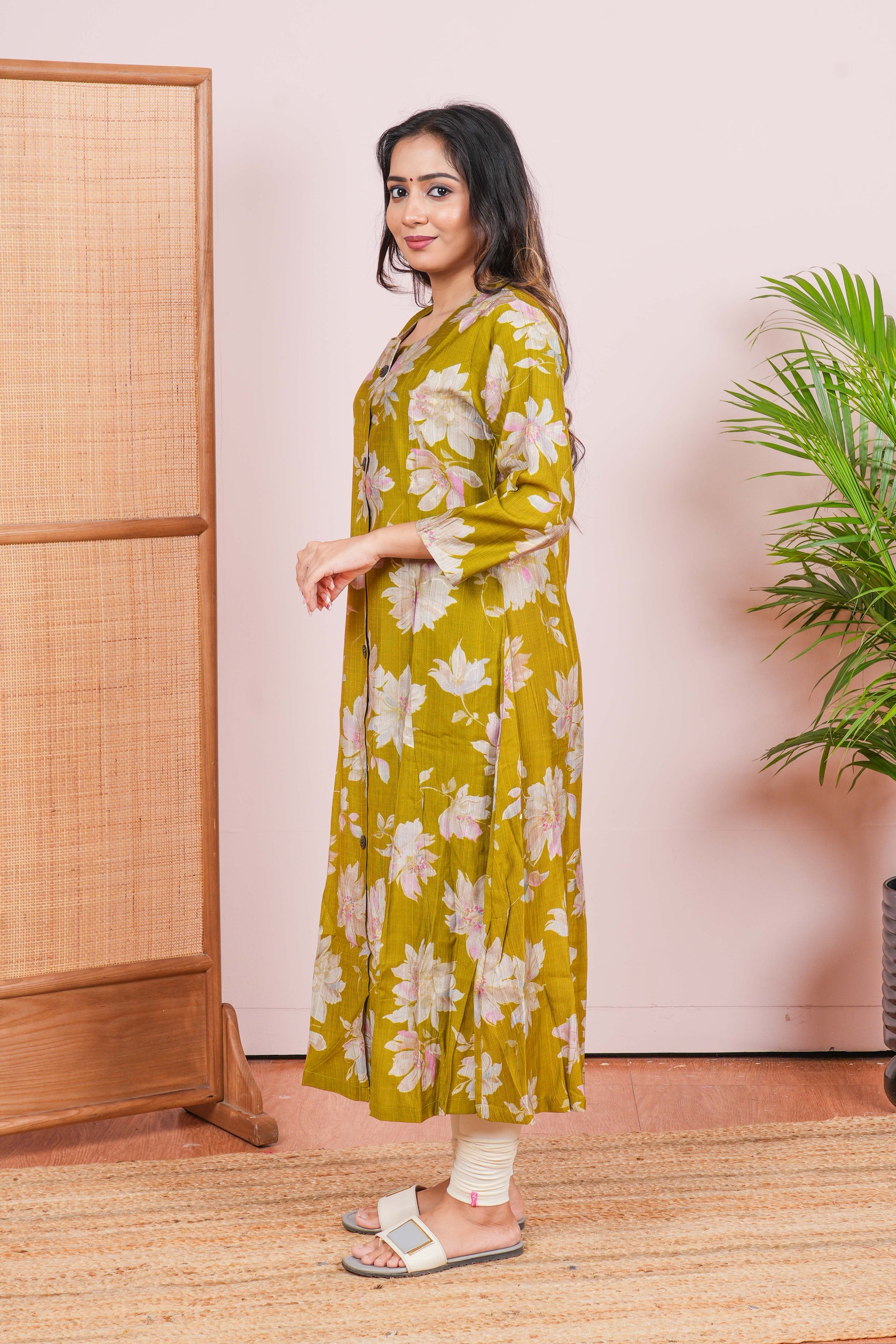 Olive Green A-line Kurti All- Over Floral Digital Print