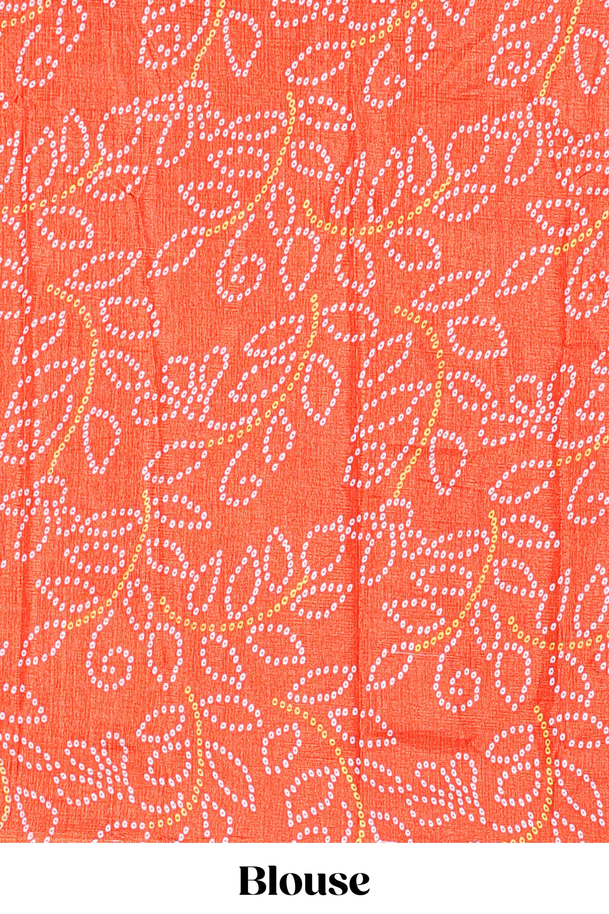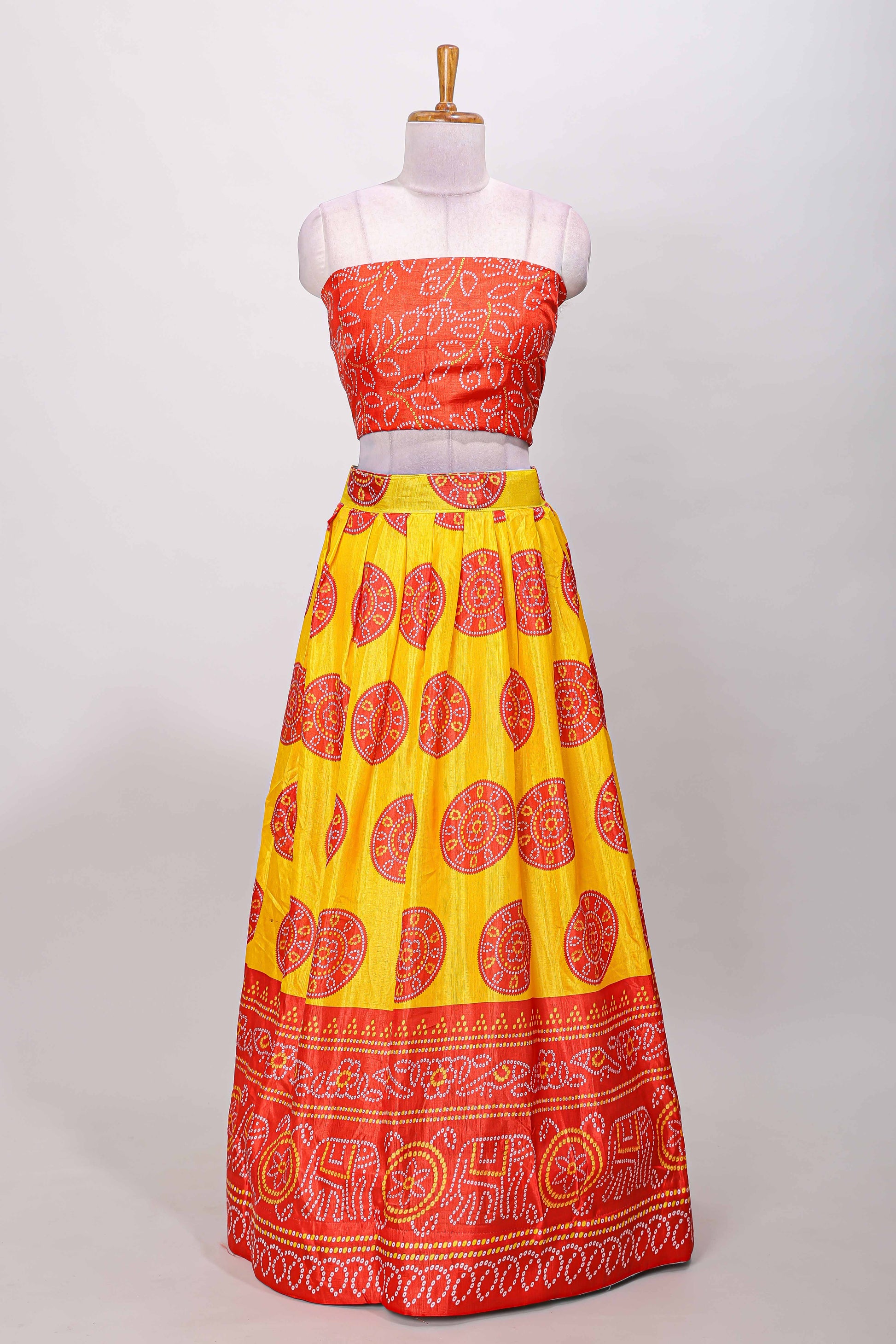 Yellow dola silk bhandani elephant and floral printed lehenga with contrast blouse and dhavani